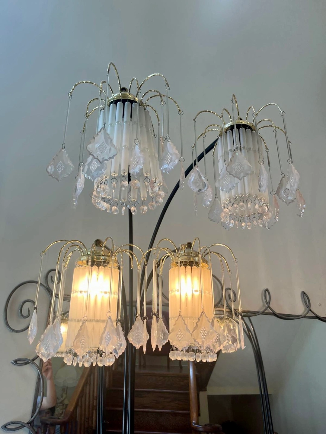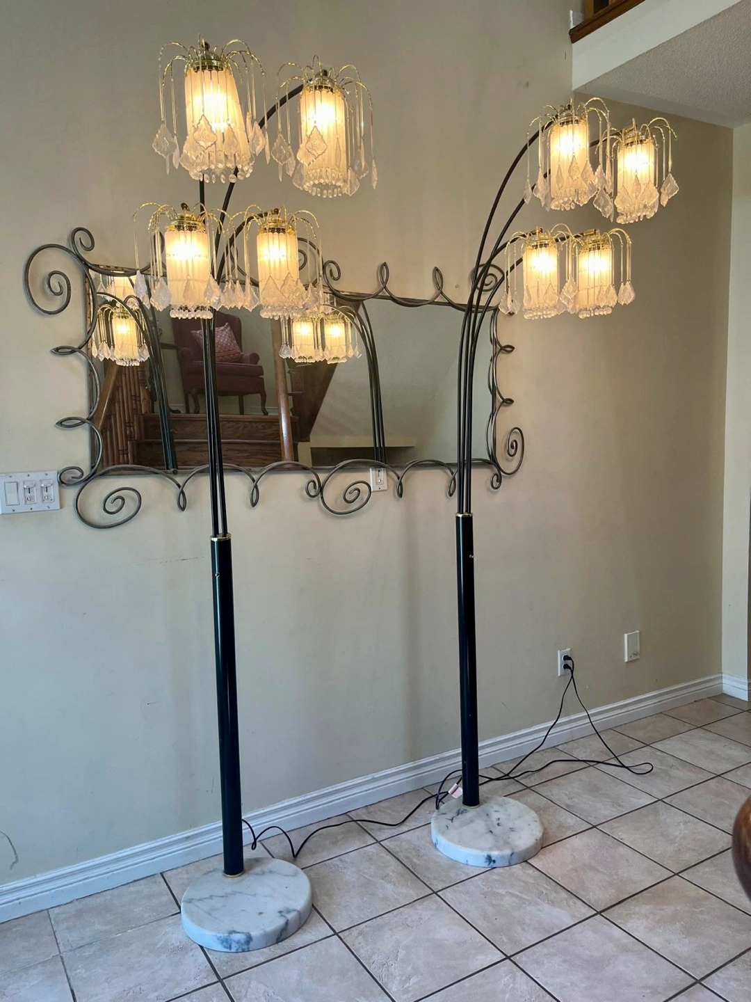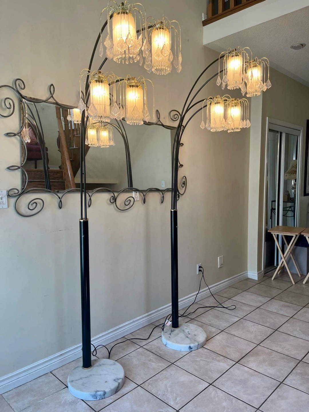 40Two matching floor lamps. Features a curved black metal frame, marble bases, and multiple frosted glass shades adorned with crystal accents. Elegant and stylish.
