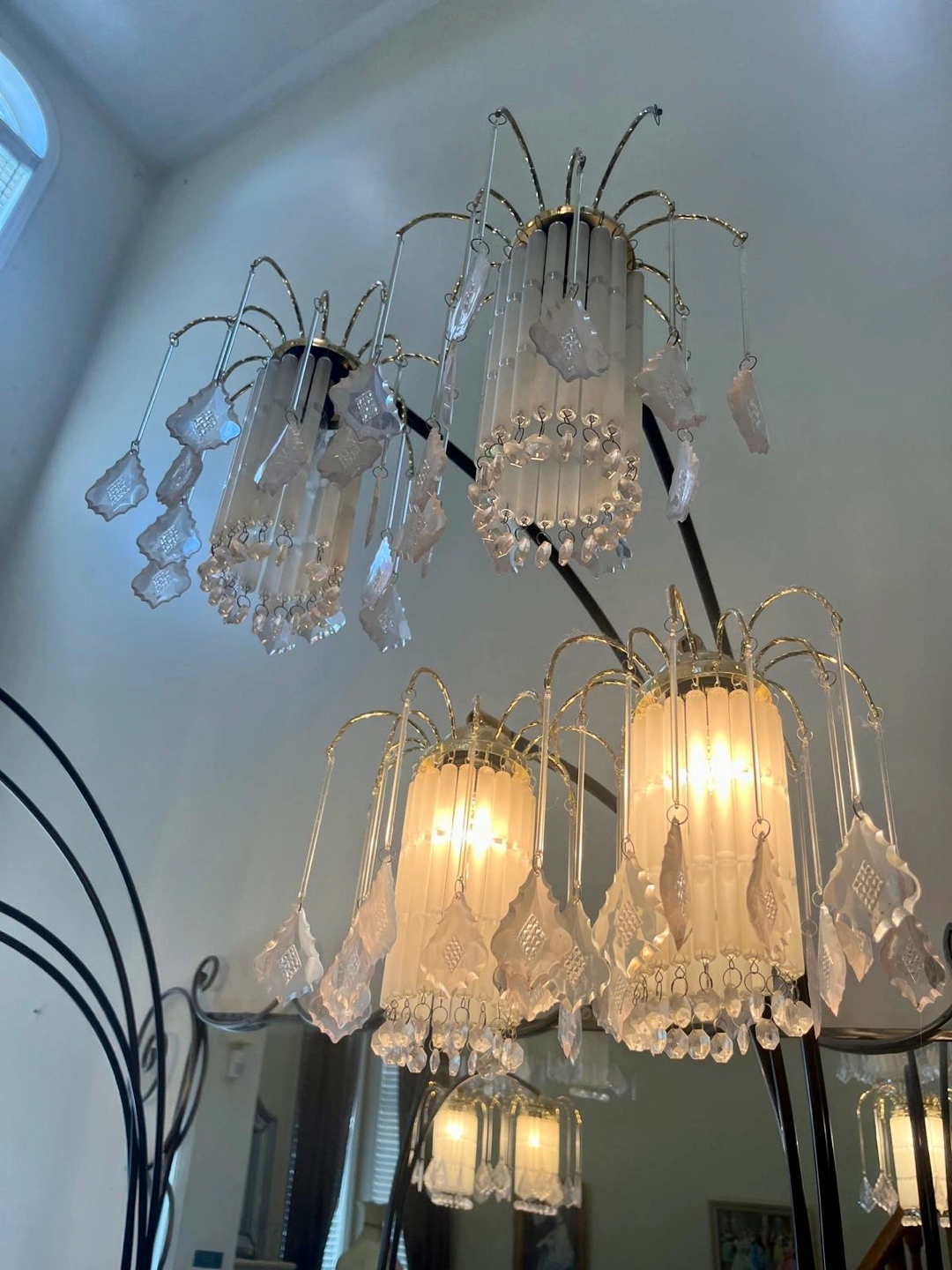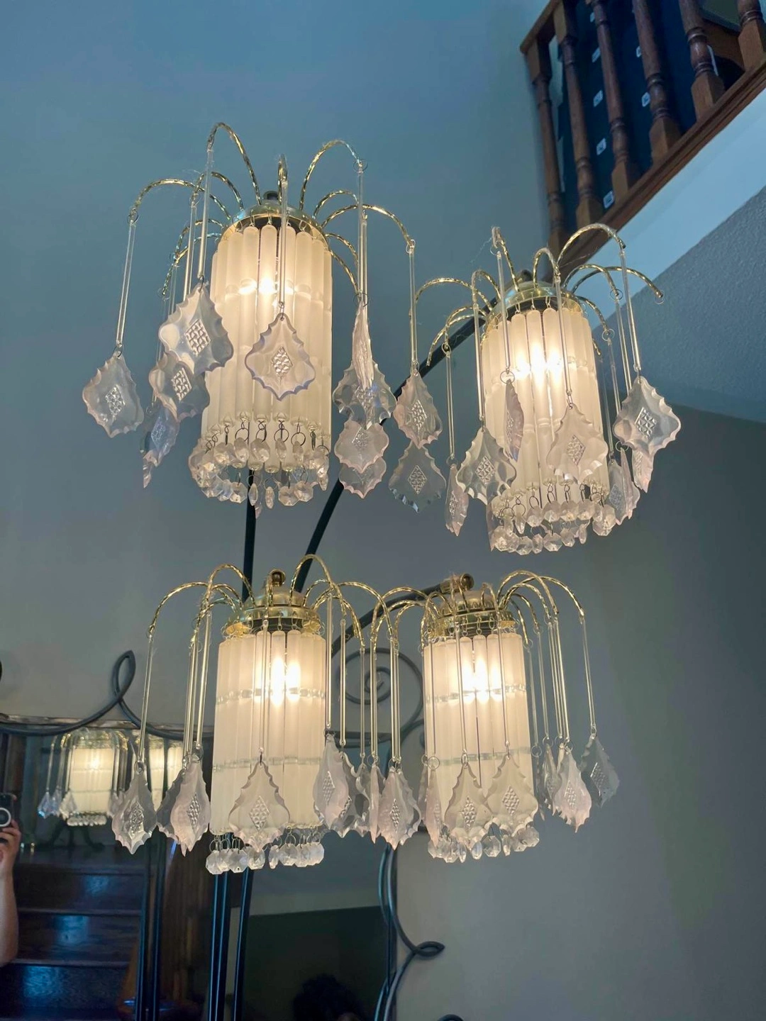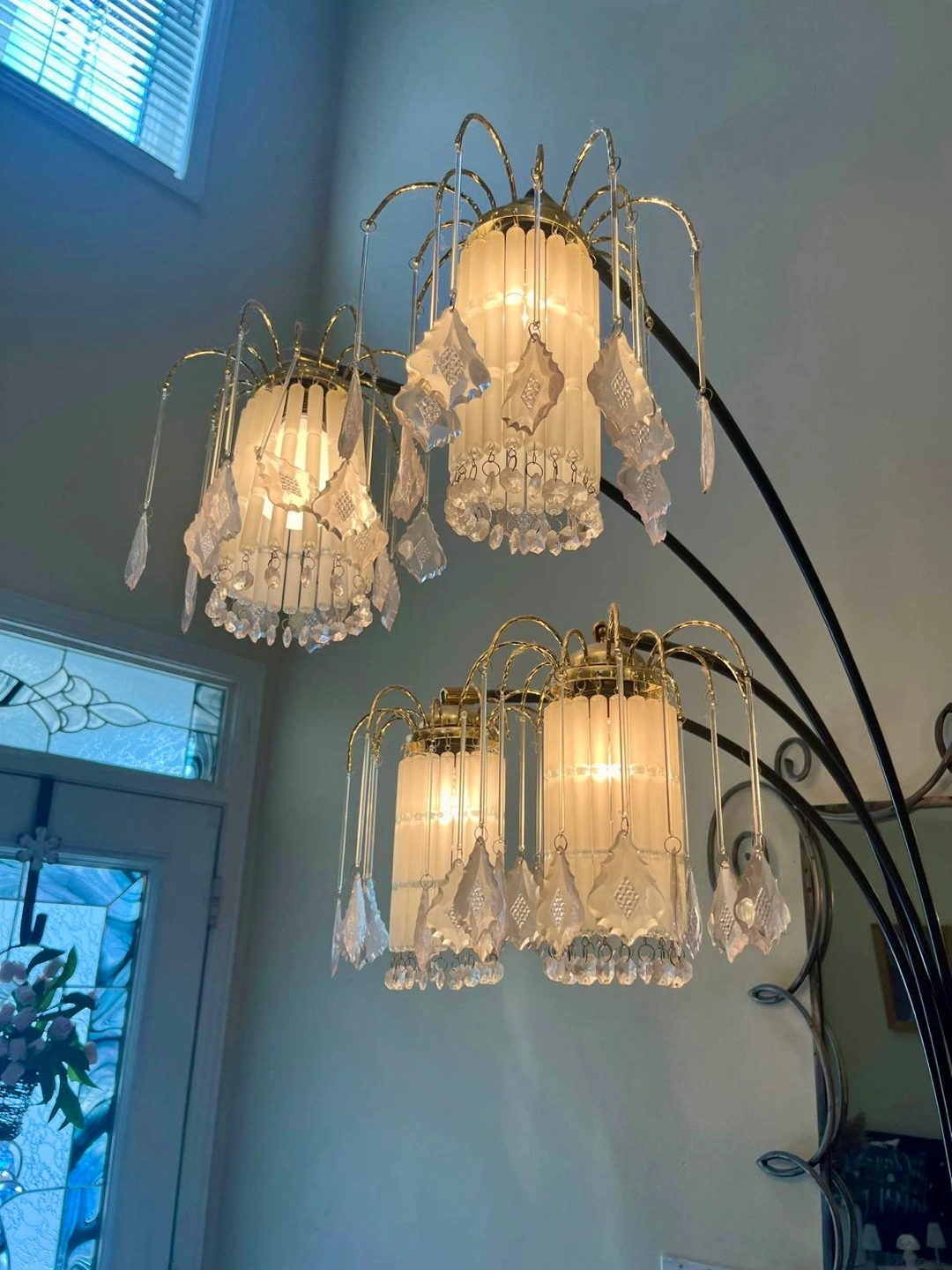 40Two matching floor lamps. Features a curved black metal frame, marble bases, and multiple frosted glass shades adorned with crystal accents. Elegant and stylish.