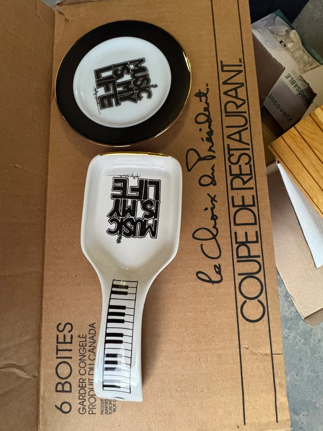 121Elegant serving set, features a small plate and spoon rest. Both pieces are white with black and gold accents. Music themed design. Piano keys on spoon rest.