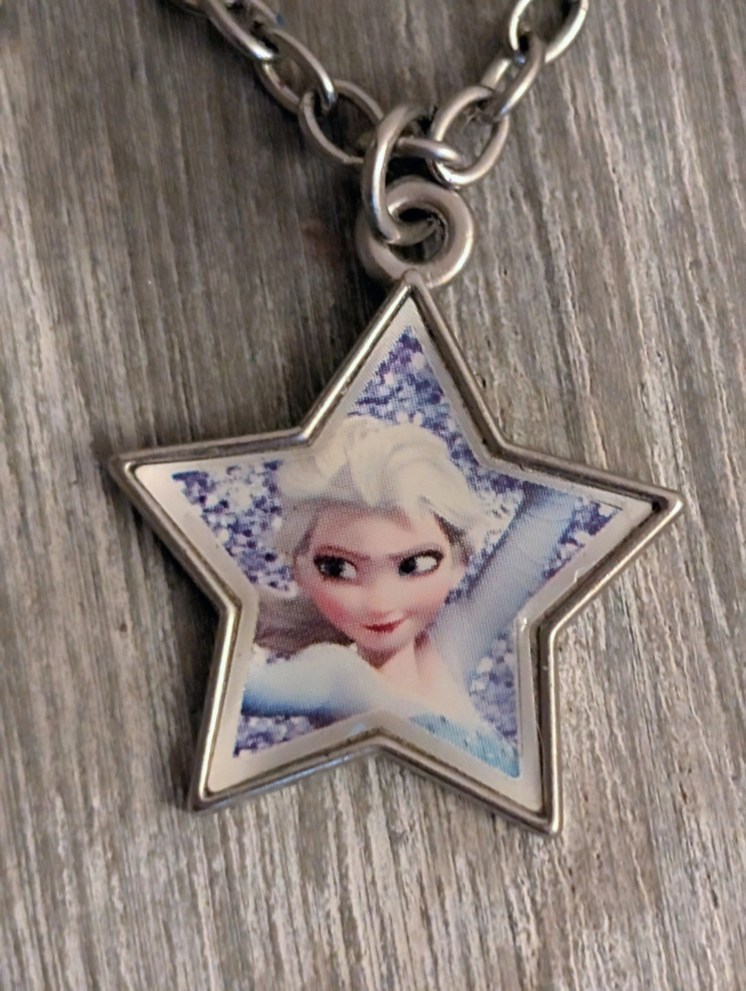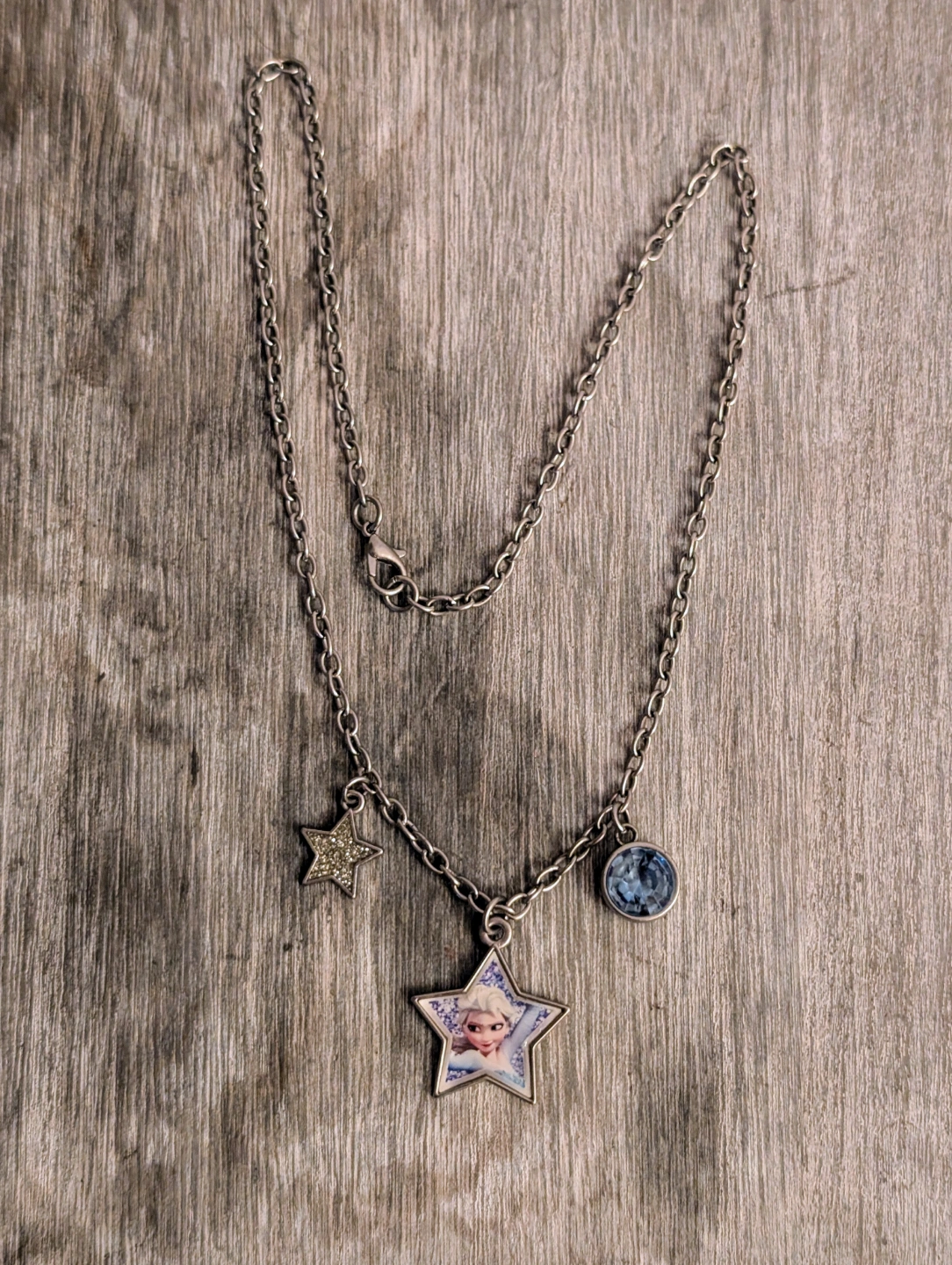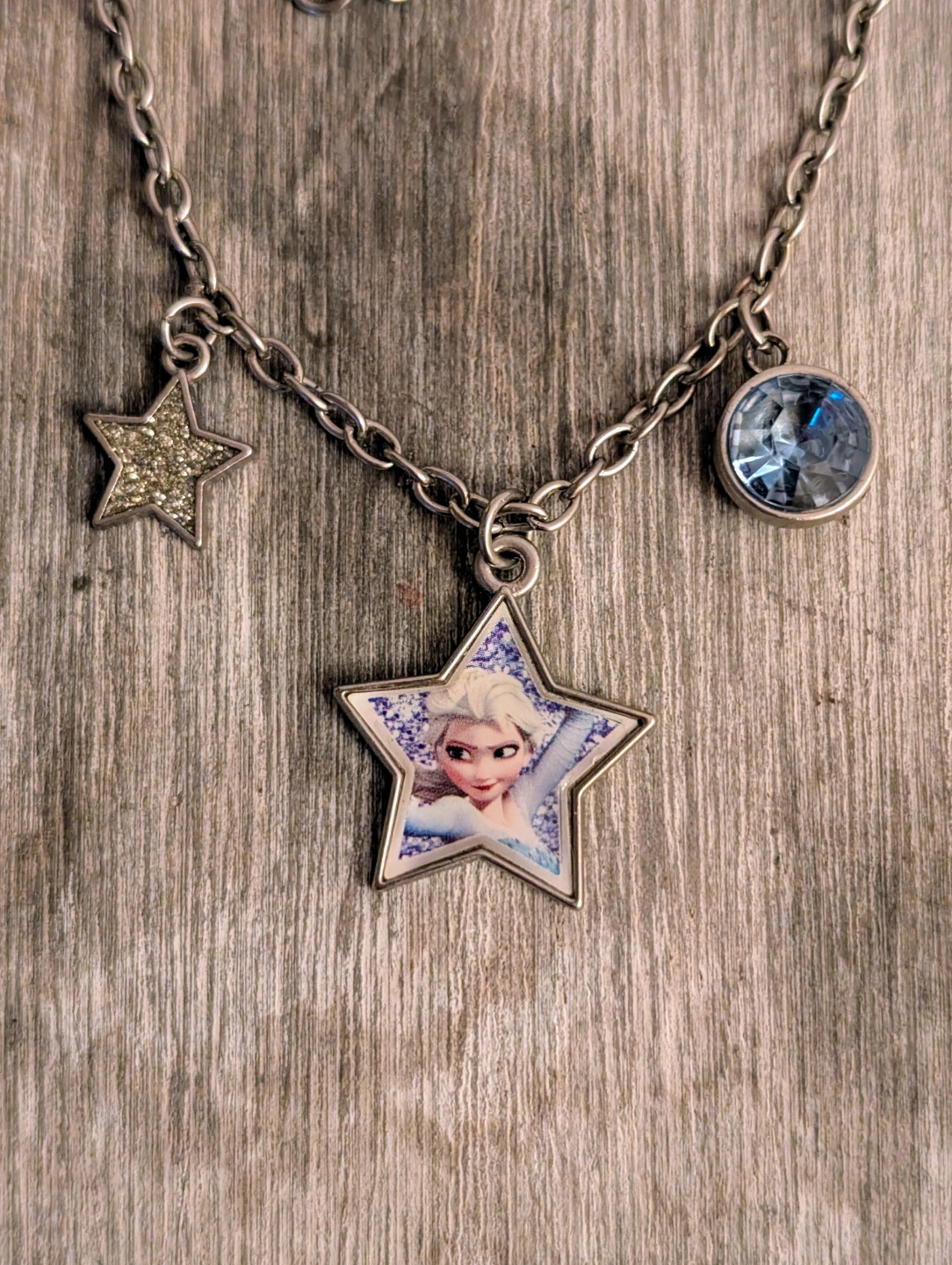 Silver chain necklace. Features a star charm with Elsa image, glitter star, and blue shining stone