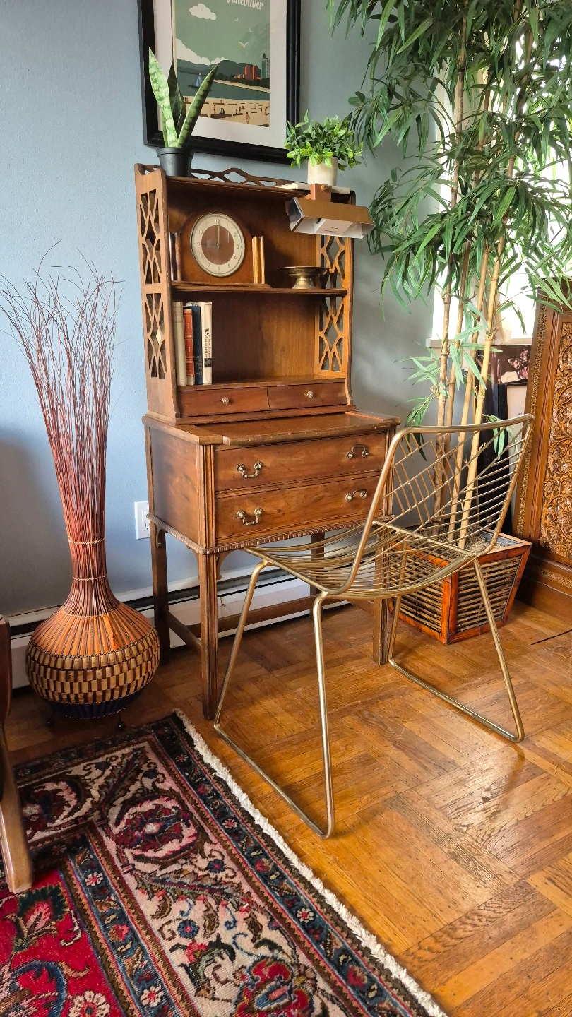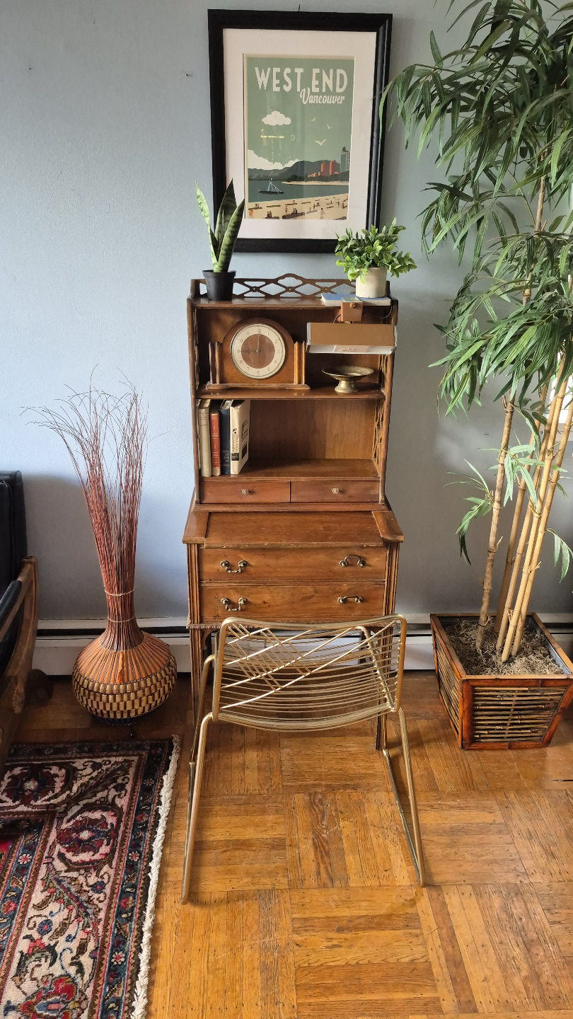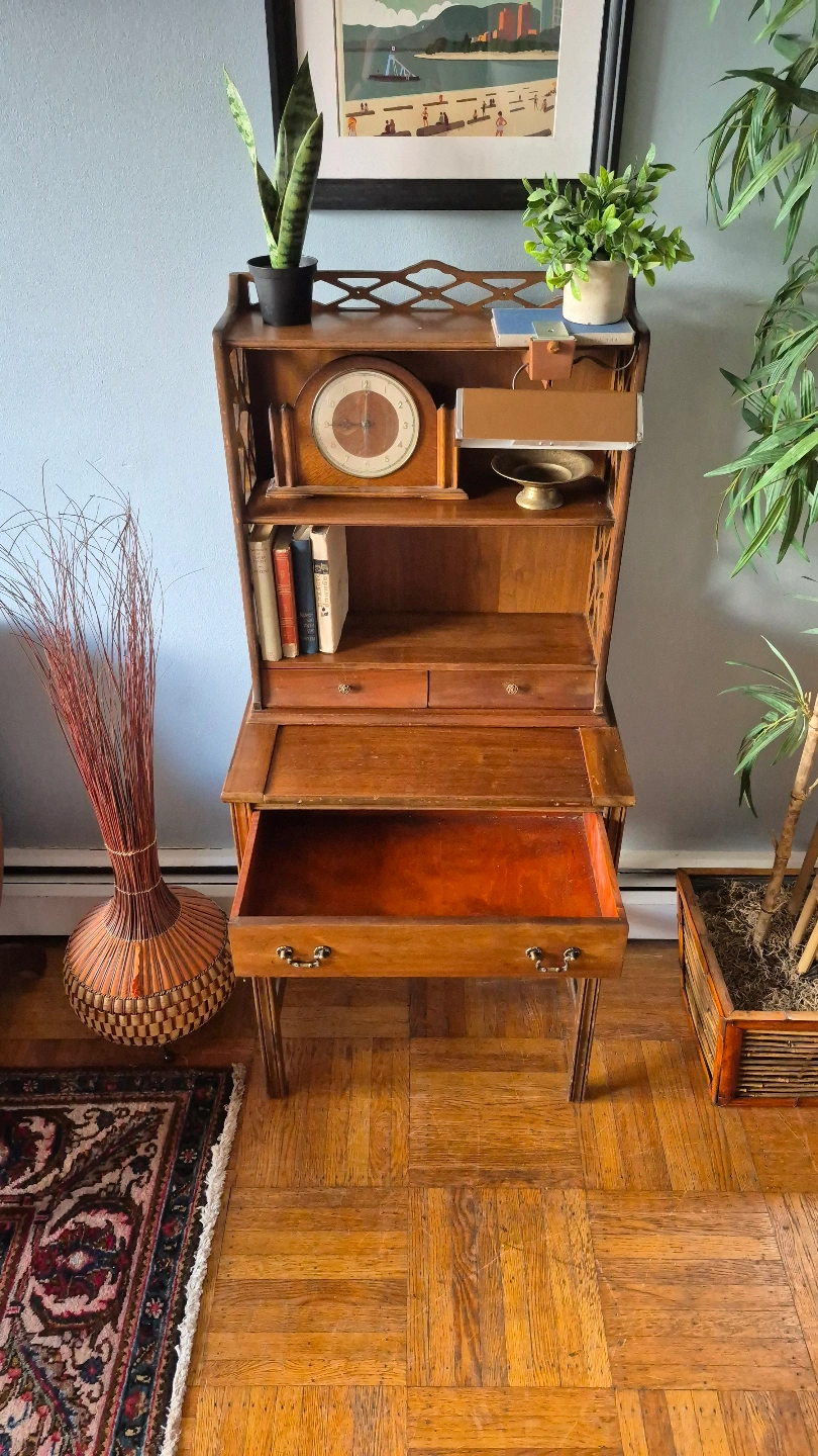 Vintage wooden secretary desk. Features a pull out writing surface, drawers, and open shelving. Ideal for home office or study.