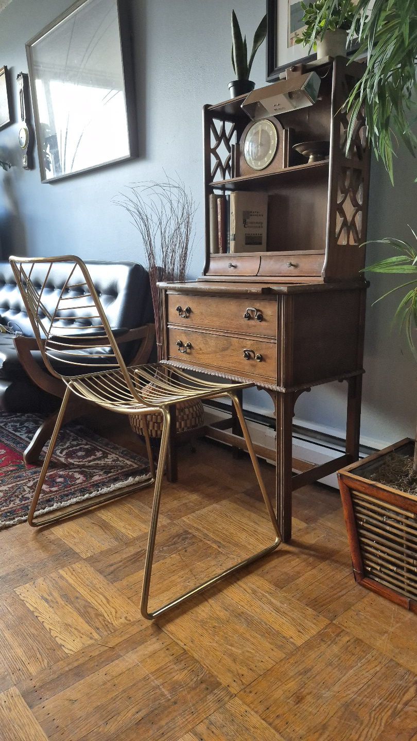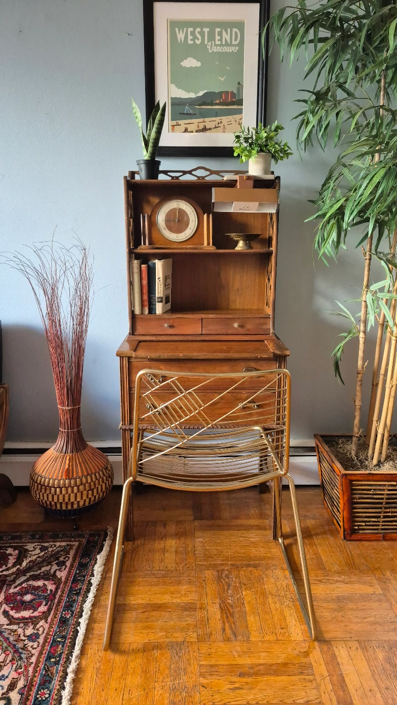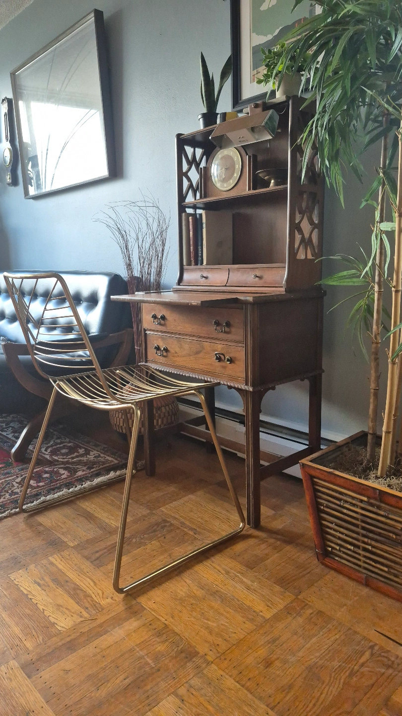 Vintage wooden secretary desk. Features a pull out writing surface, drawers, and open shelving. Ideal for home office or study.