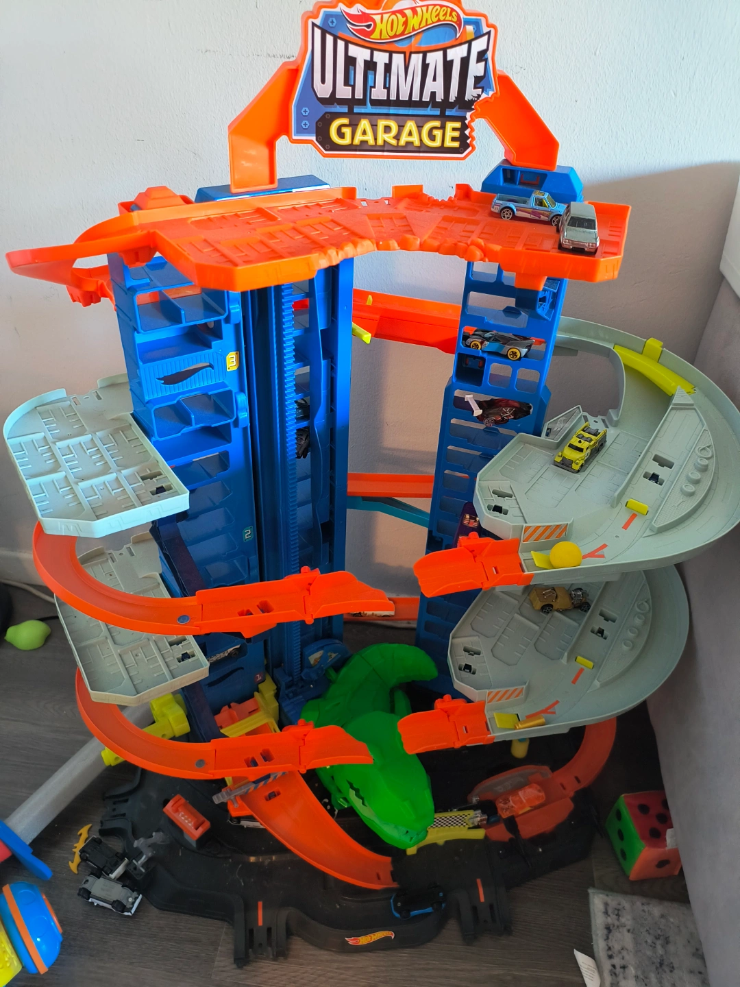 Multi-level parking garage. Includes ramps, loops, and multiple parking spaces. Great for imaginative play.