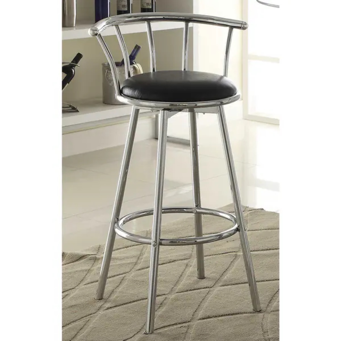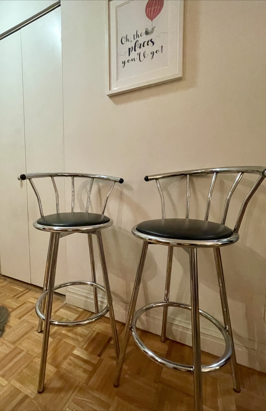 Set of two bar stools. Chrome metal frame. Black cushioned seats. Stylish and functional.