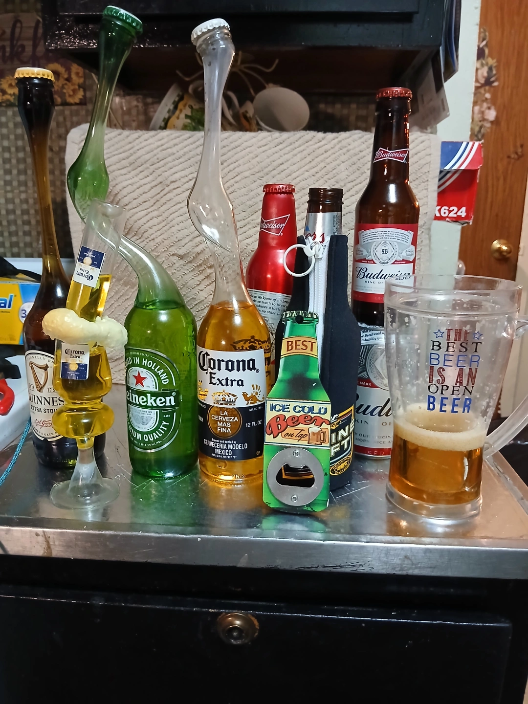 Unique collection of beer bottles, including Guinness, Heineken, Corona, and Budweiser. Also includes novelty beer bottle openers and a beer mug. Great for collectors or beer enthusiasts.