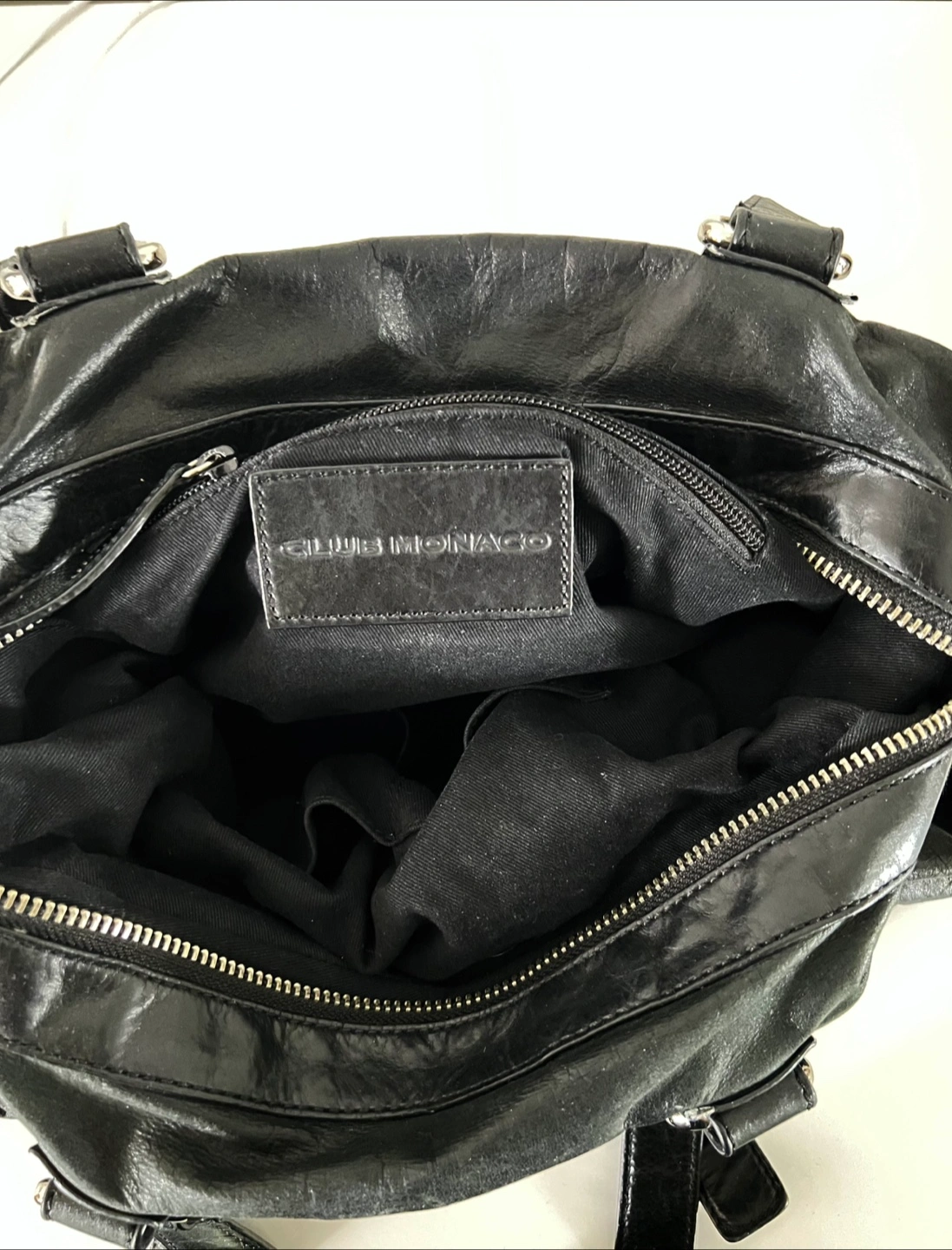 Black leather tote bag. Features a zip closure and two handles. Interior has a zip pocket. Great everyday bag.