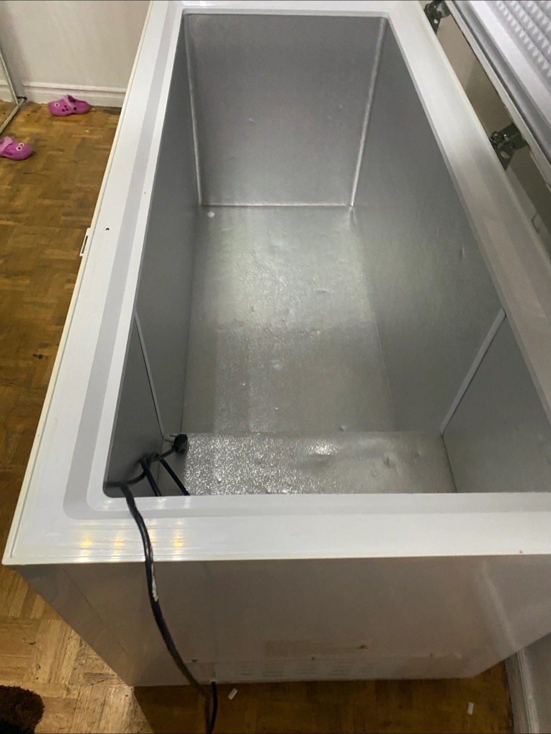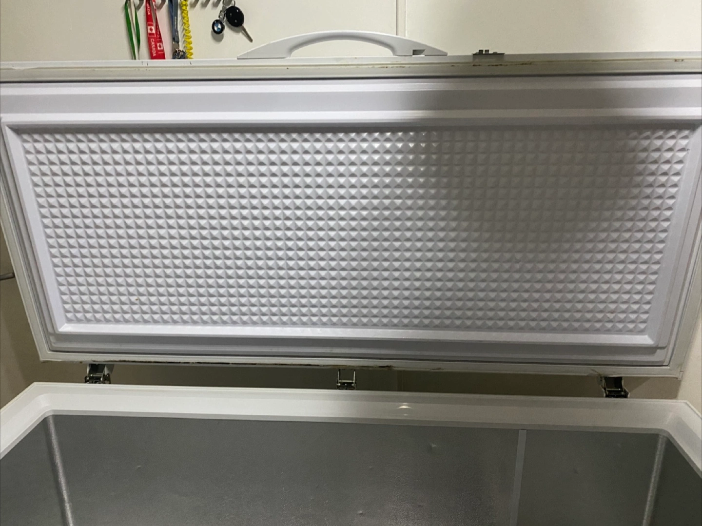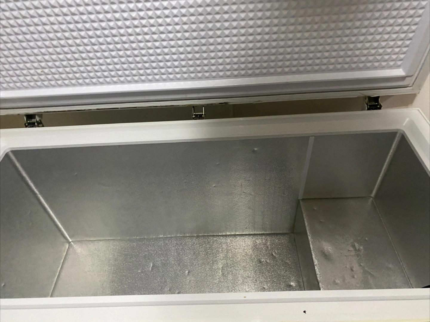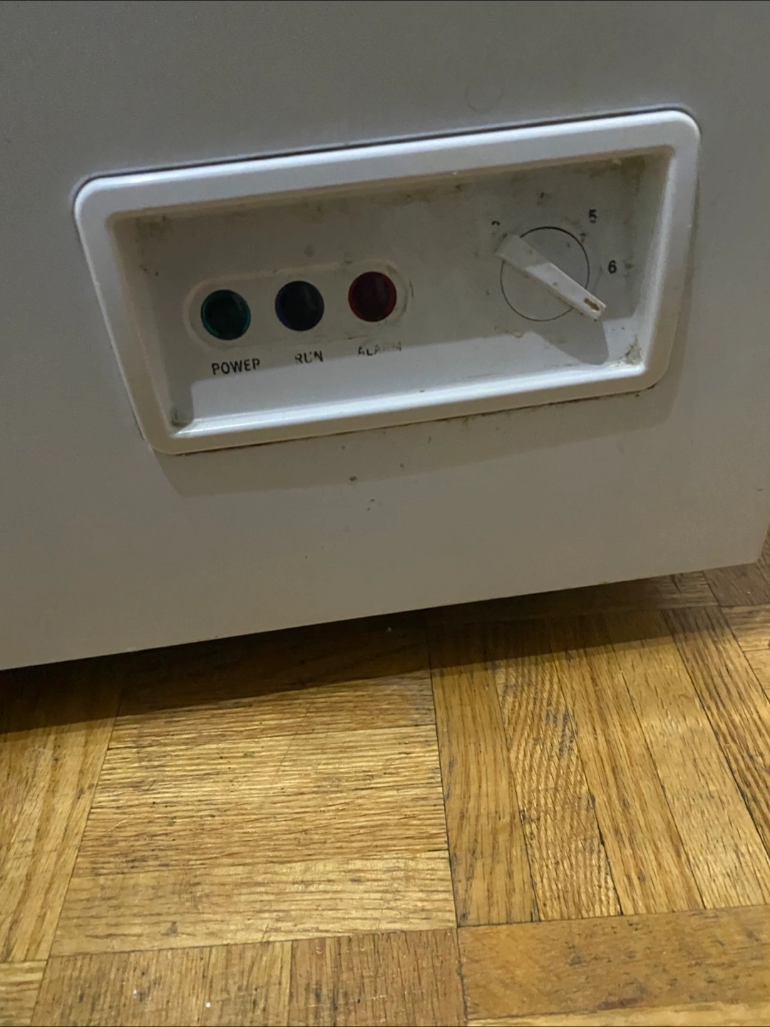 White chest freezer. Large capacity. Power indicator lights and temperature control dial. Used condition.