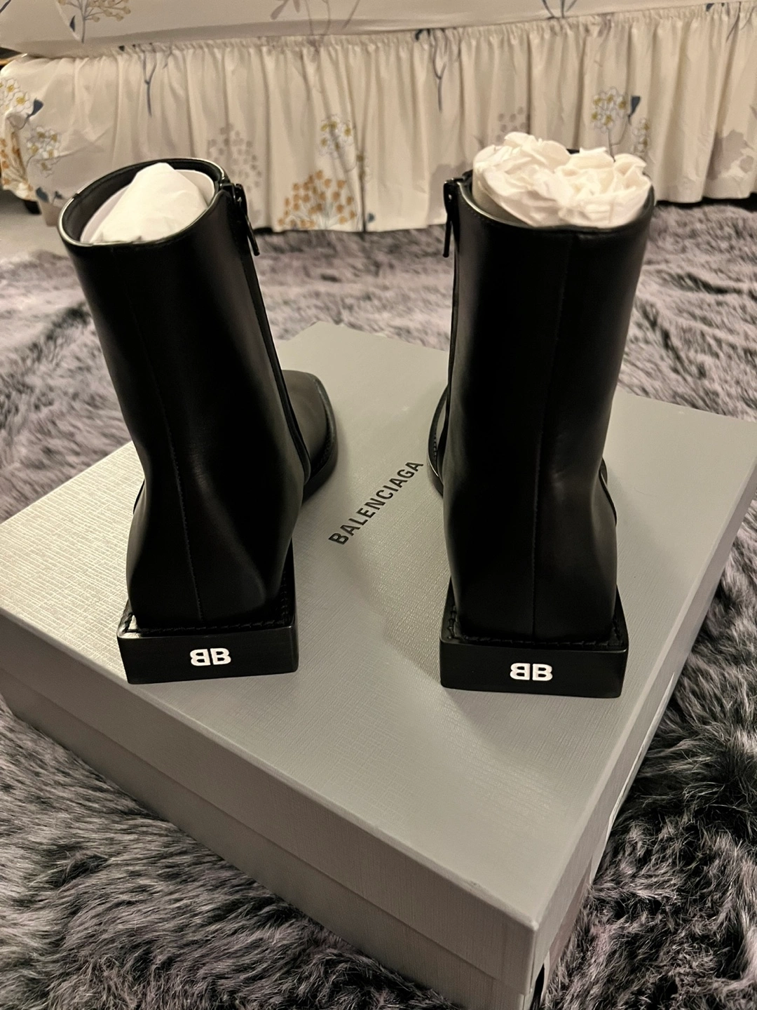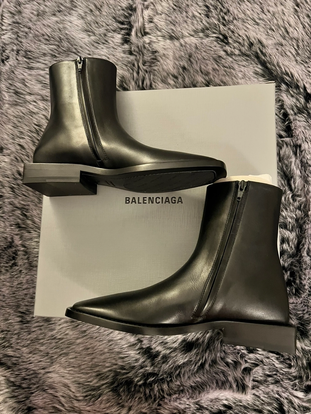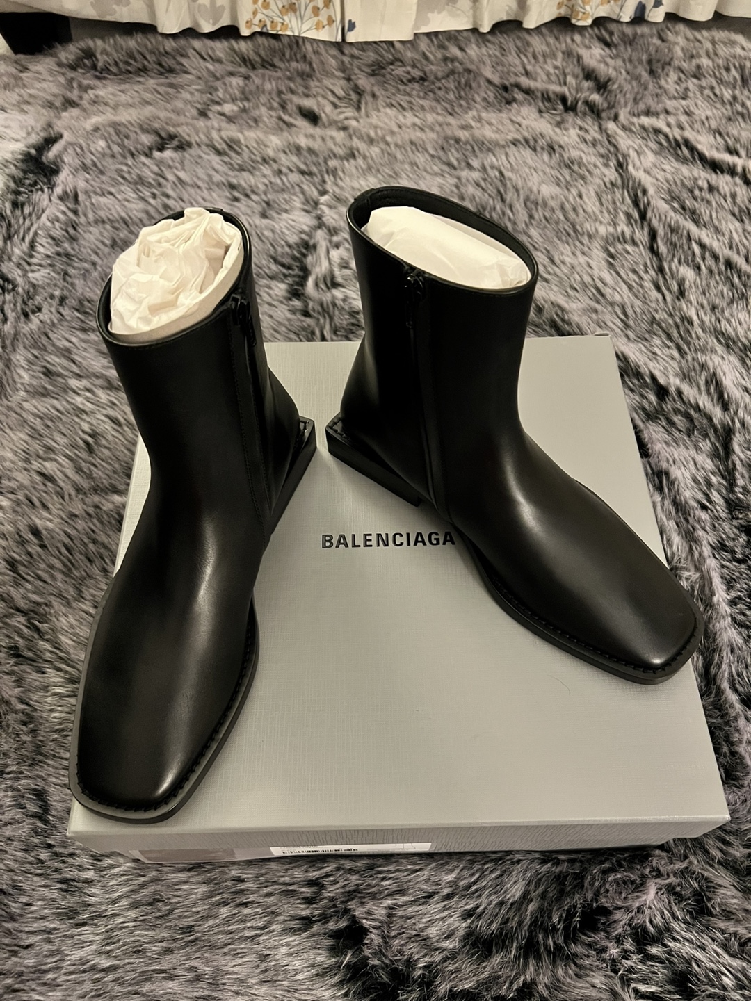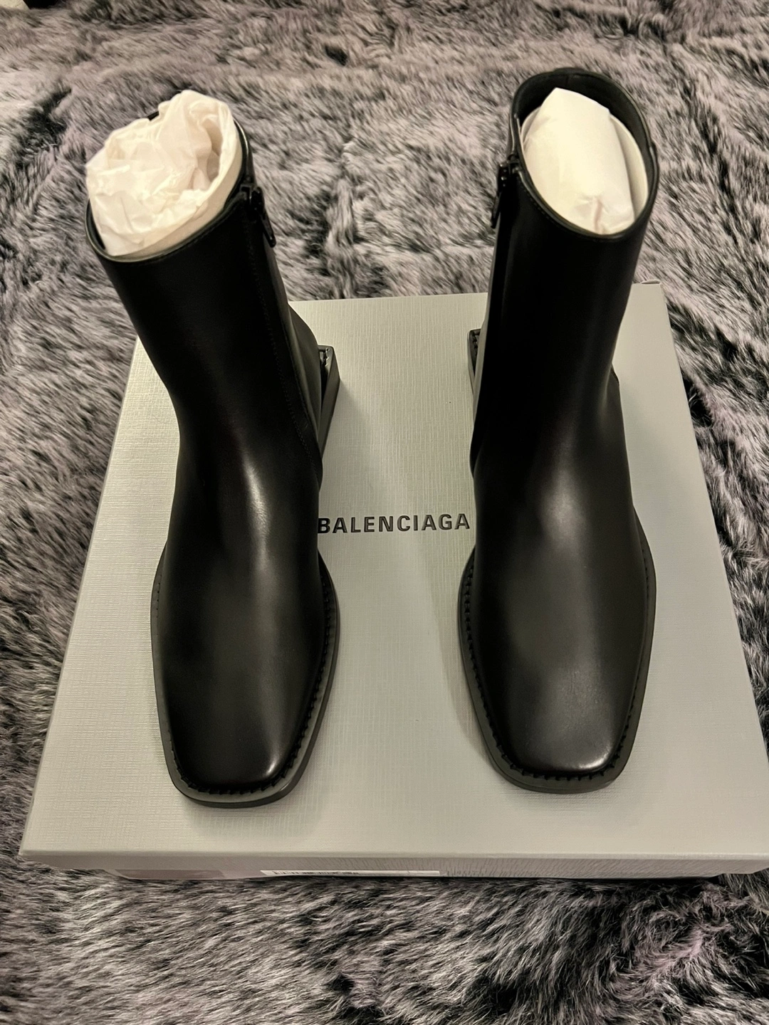 Authentic Balenciaga Women's black leather soft rim bootie. Carrera lux calfskin. Zip closure. Square toe. Brand new in original box with dust bag. Size 38. Originally over $1400. Serious buyers only.