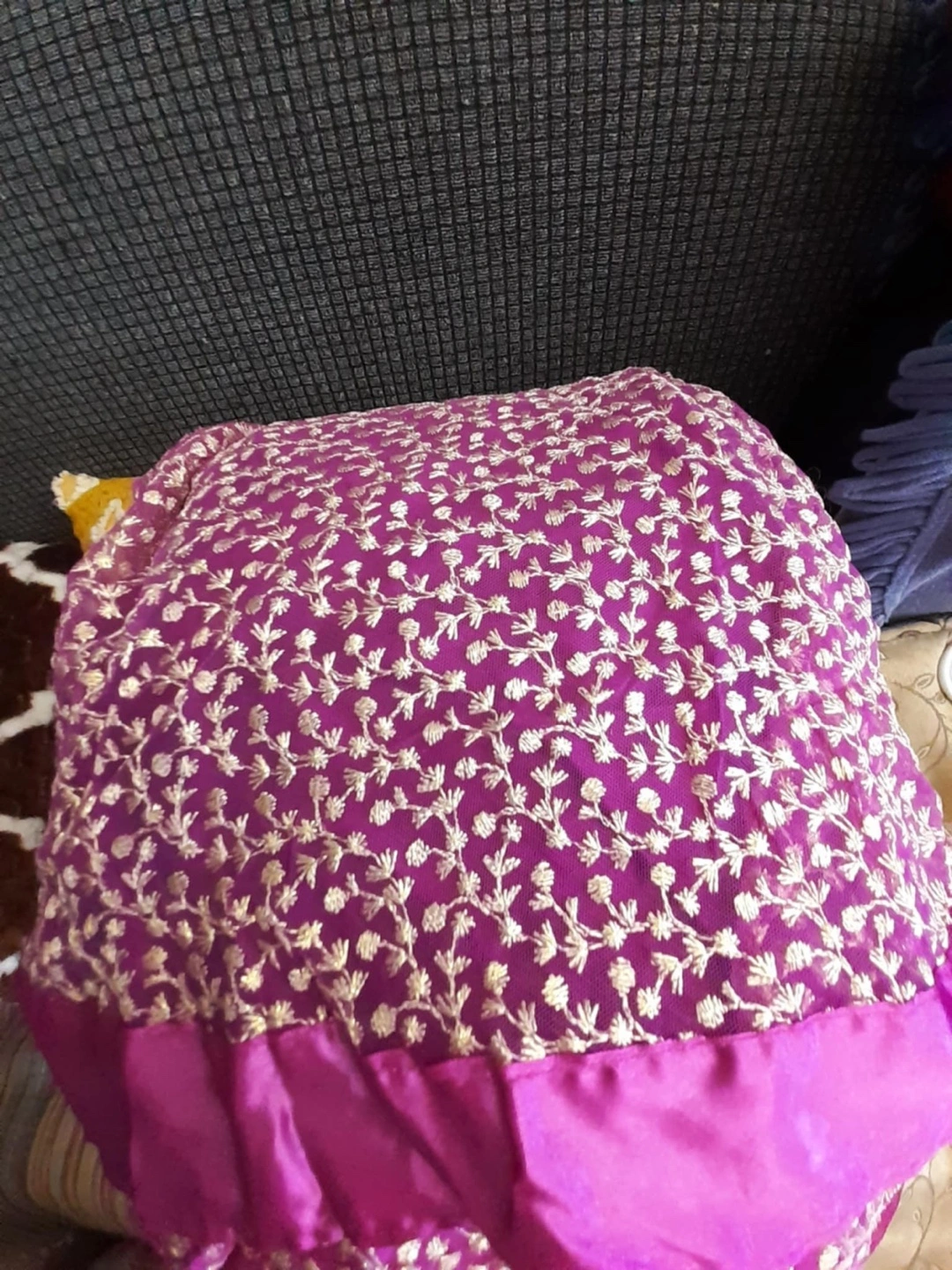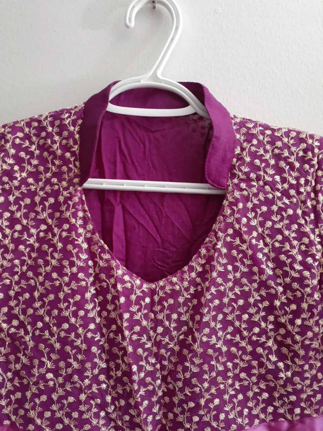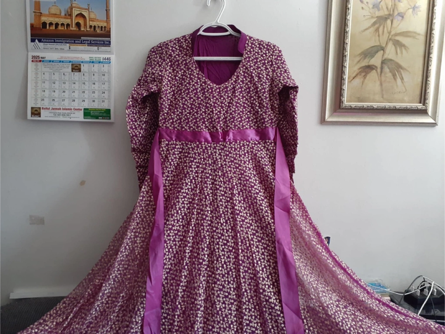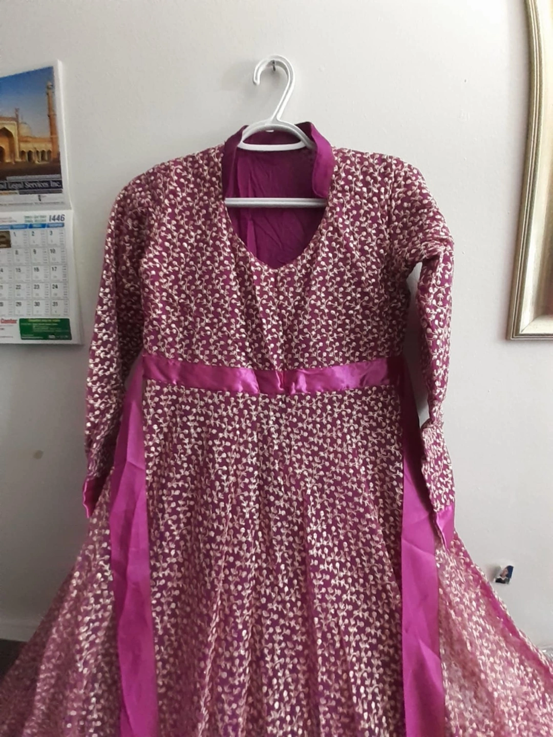 Beautiful purple maxi dress. Features long sleeves, an embroidered design, and a satin ribbon accent. Floor-length and elegant $35 , golden net embroidered 3 pieces small $30