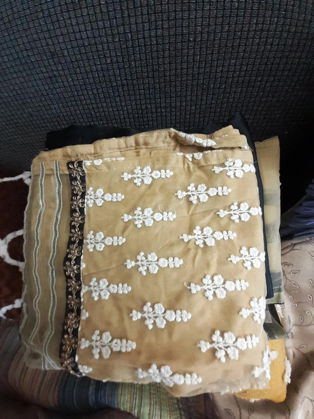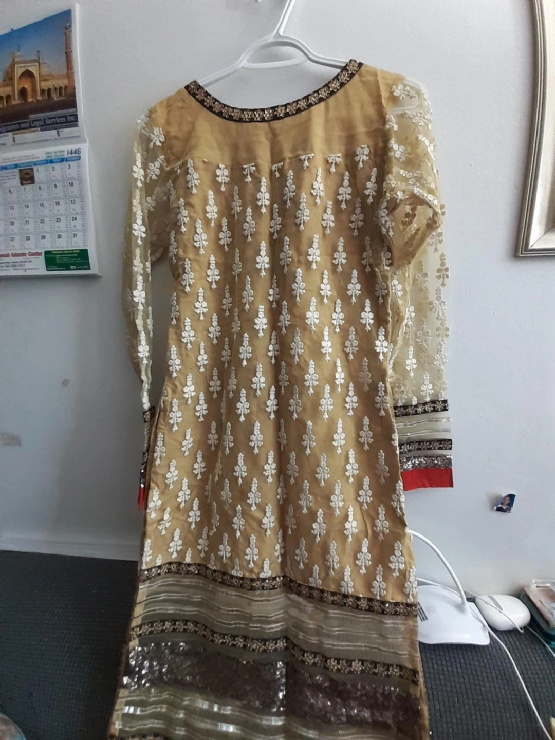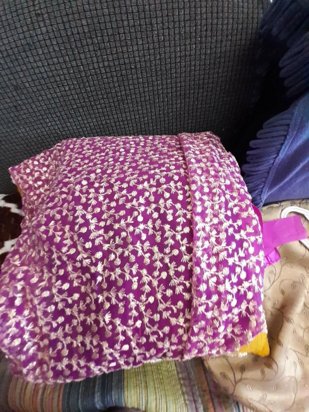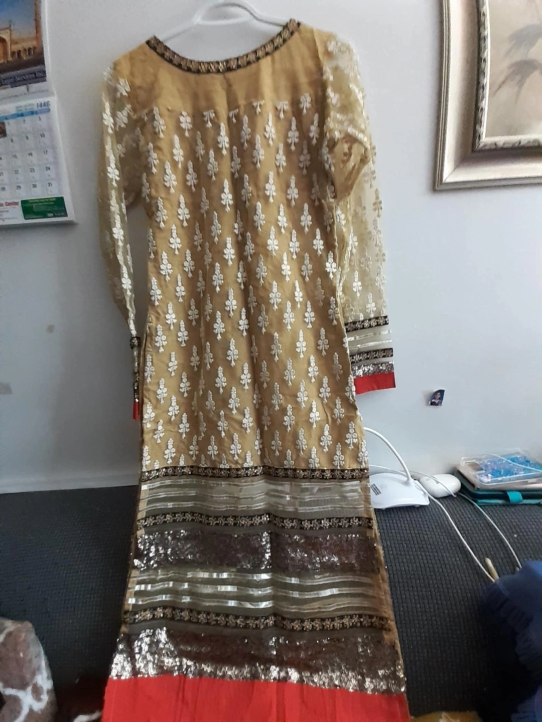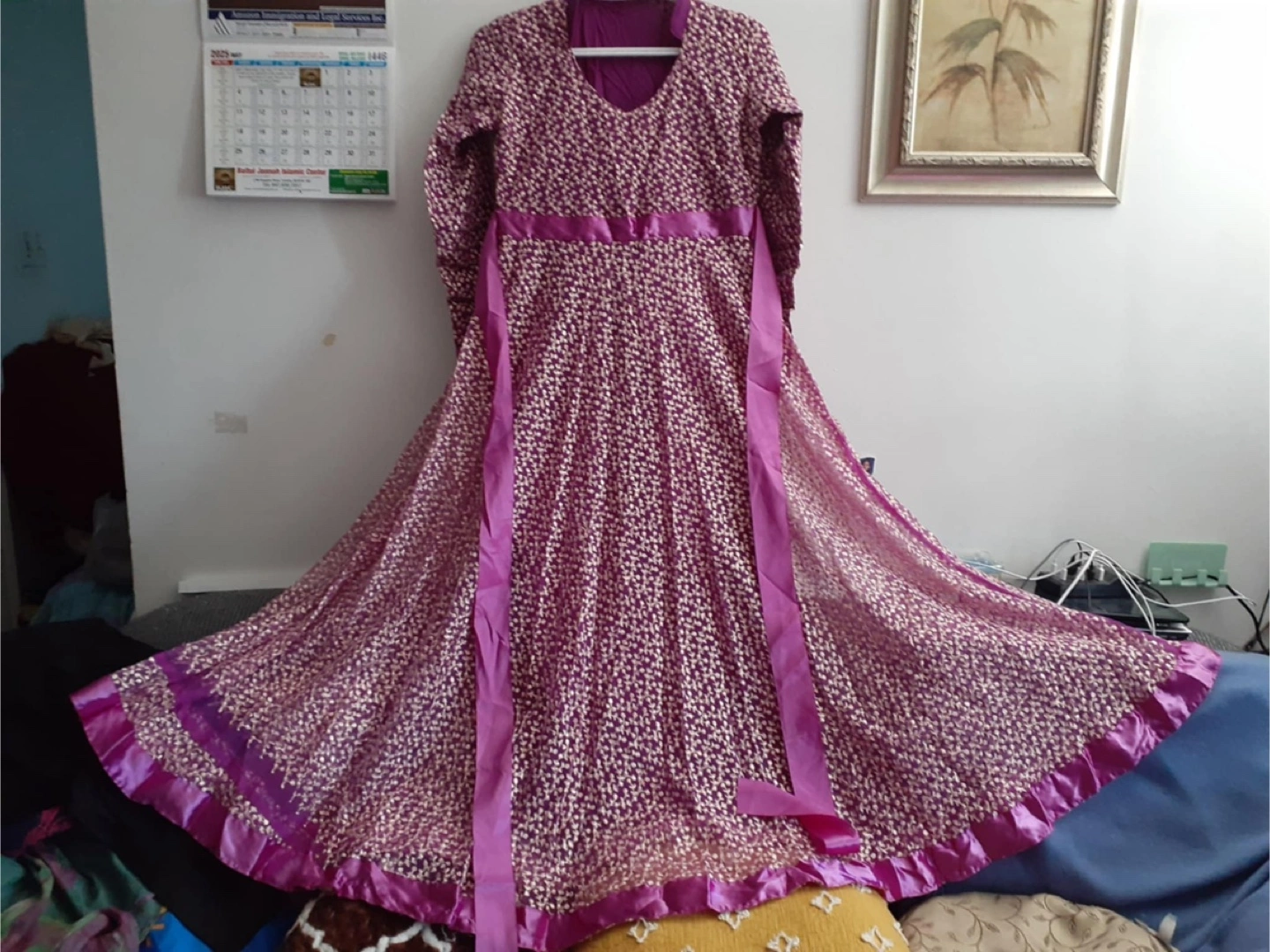 Beautiful purple maxi dress. Features long sleeves, an embroidered design, and a satin ribbon accent. Floor-length and elegant $35 , golden net embroidered 3 pieces small $30