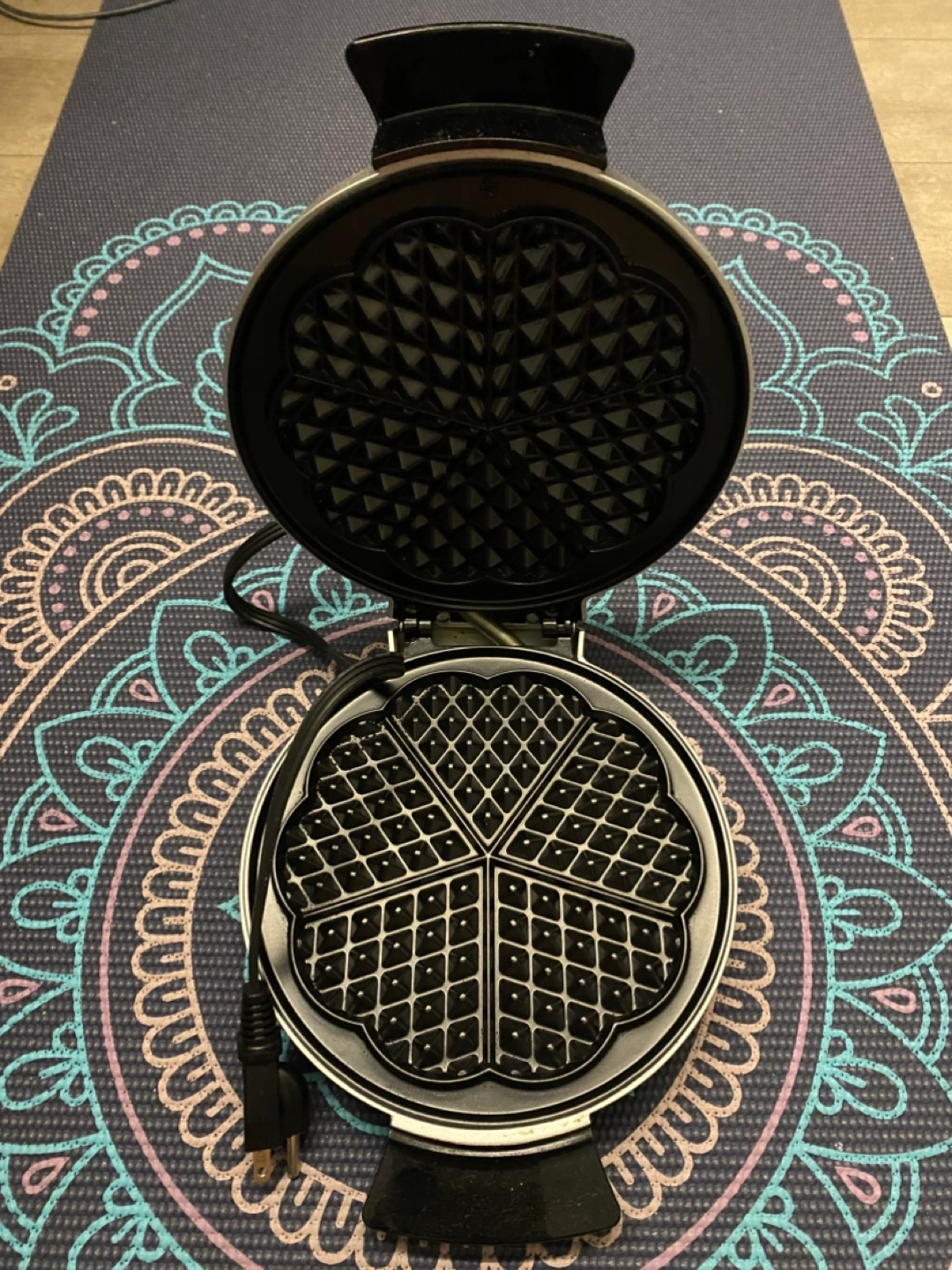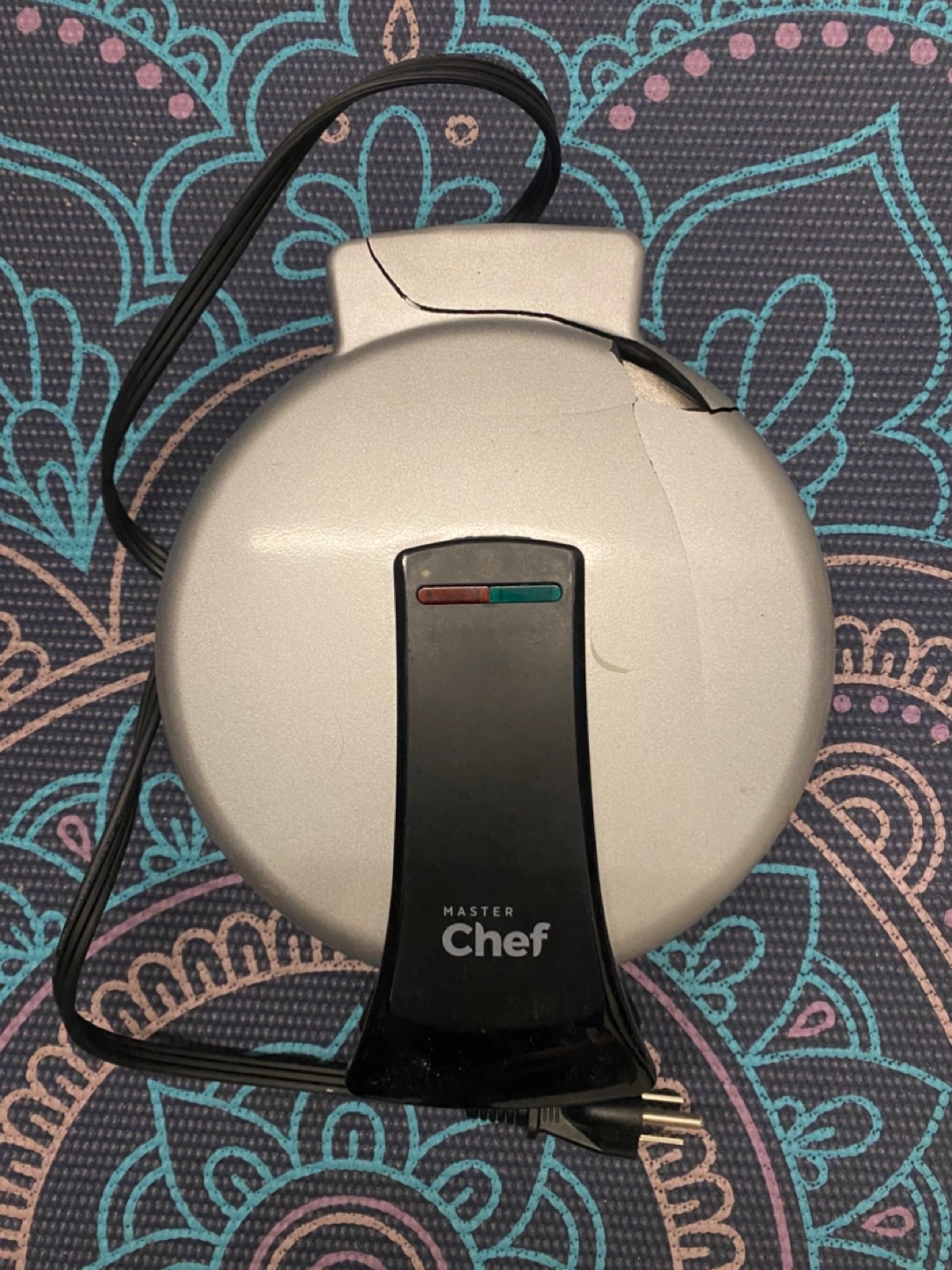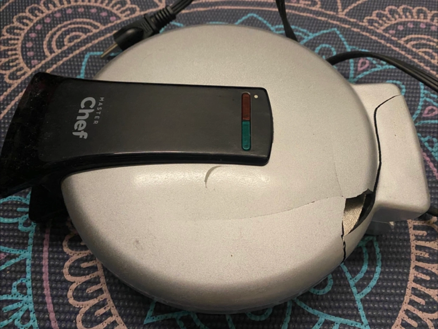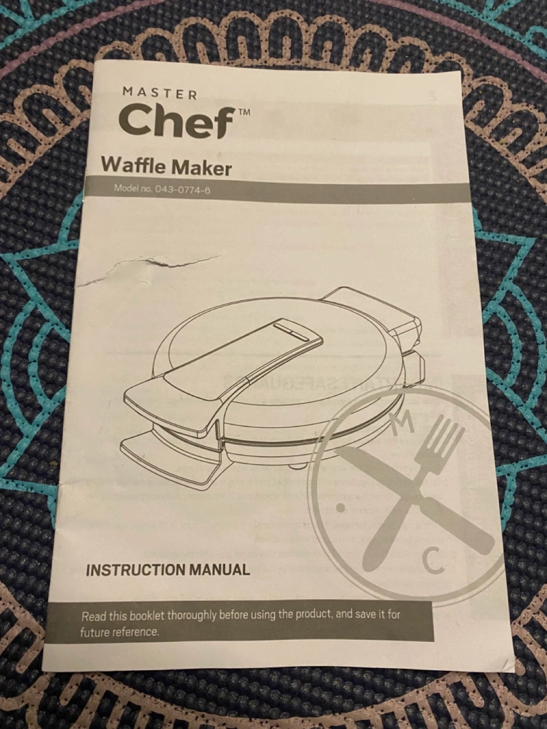 Slightly damaged Master Chef Waffle Maker. Model number 043-0774-6. Includes instruction manual. Circular design. Minor damage visible on the exterior; does not affect the ability to make tasty waffles.π