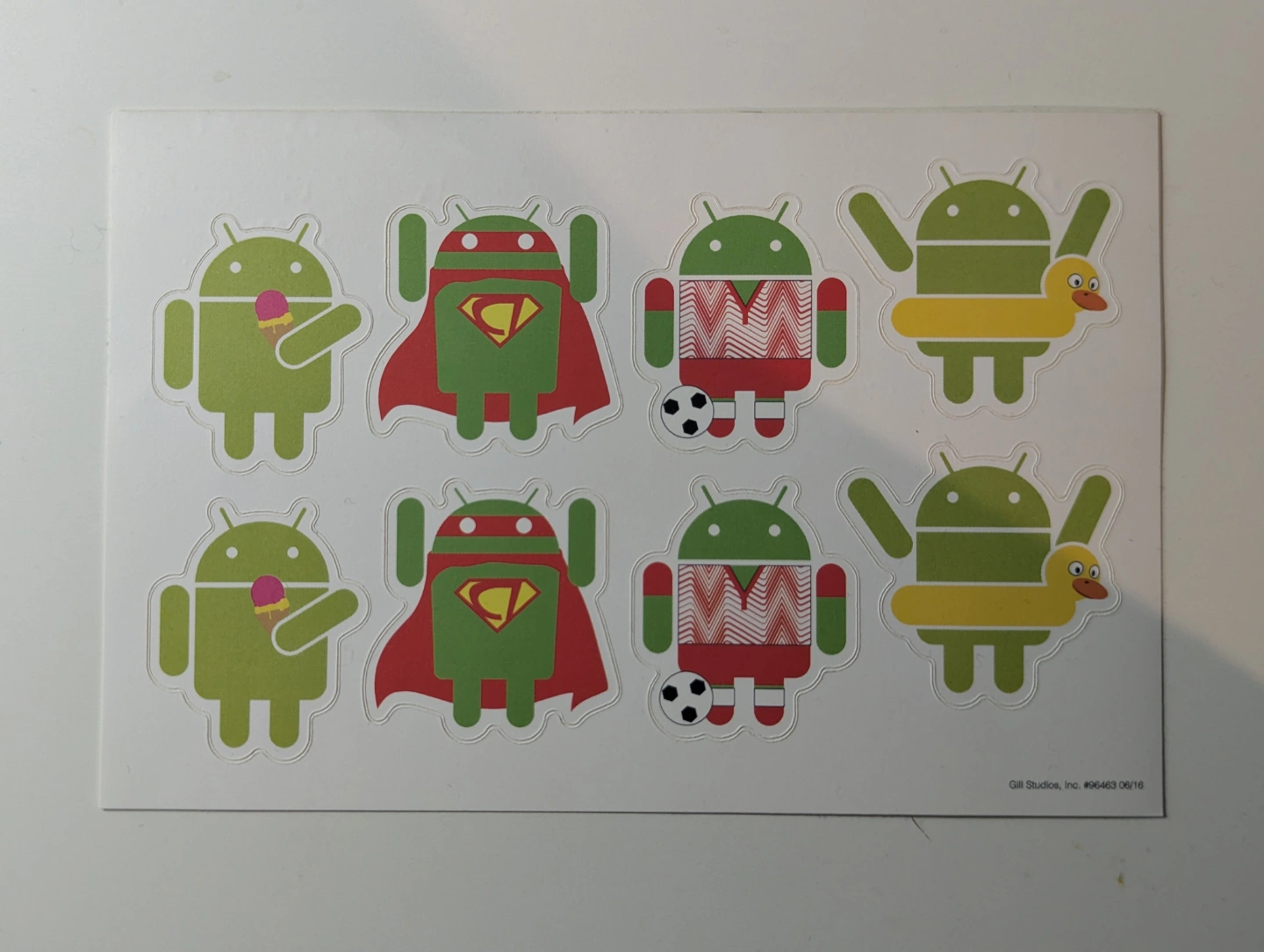 sheet of six Android robot Die-cut stickers on a white backing. Super cute designs: ice cream, superhero, soccer, and rubber ducky.