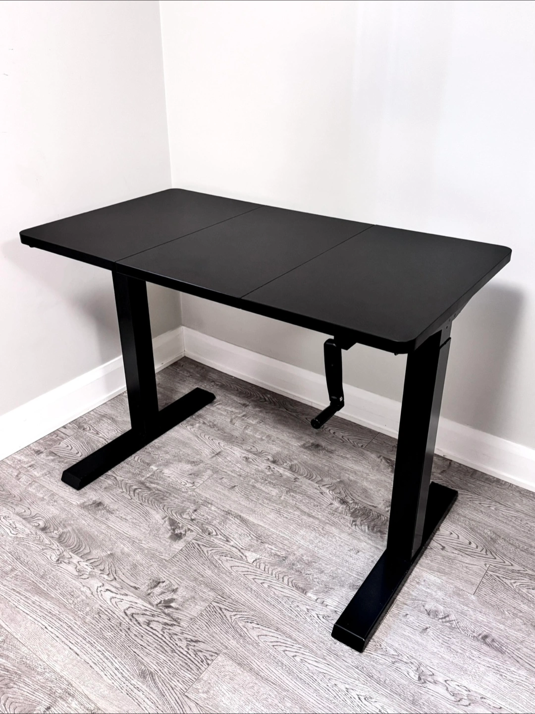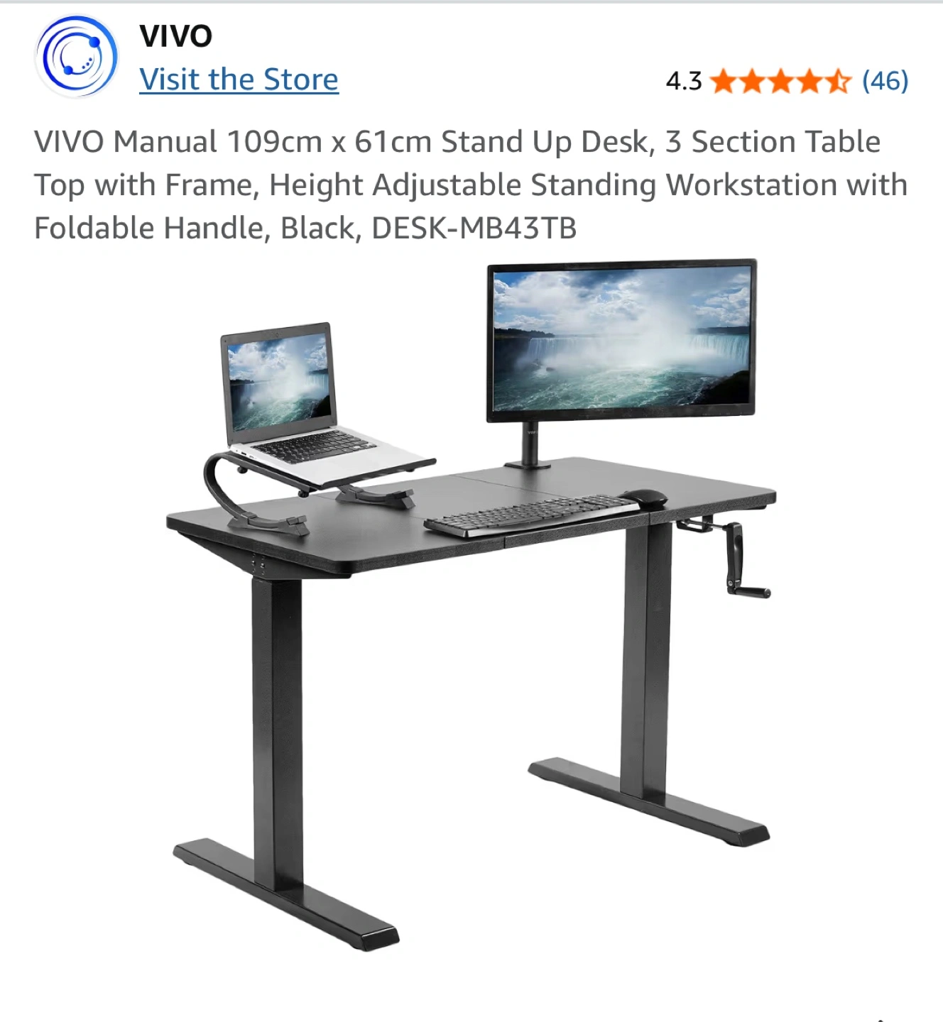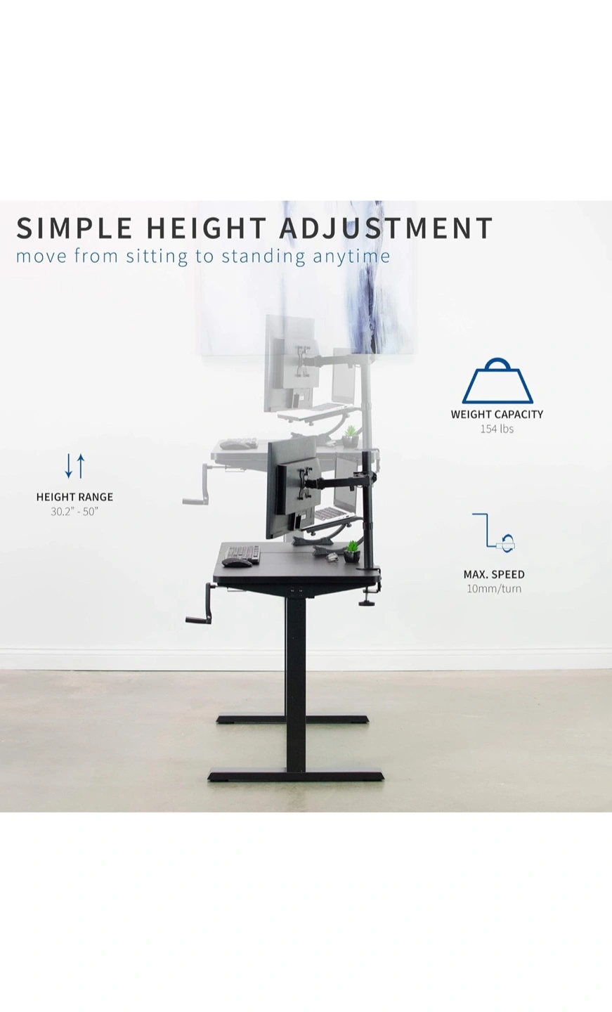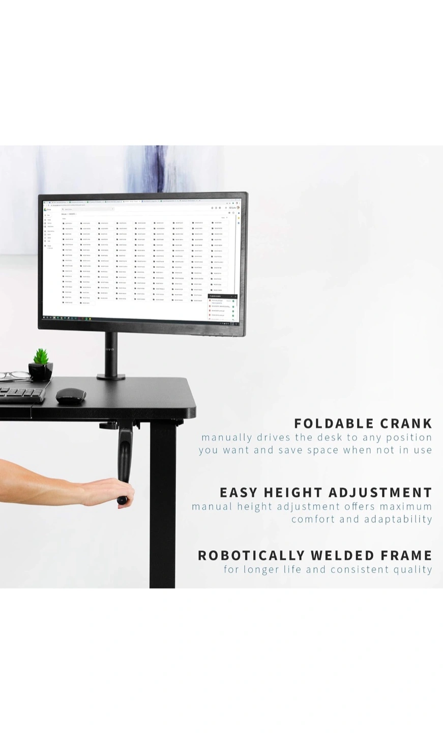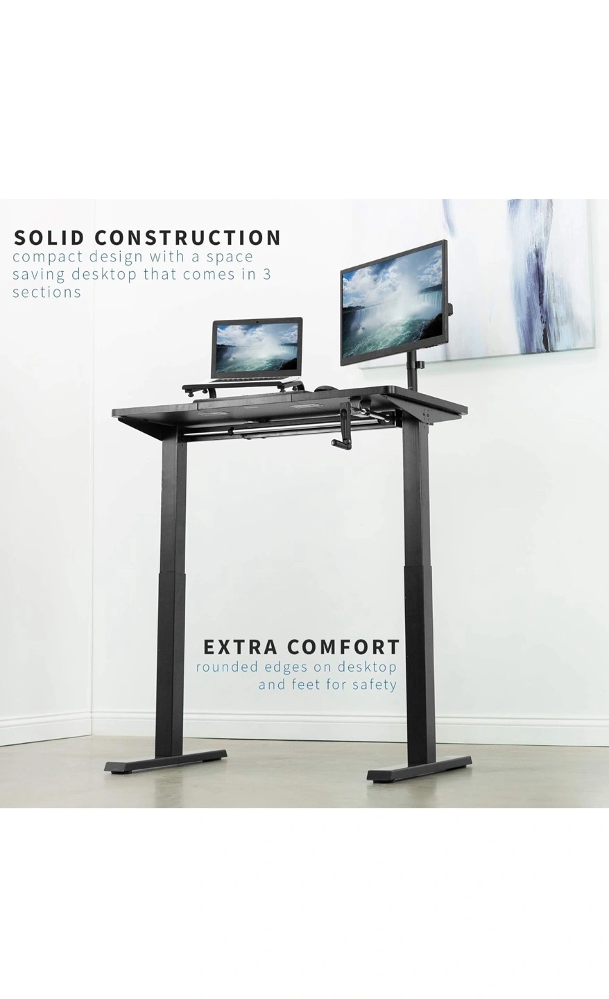 VIVO Black adjustable standing desk. It has a manual height adjustment with a convenient foldable handle. It can be adjusted to heights between 77 cm and 127 cm and can support a weight capacity of up to 70 kg.