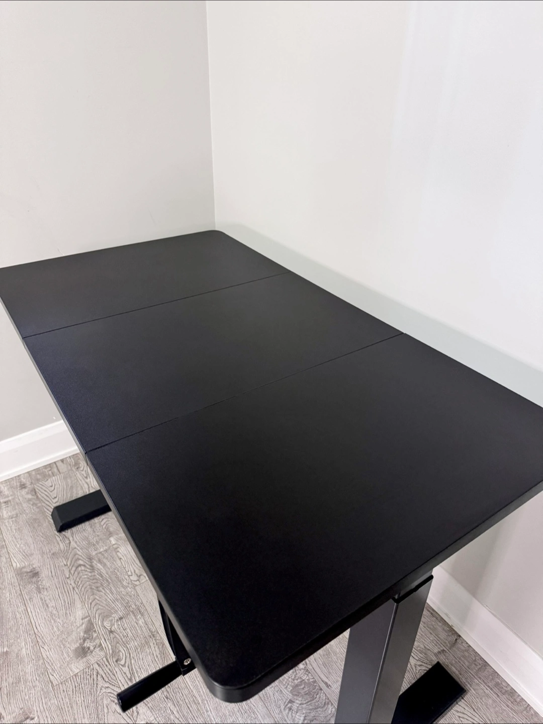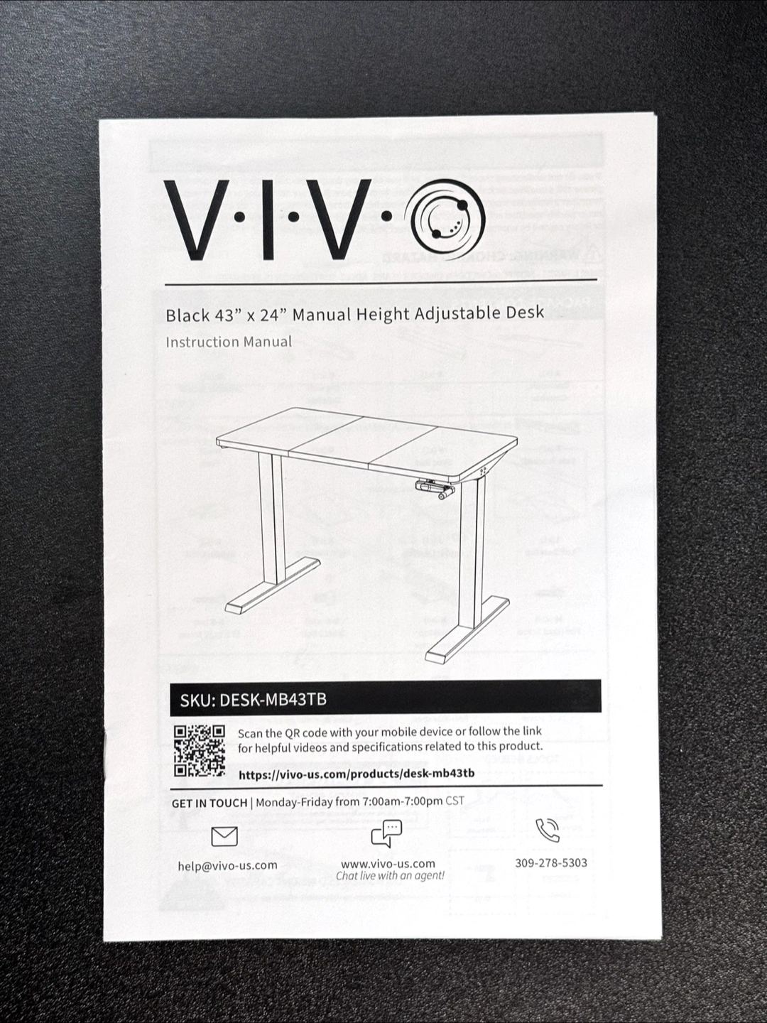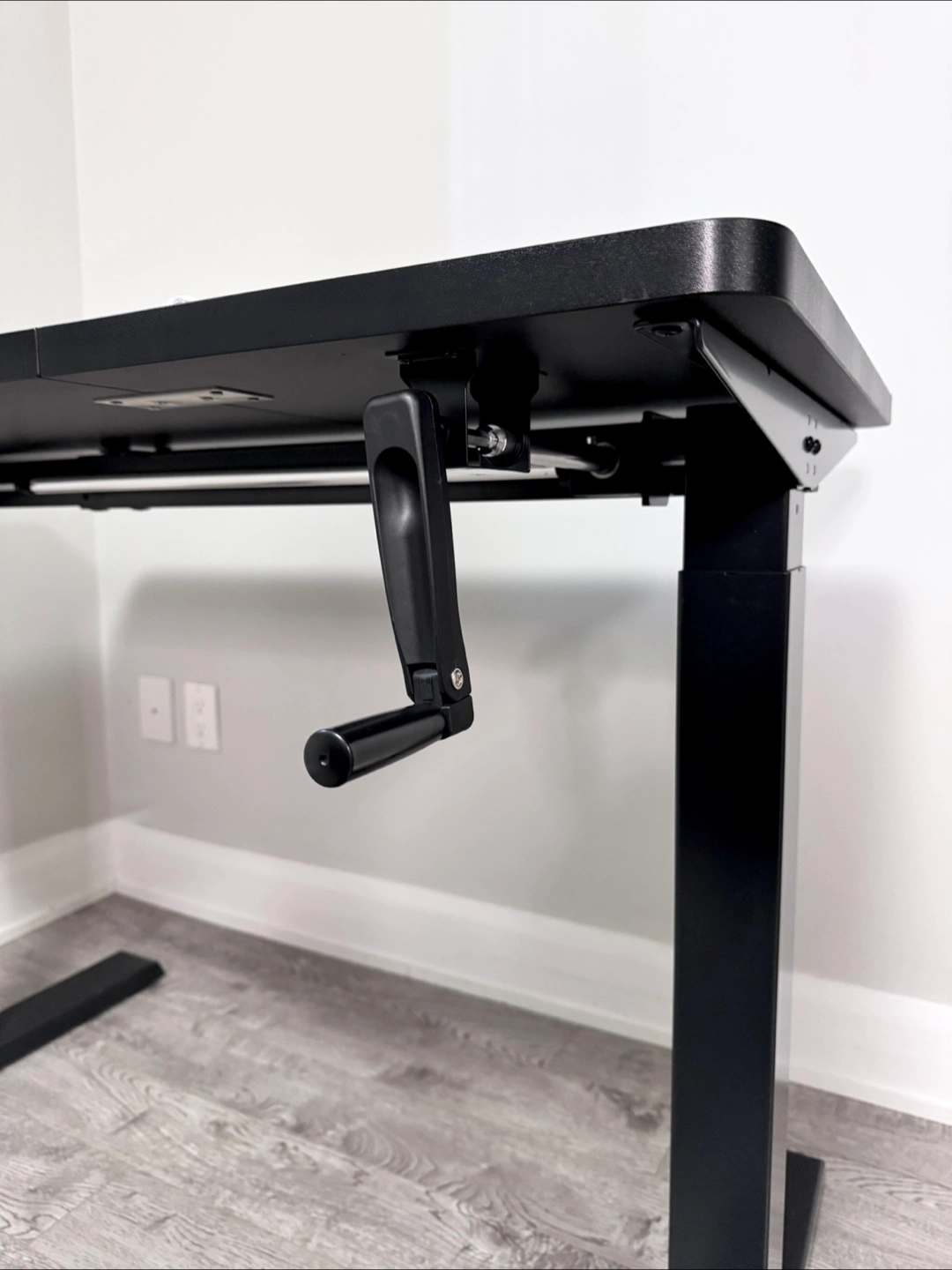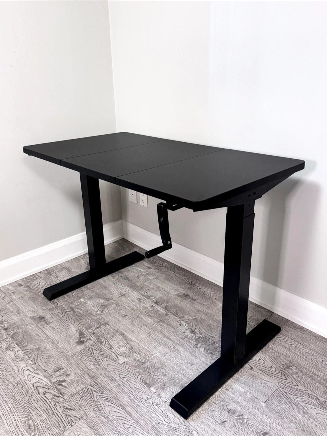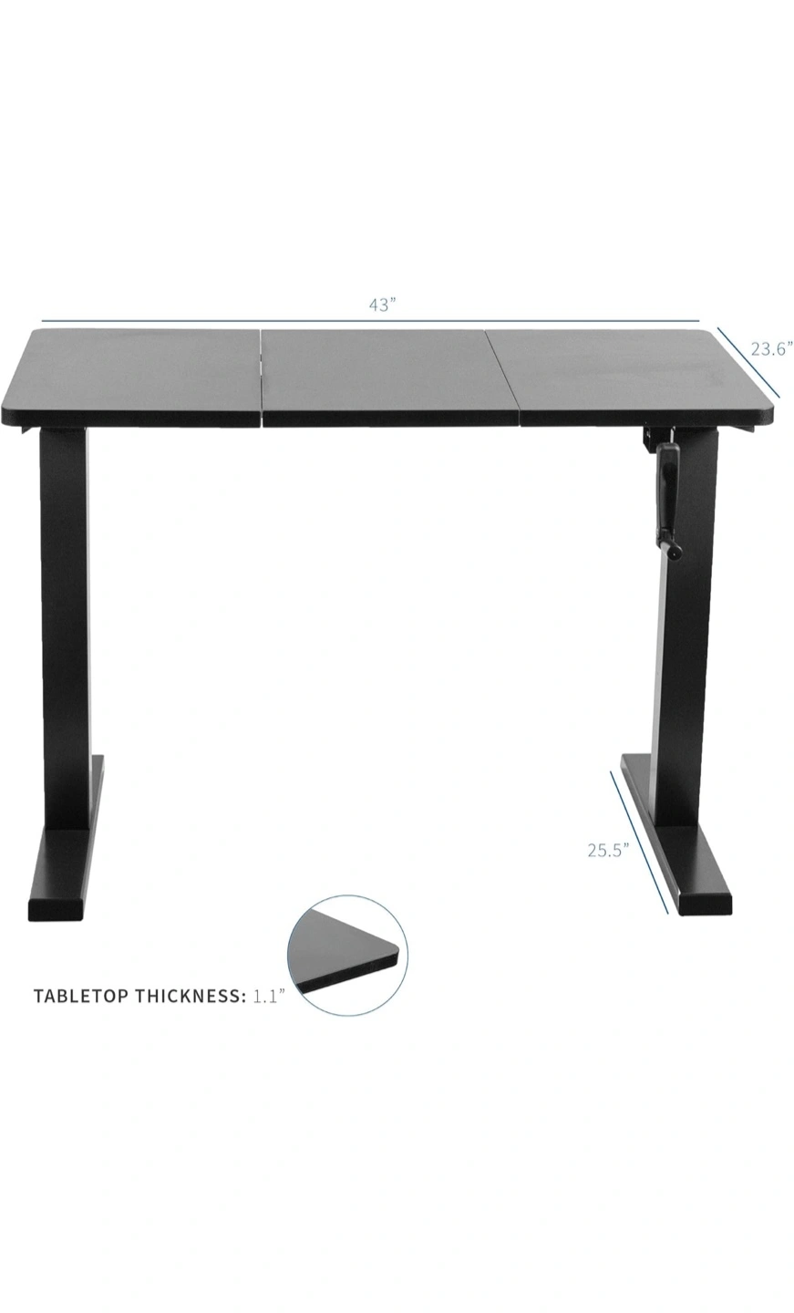 VIVO Black adjustable standing desk. It has a manual height adjustment with a convenient foldable handle. It can be adjusted to heights between 77 cm and 127 cm and can support a weight capacity of up to 70 kg.