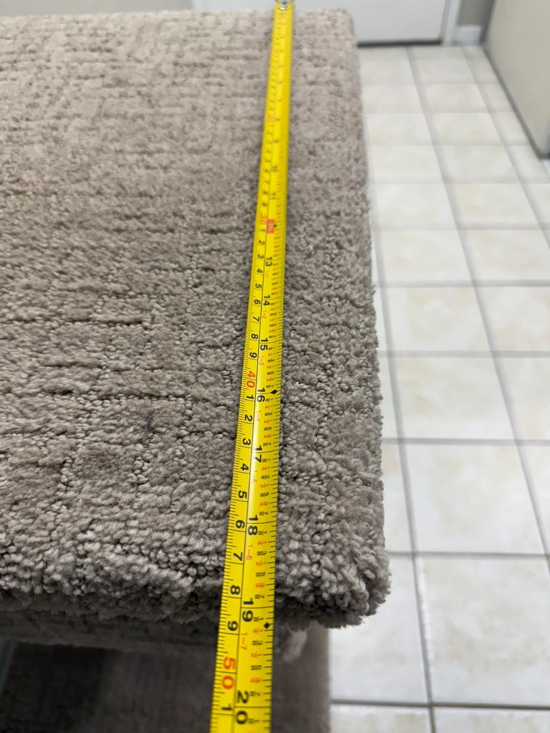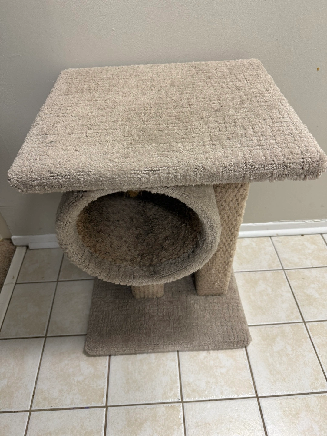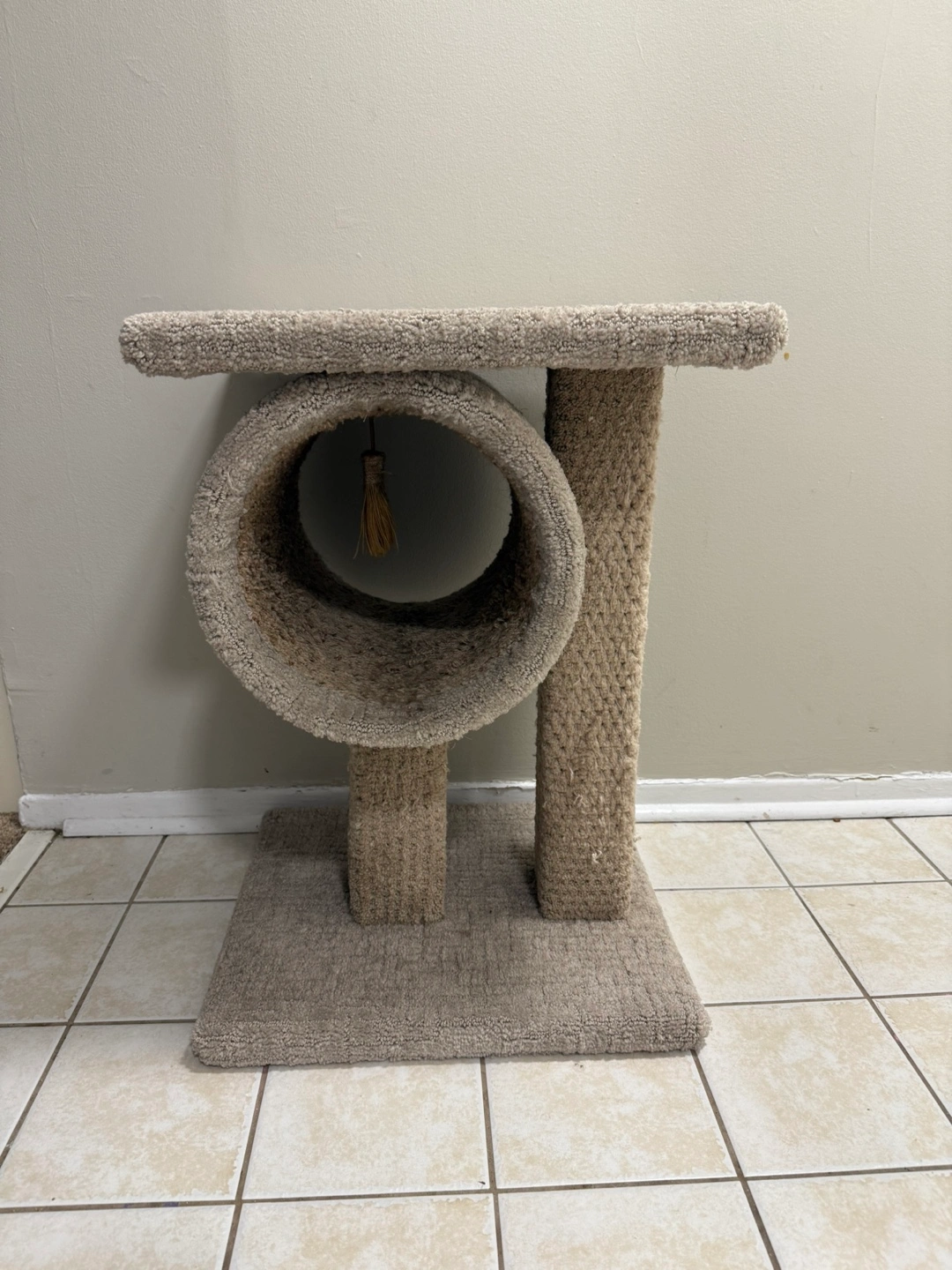 Small beige cat tree. Features a small platform, a tunnel, and a post. Approximately 20 inches tall. Pick up at Frobisher Lane