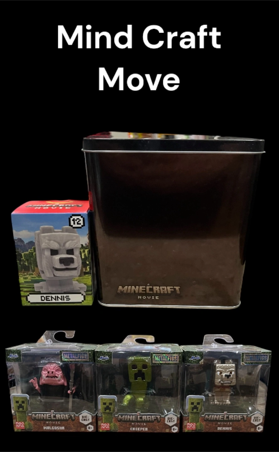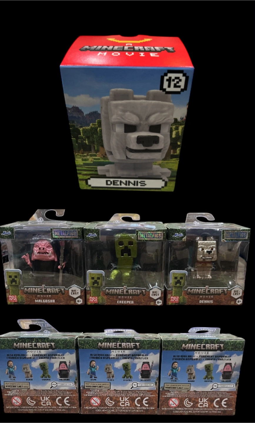 Four Minecraft Movie Metalfigs: Malgosha, Creeper, and Dennis. Figures come in a collectible Minecraft Movie popcorn tin. Great for collectors!