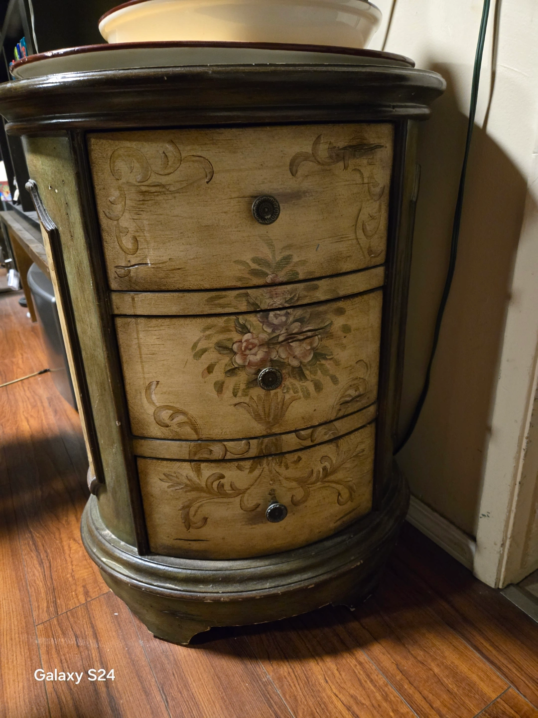 Curved wooden chest of drawers. Features hand-painted floral designs and ornate detailing. Three drawers with metal knobs. Dark green and beige finish.