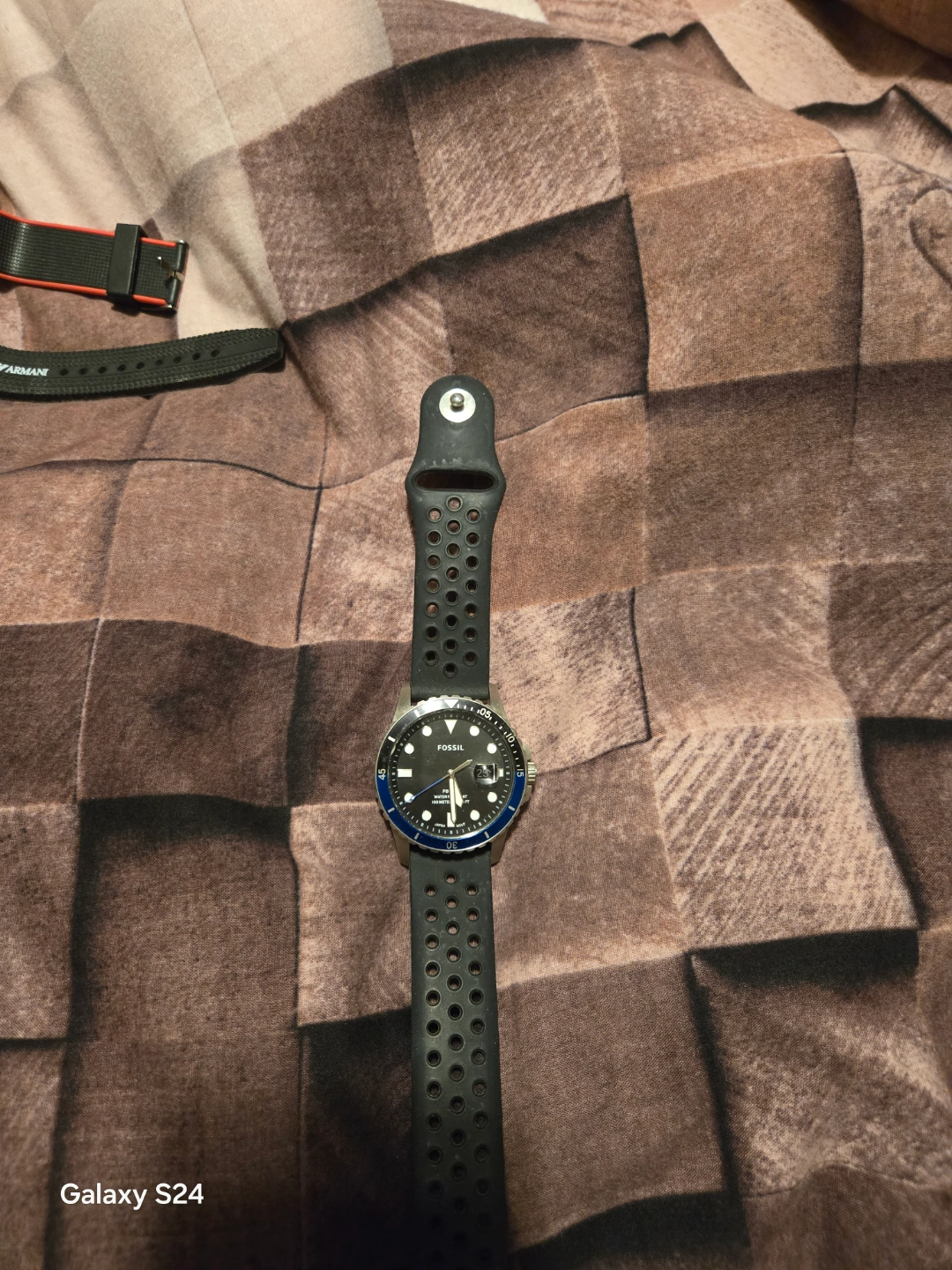 Pre-owned Fossil watch. Features a black silicone band and a blue and silver face. Looks to be in good condition.