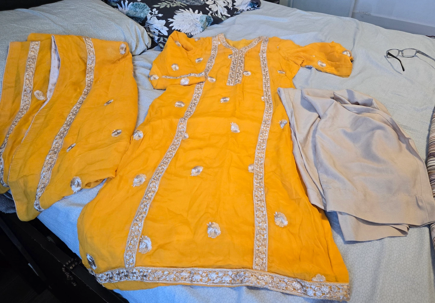 Beautiful mustard yellow shalwar kameez. Features silver embroidery. Includes matching dupatta and shalwar. Elegant and stylish.