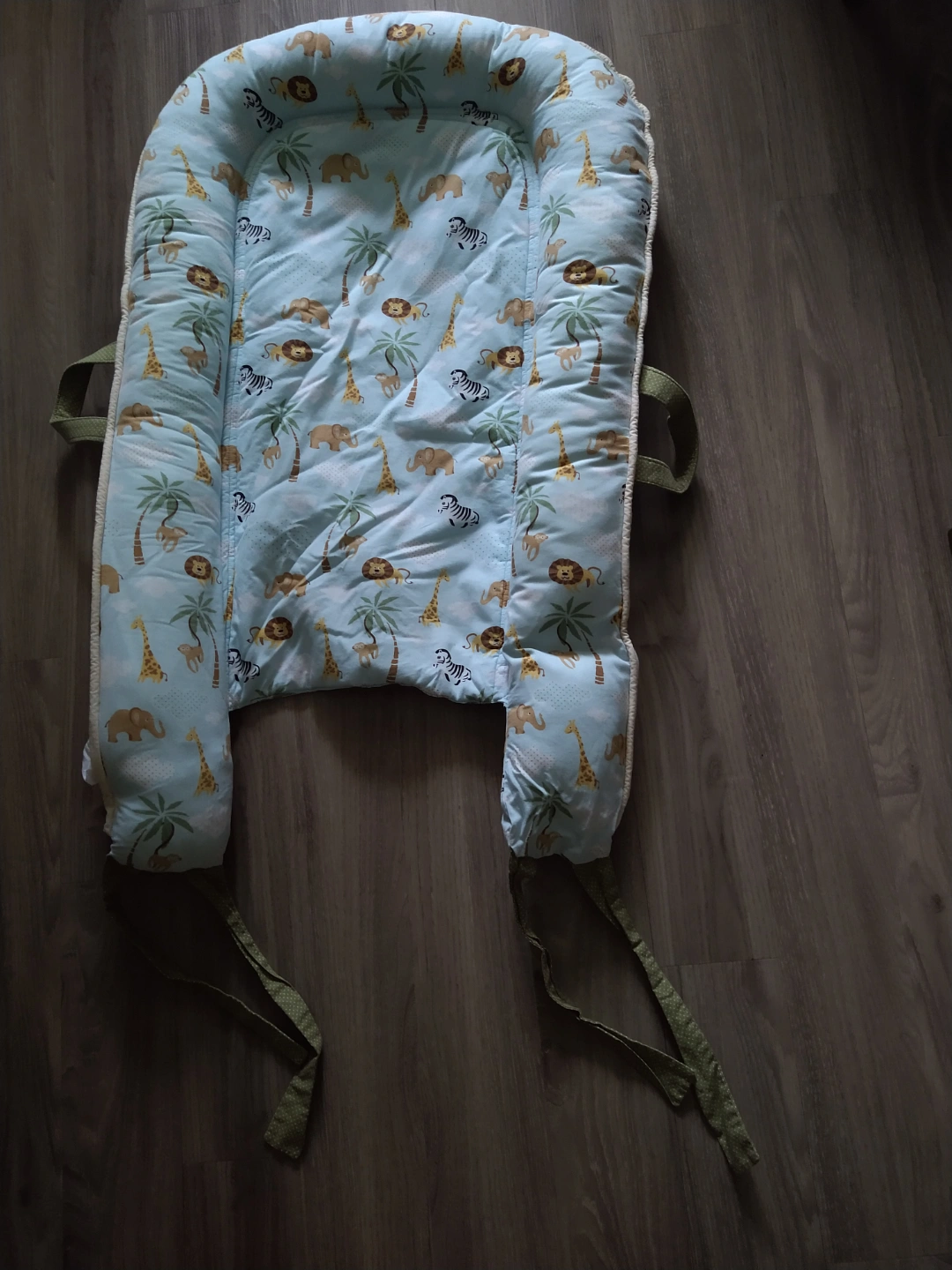 Adorable baby lounger, features a light blue background with a safari animal print. Soft padding. Green straps. Suitable for newborns.