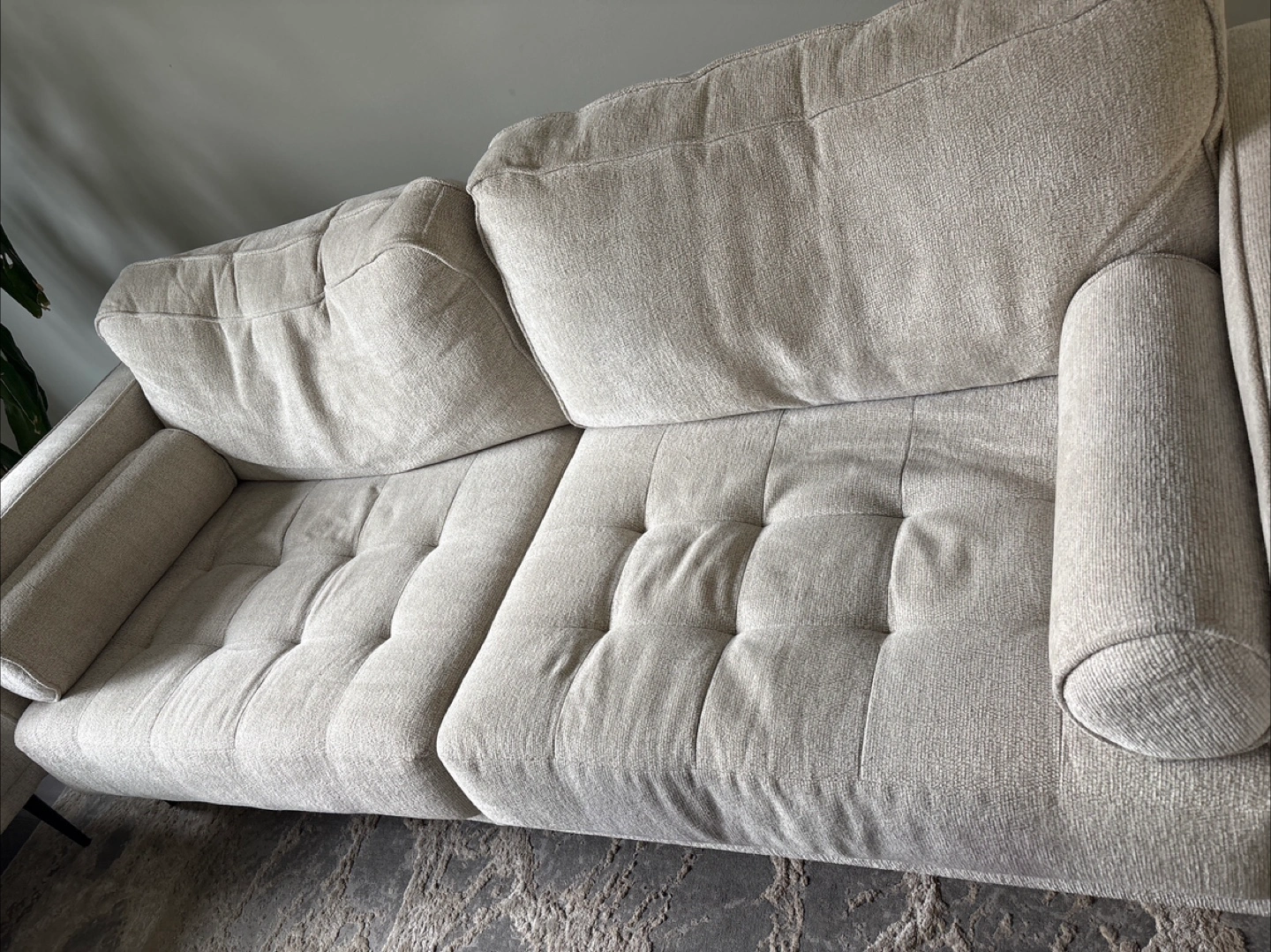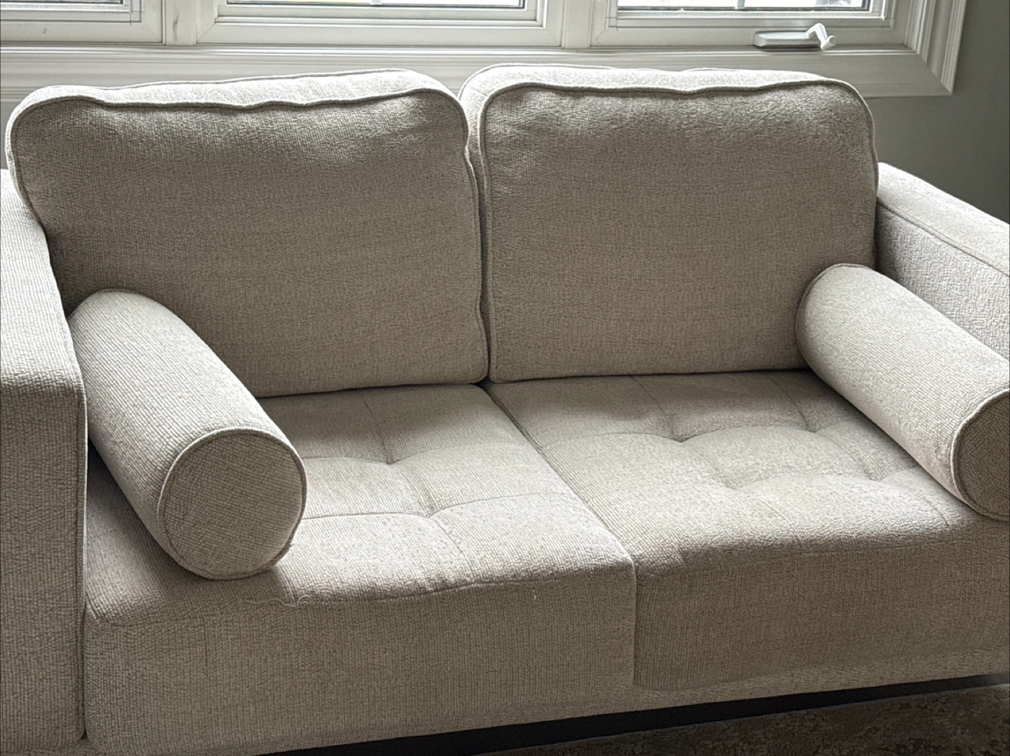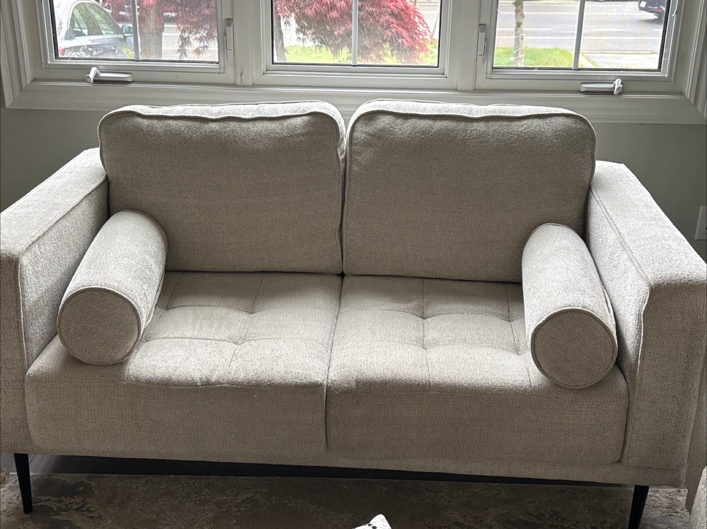 Stylish beige fabric love seat and sofa. Button-tufted design. Includes bolster pillows. Contemporary style. Black legs.