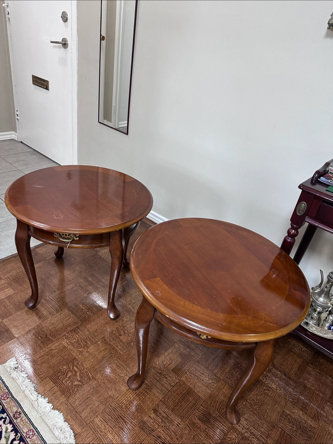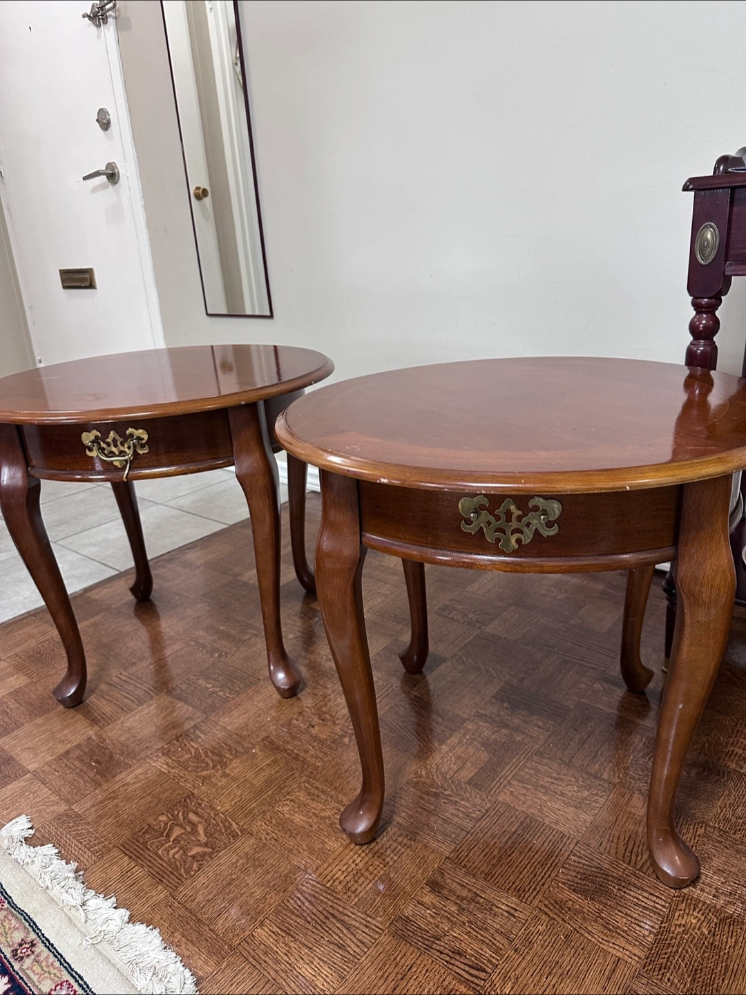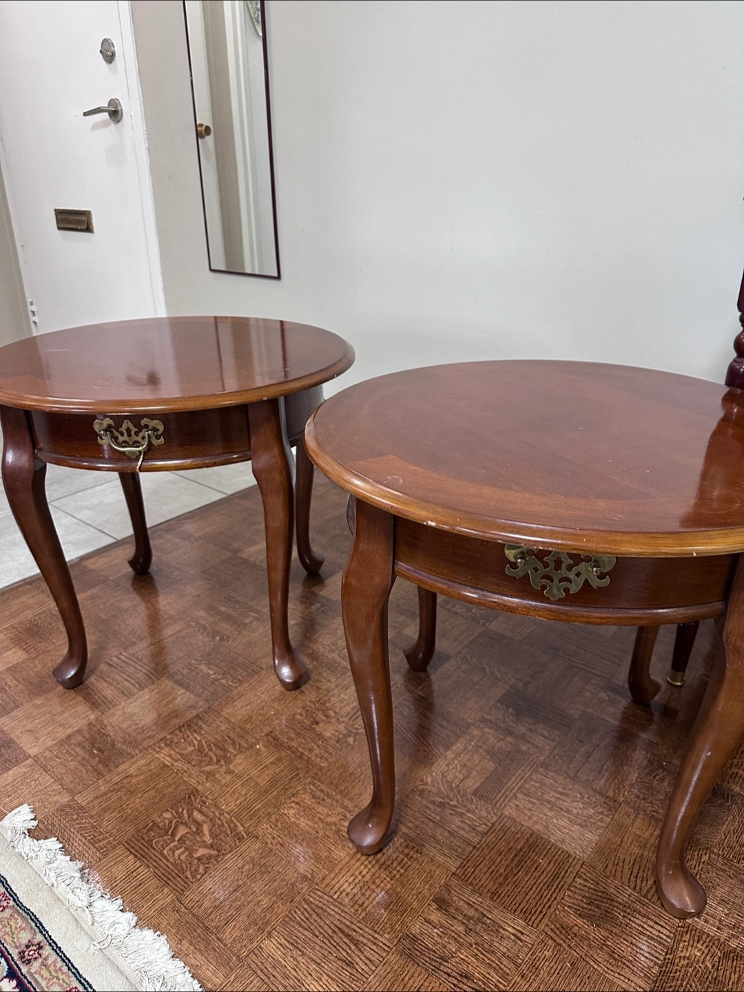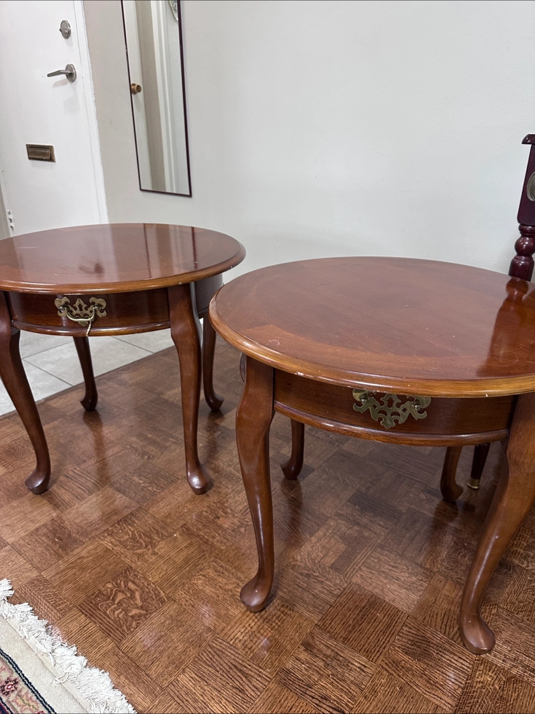 Two matching round end tables. Dark wood finish. Each features a small with ornate brass hardware. Cabriole legs.