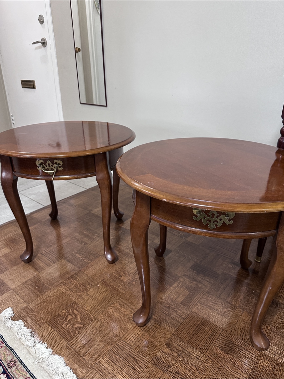 Two matching round end tables. Dark wood finish. Each features a small with ornate brass hardware. Cabriole legs.