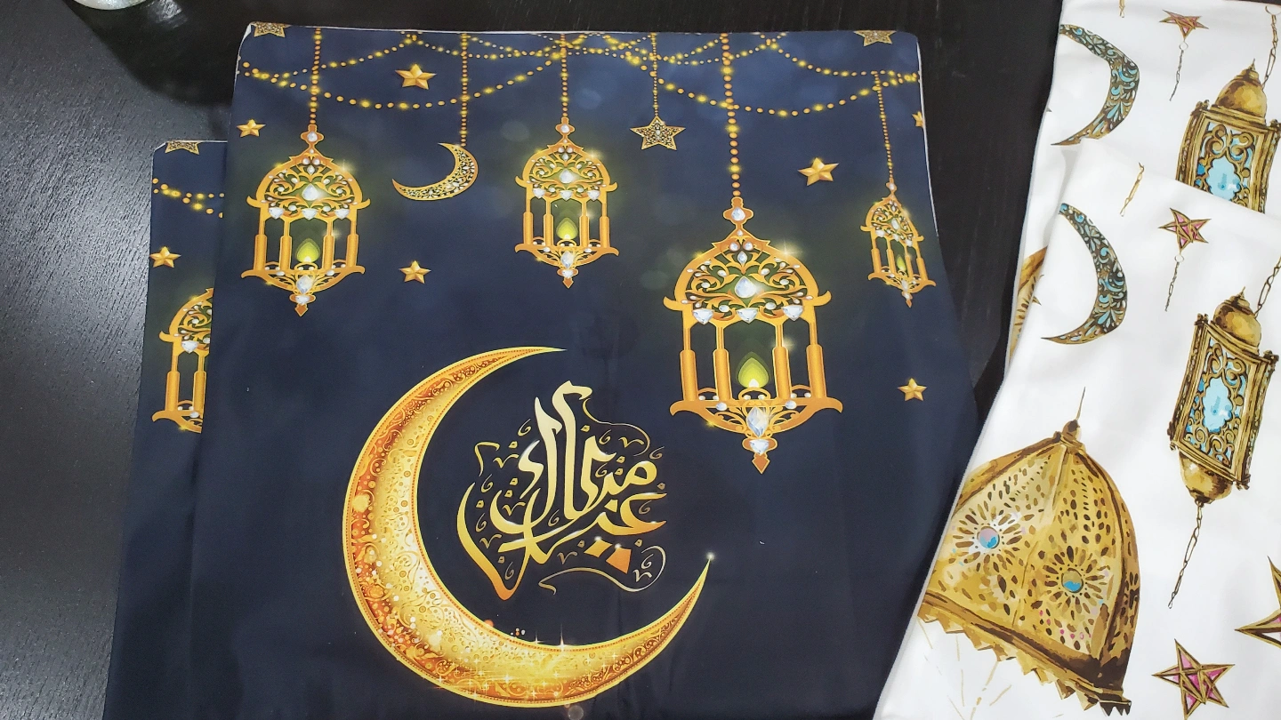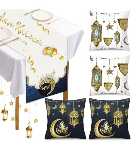 Four cushion covers and one table runner. Features gold lanterns, stars, crescent moons, and Arabic calligraphy. Festive Ramadan decor. Perfect for adding a touch of elegance to your home during the holy month.