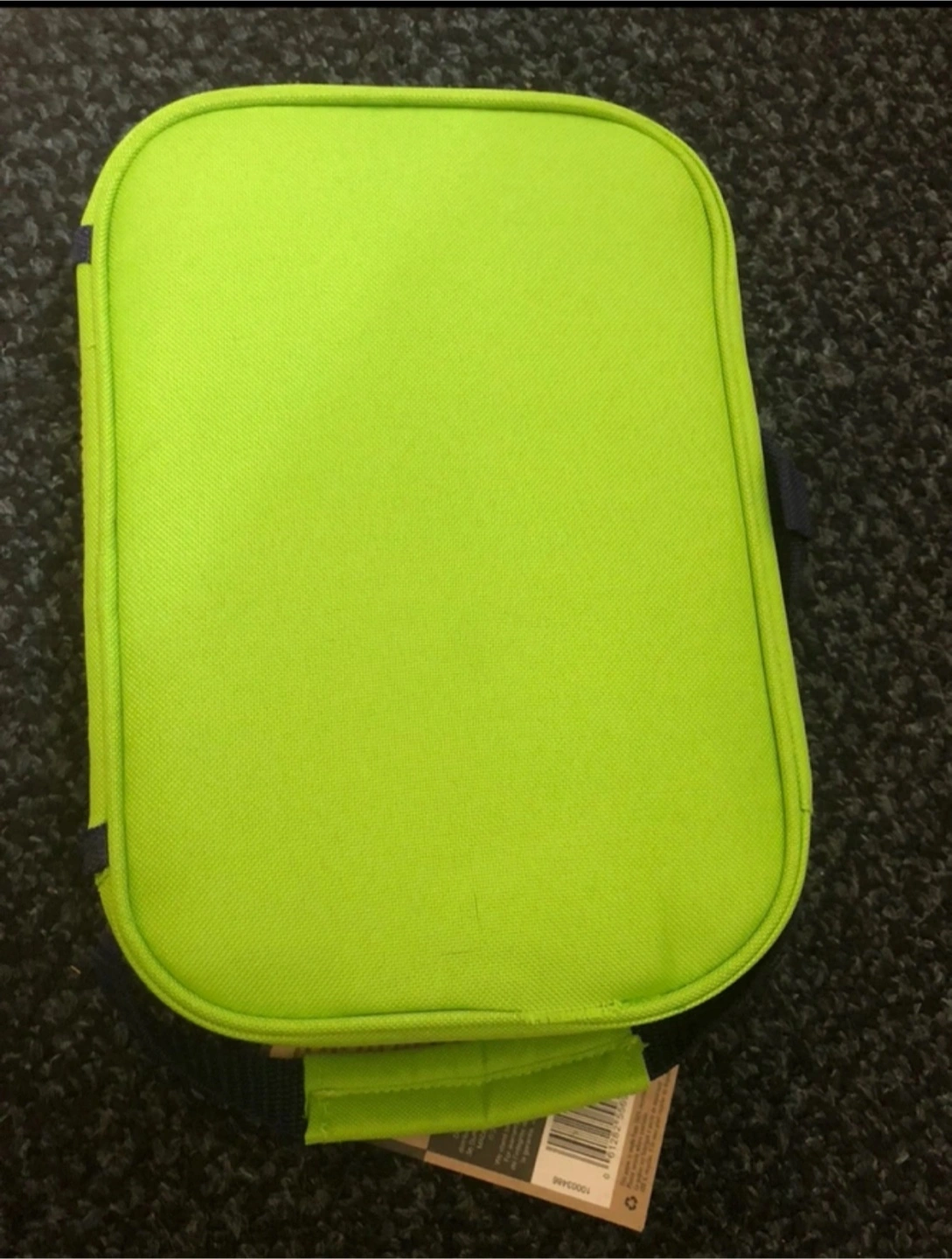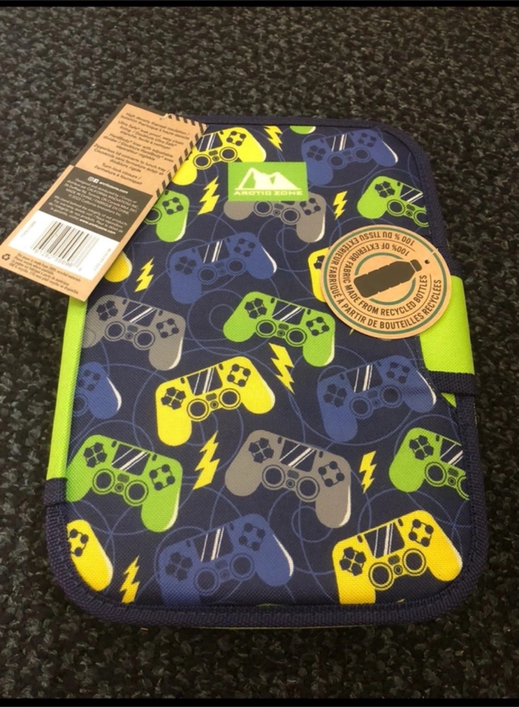 New, zipperless lunch bag. Lime green exterior. Features a fun gamer design. Interior includes a removable tray and divider. Eco-friendly, made from recycled bottles.