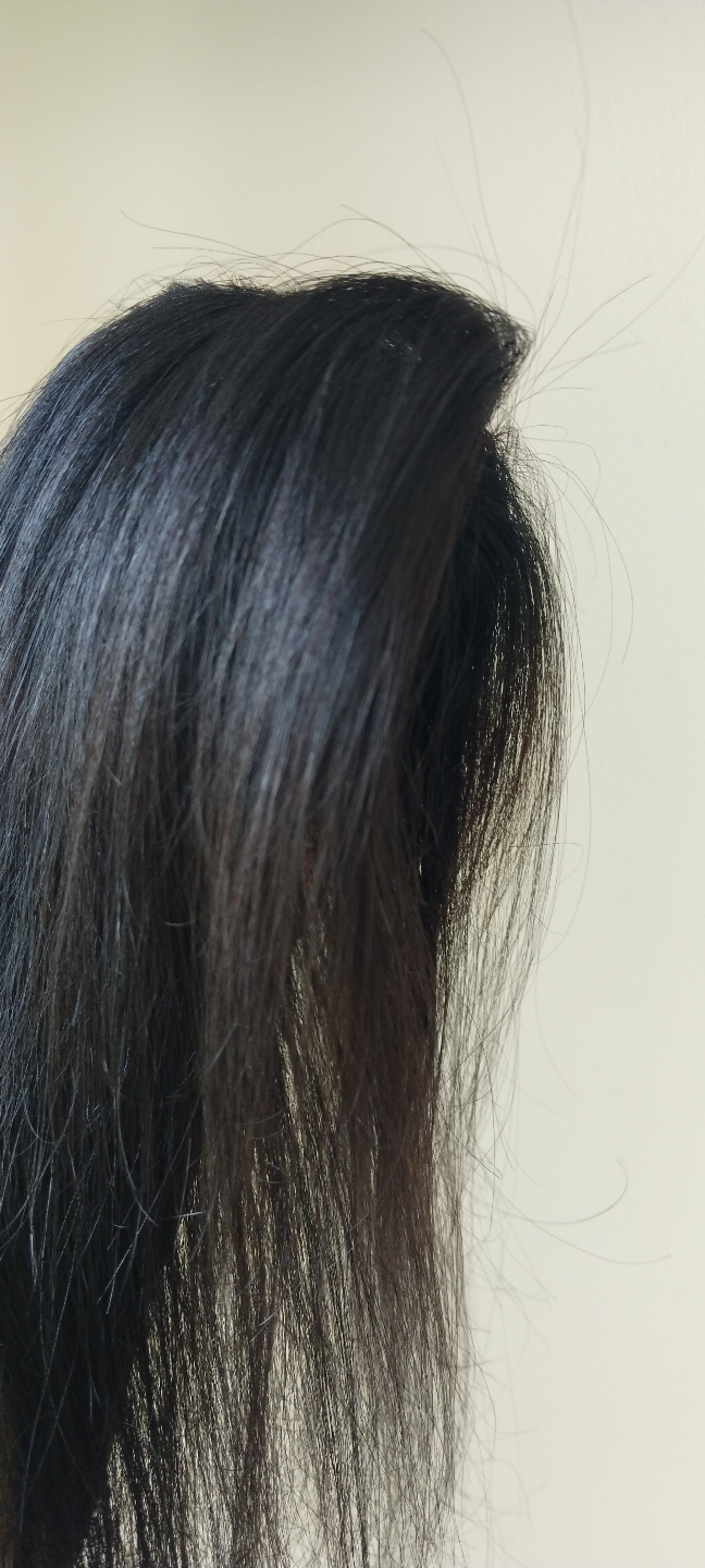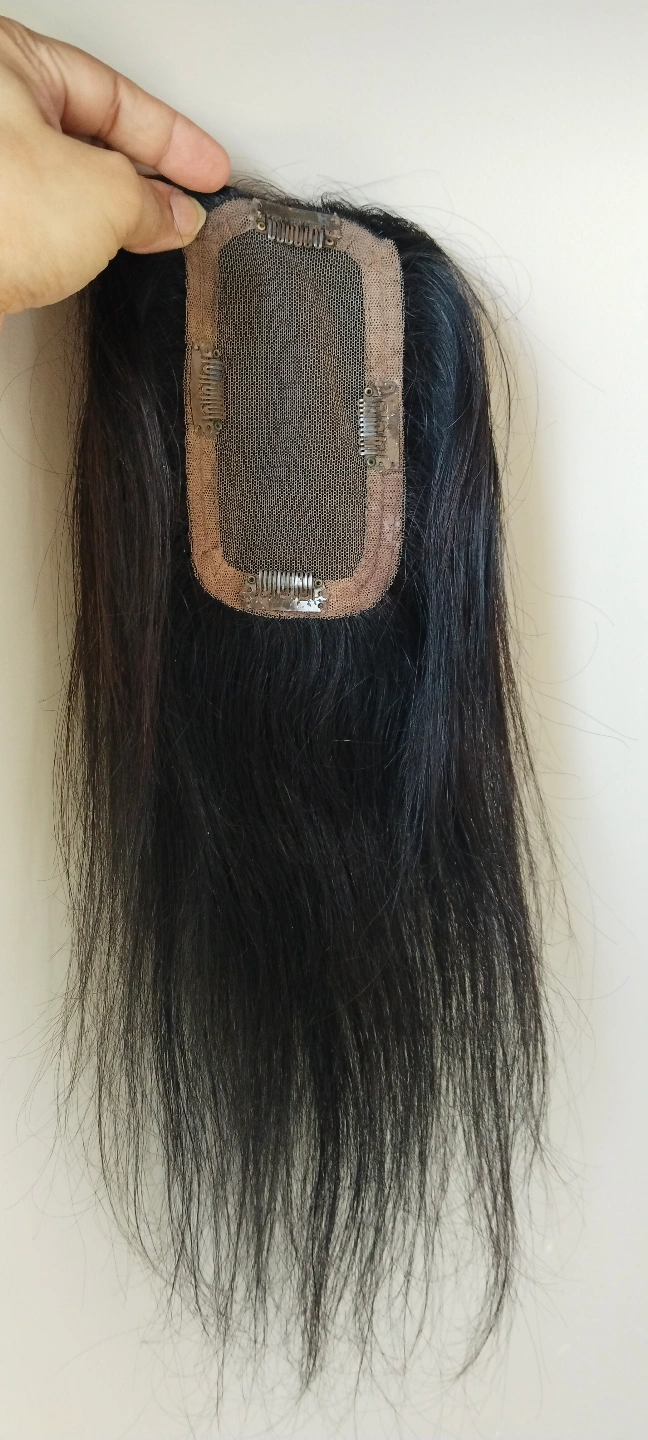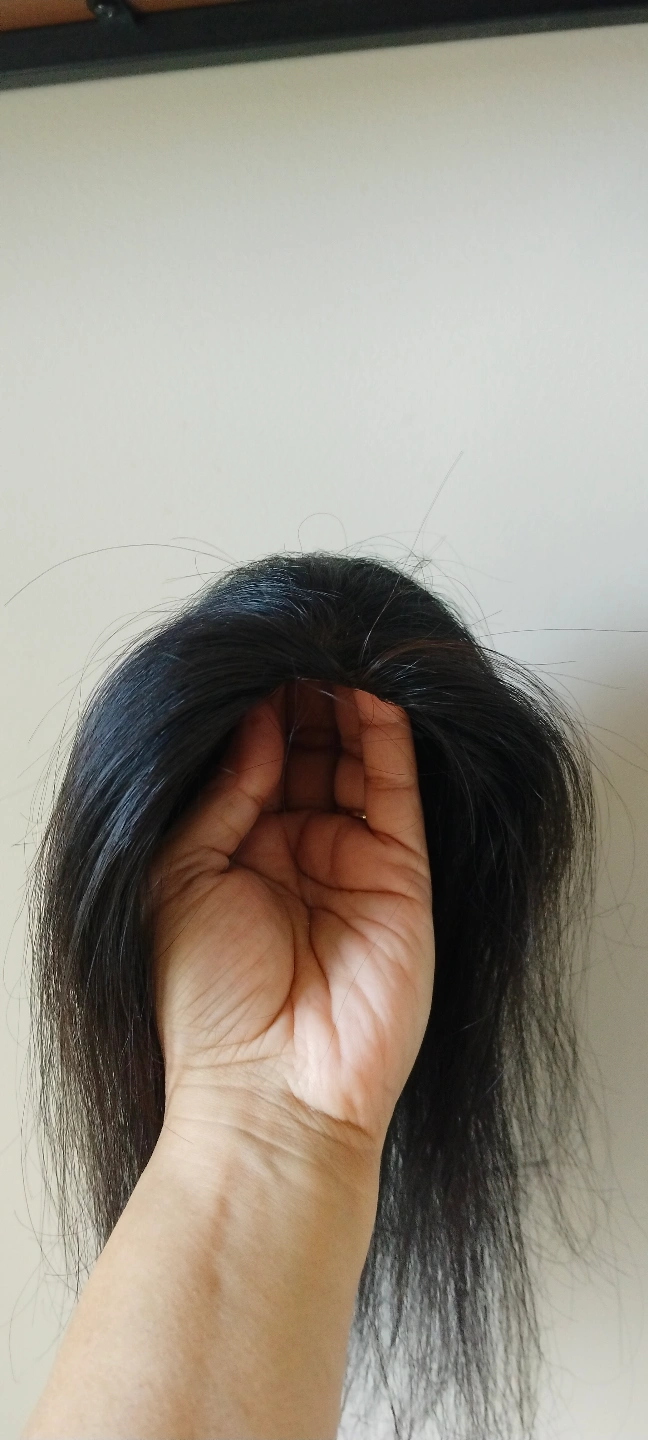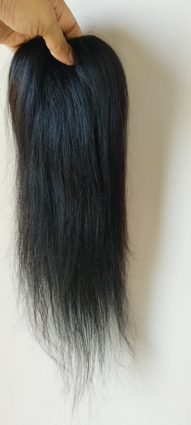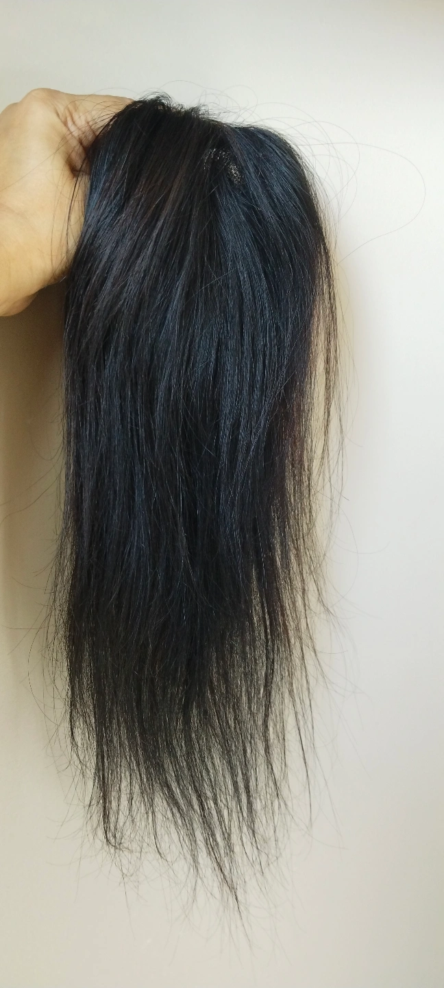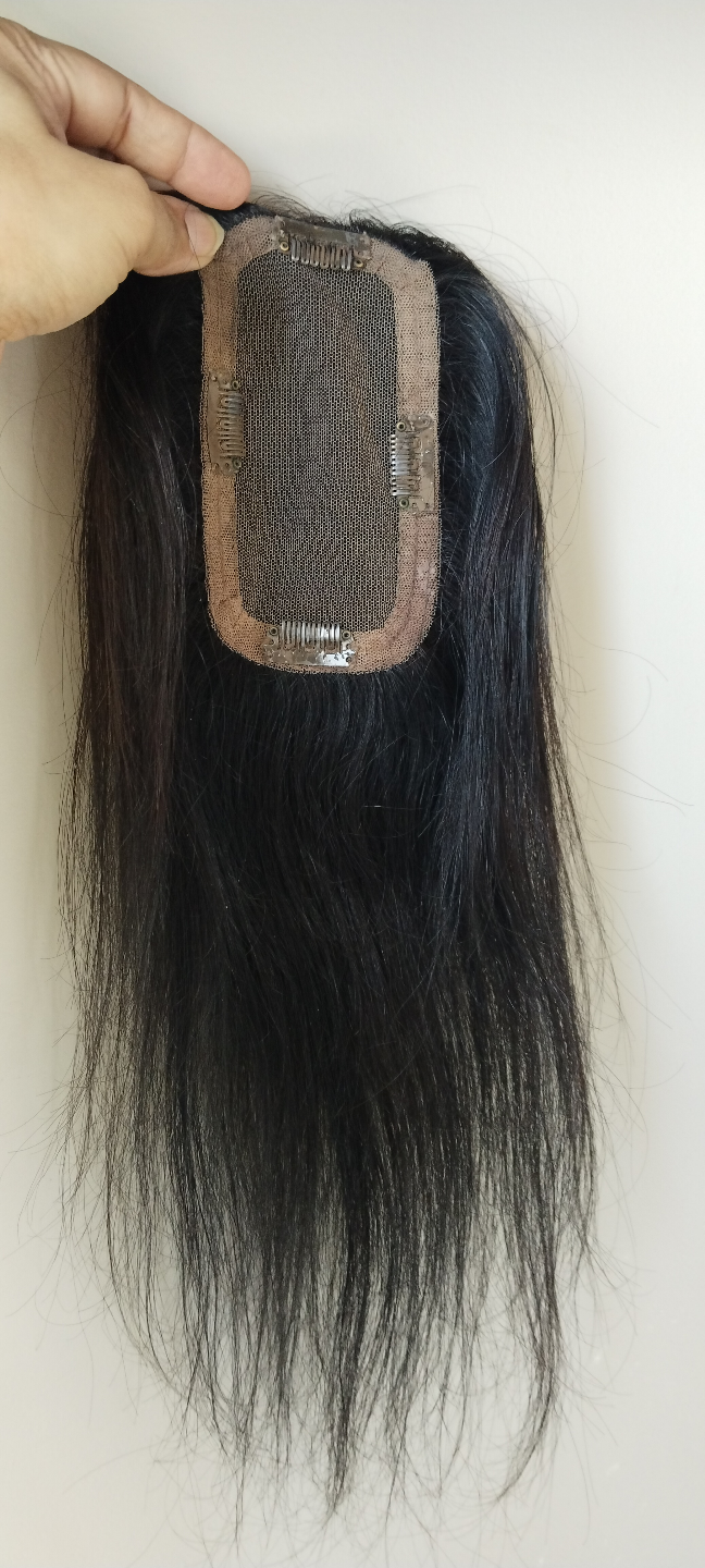 Clip-in hair topper. Natural black colour. Straight hair. Looks relatively unstyled. Suitable for adding volume or covering thinning hair.Women's hair topper, 3*5 extremely light weight lace topper. This Natural Wavy Lace Hair Topper is a 3” by 5” 16 inch soft transparent skin color lace based extension. It is expertly hand tied hair piece made of Remy pure human hair. The topper when worn at the hair line covers the entire crown and hairline giving a flawless natural look. It is light weight and clips in quickly and easily for all-day comfort.