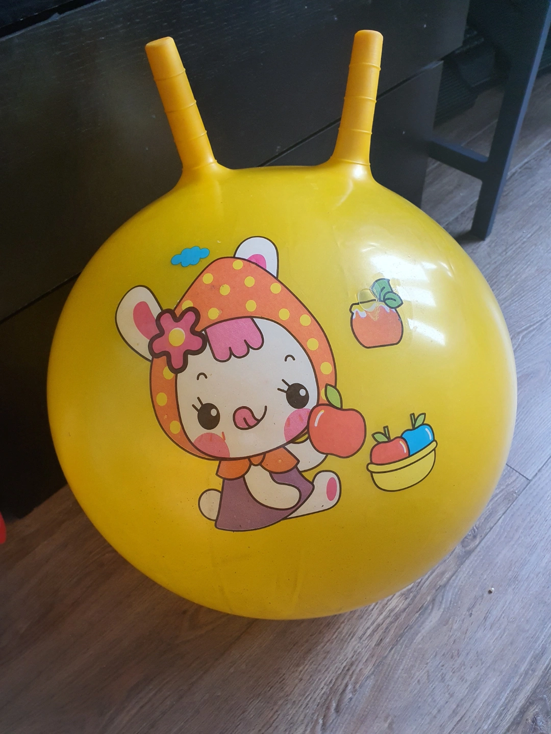 Fun kids hopping ball. Features a cute bunny and fruit design. Yellow plastic. Two handles.