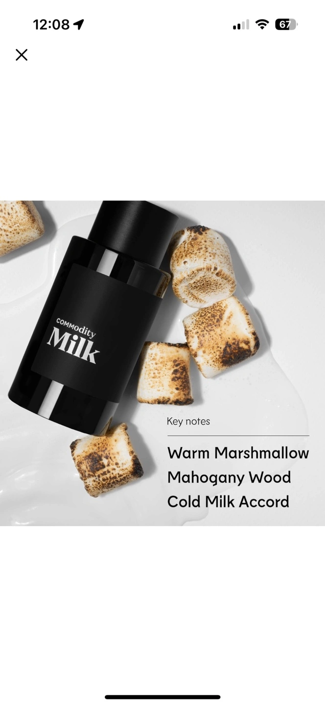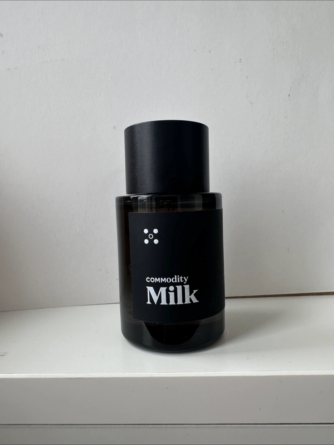 30ml bottle of Commodity Milk Eau de Parfum. Warm marshmallow, mahogany wood, and cold milk accord. Sprayed once.