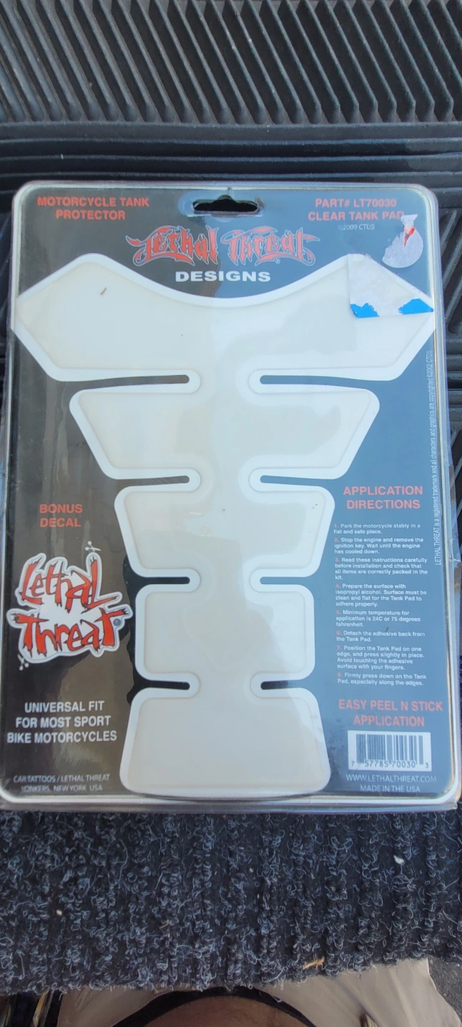 Universal fit for most sport motorcycles. Clear tank pad with bonus decal. Easy peel and stick application. New, in package.