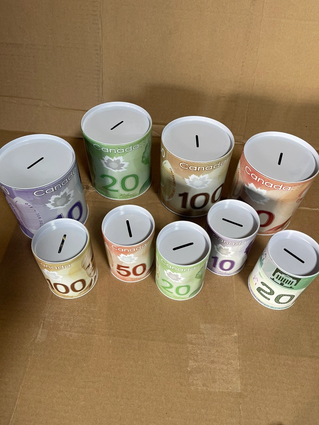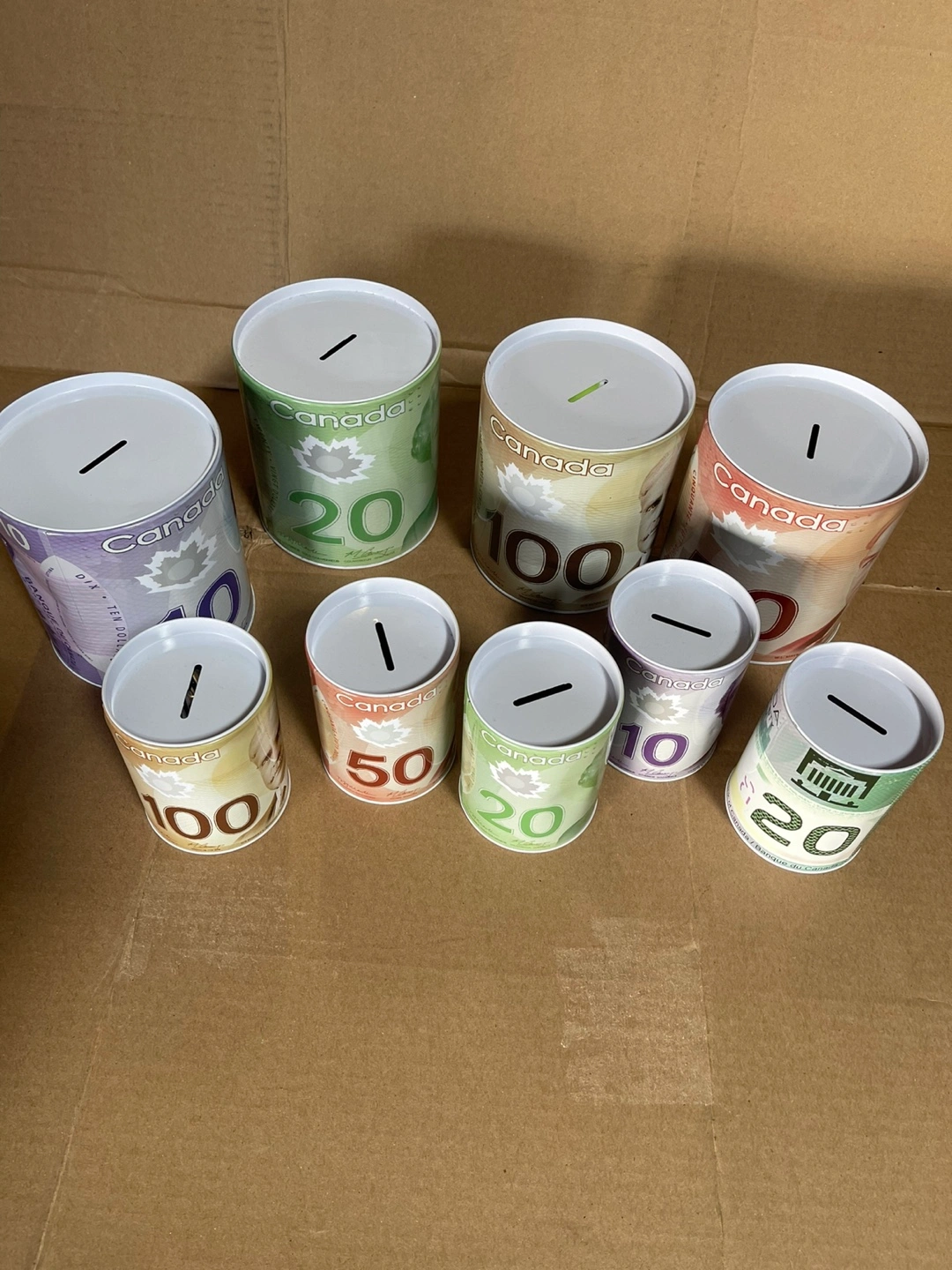 Set of eight Canadian money design piggy banks. Various denominations. Metal construction. Great for kids or collectors.