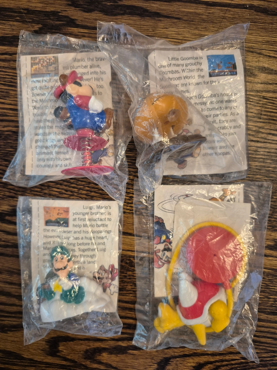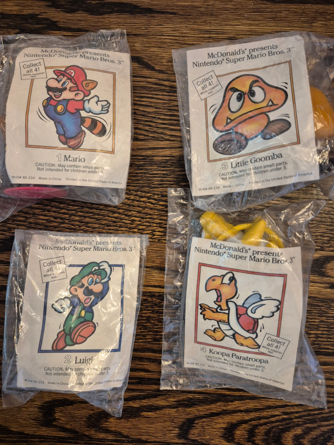 461989 Four vintage McDonald's Super Mario Bros 3 Happy Meal toys. Mario, Luigi, Little Goomba, and Koopa Paratroopa. Sealed New Individually packaged. Collectible items.