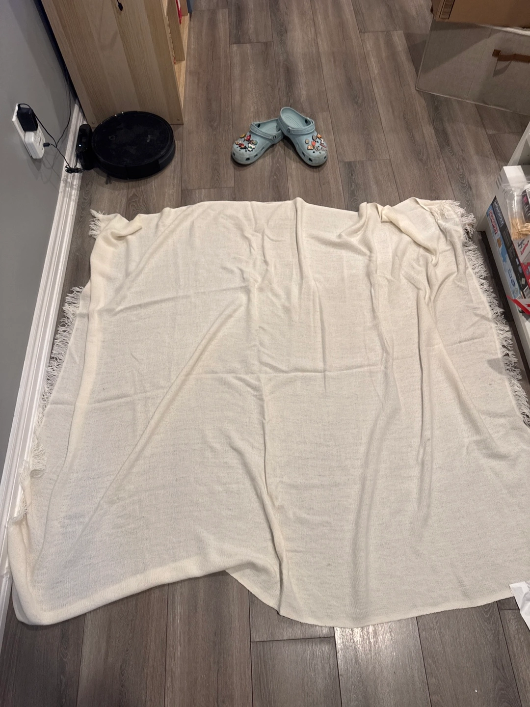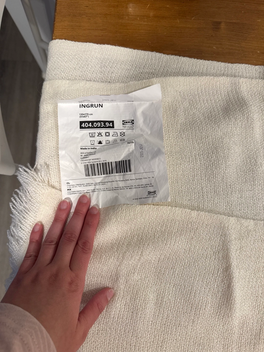 Cream-coloured throw blanket. Soft texture. Frayed edges. Lightweight. Good condition. Good for covering the sofa or for decoration.