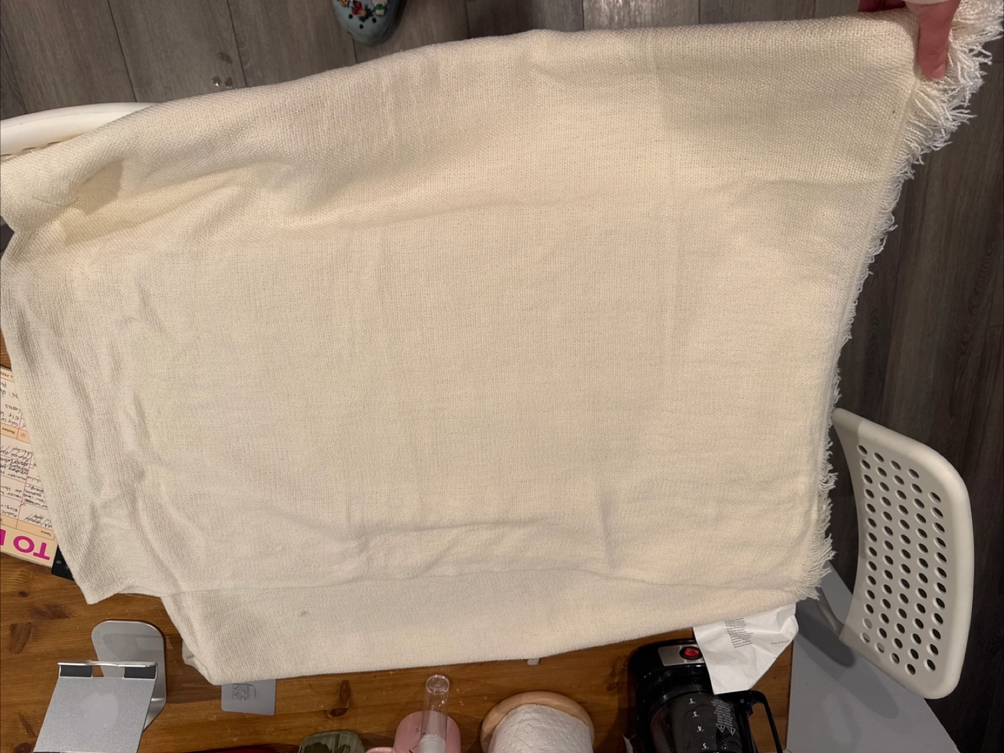Cream-coloured throw blanket. Soft texture. Frayed edges. Lightweight. Good condition. Good for covering the sofa or for decoration.