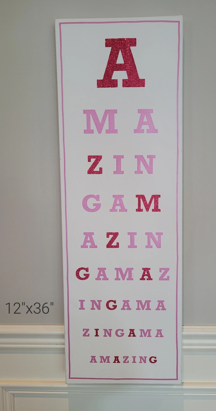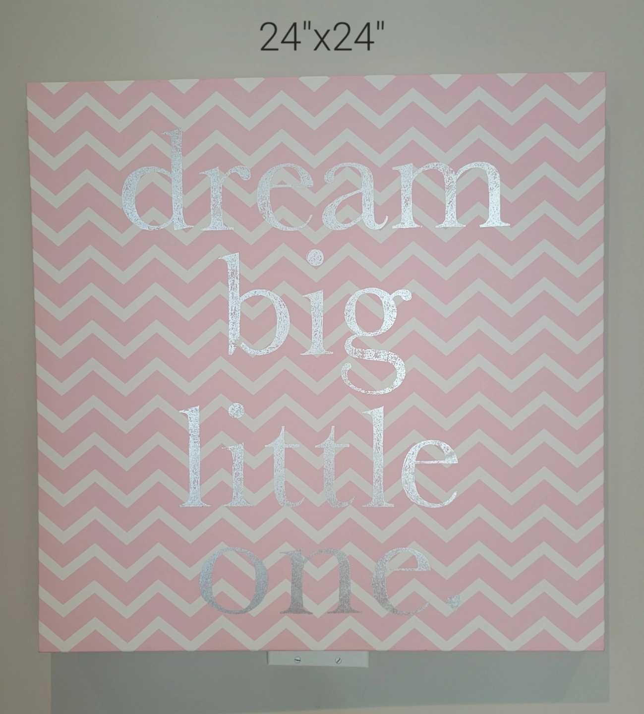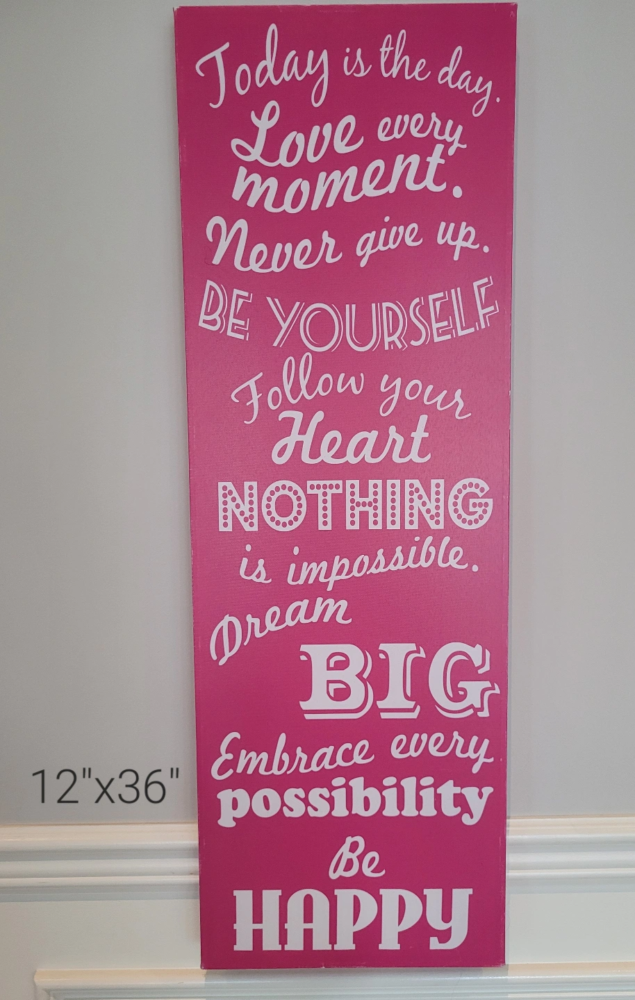 Four canvas prints, pink and white colour scheme. Various inspirational messages and designs. Sizes vary; 20"x24", 24"x24", 12"x36", 12"x36". Great for girls' bedroom or playroom.