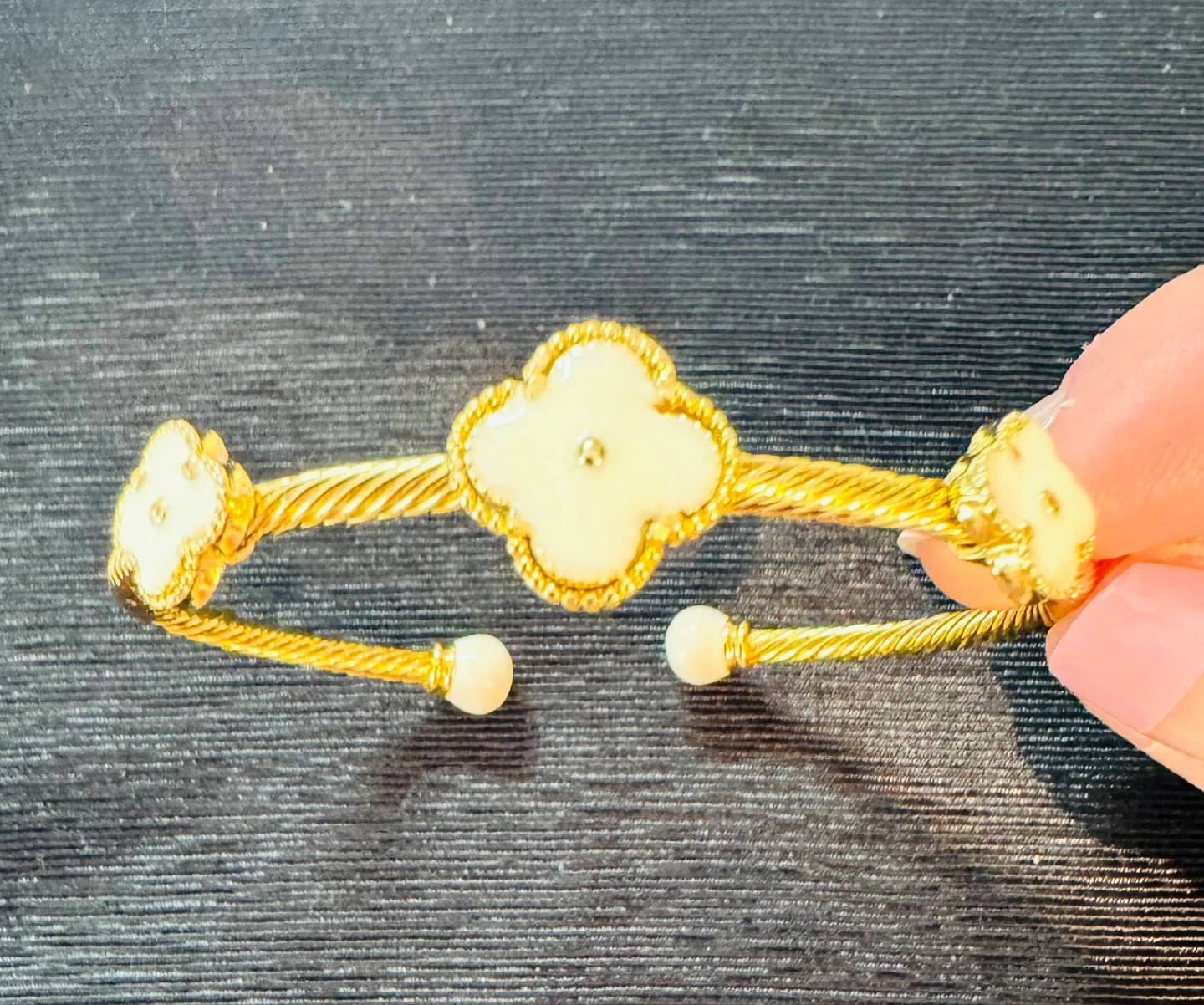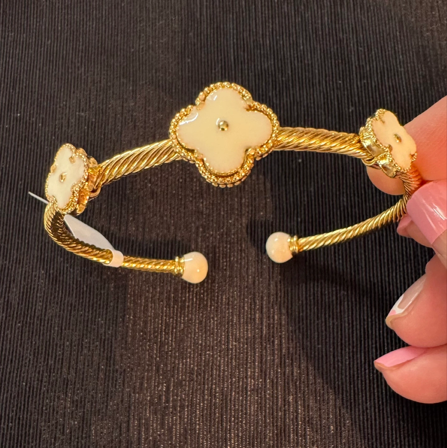 14K Plated 3 Clover Twist Cable Rope Bangle adjustable & Ivory Enameled.