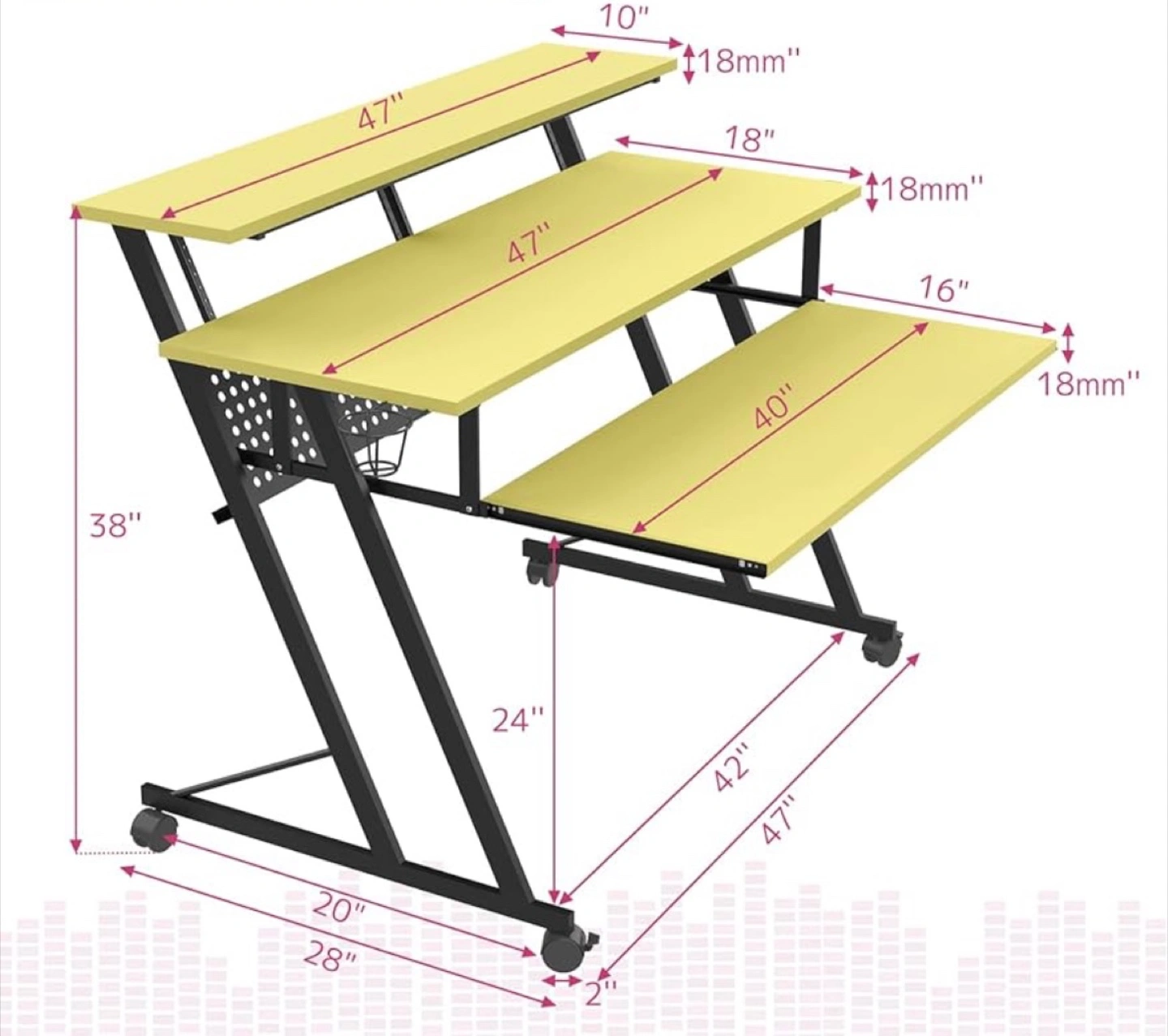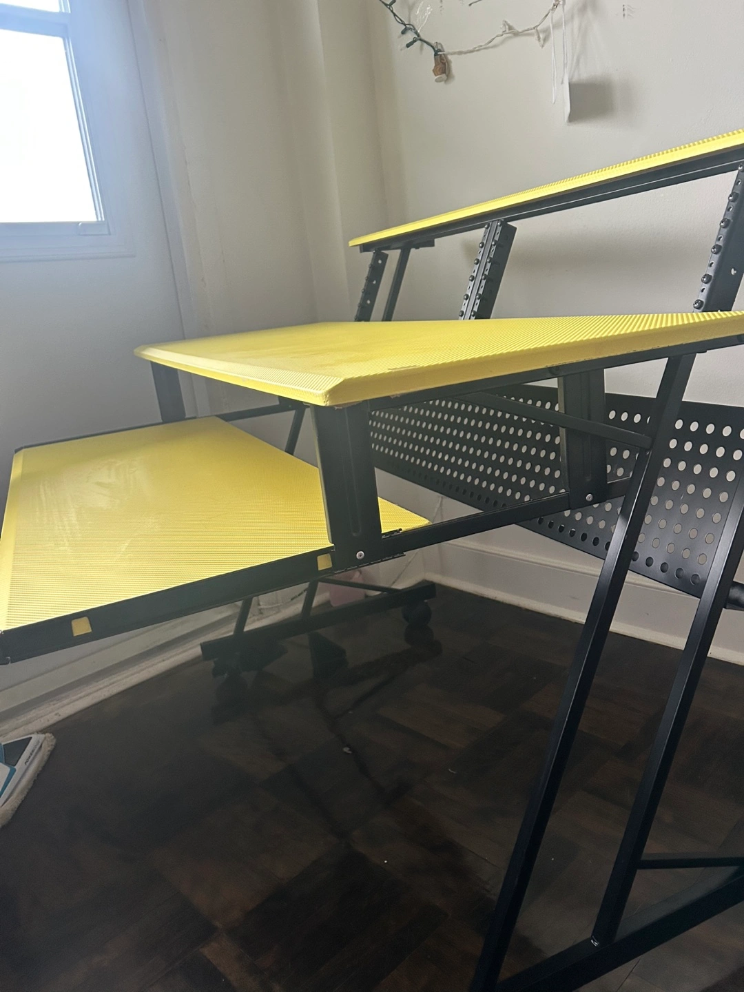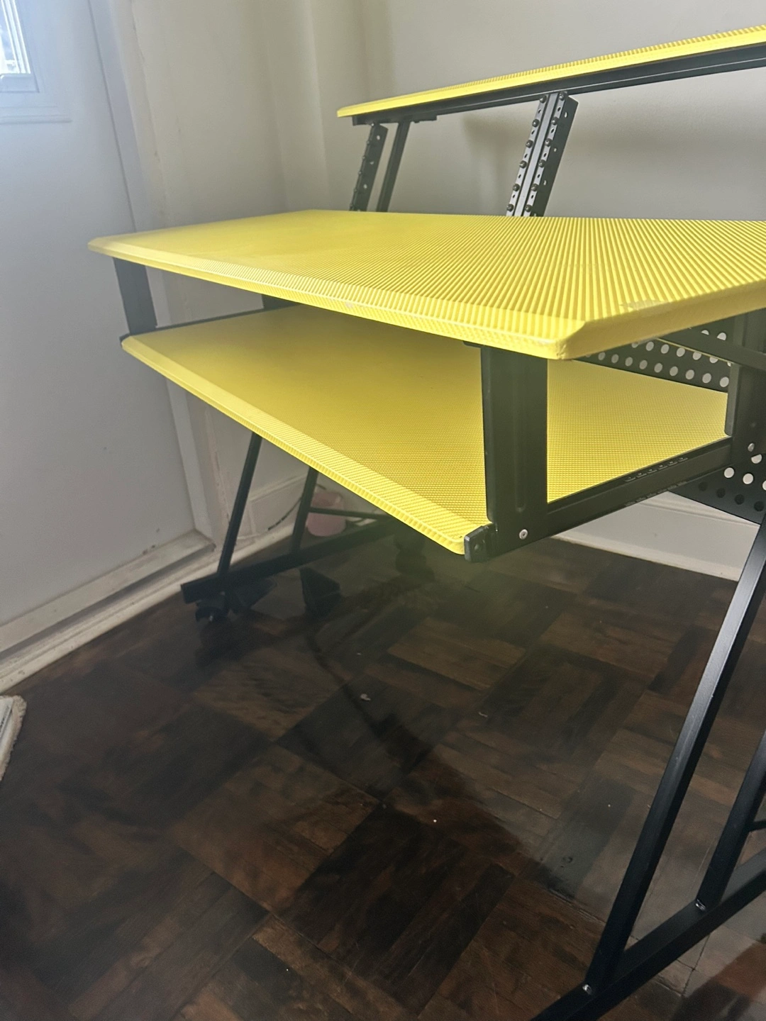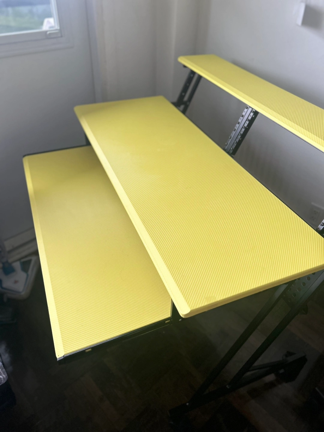 Three-tiered DJ setup. Black metal frame. Yellow textured surface. Adjustable height. Lots of rack space. Great for home studios or mobile DJs.