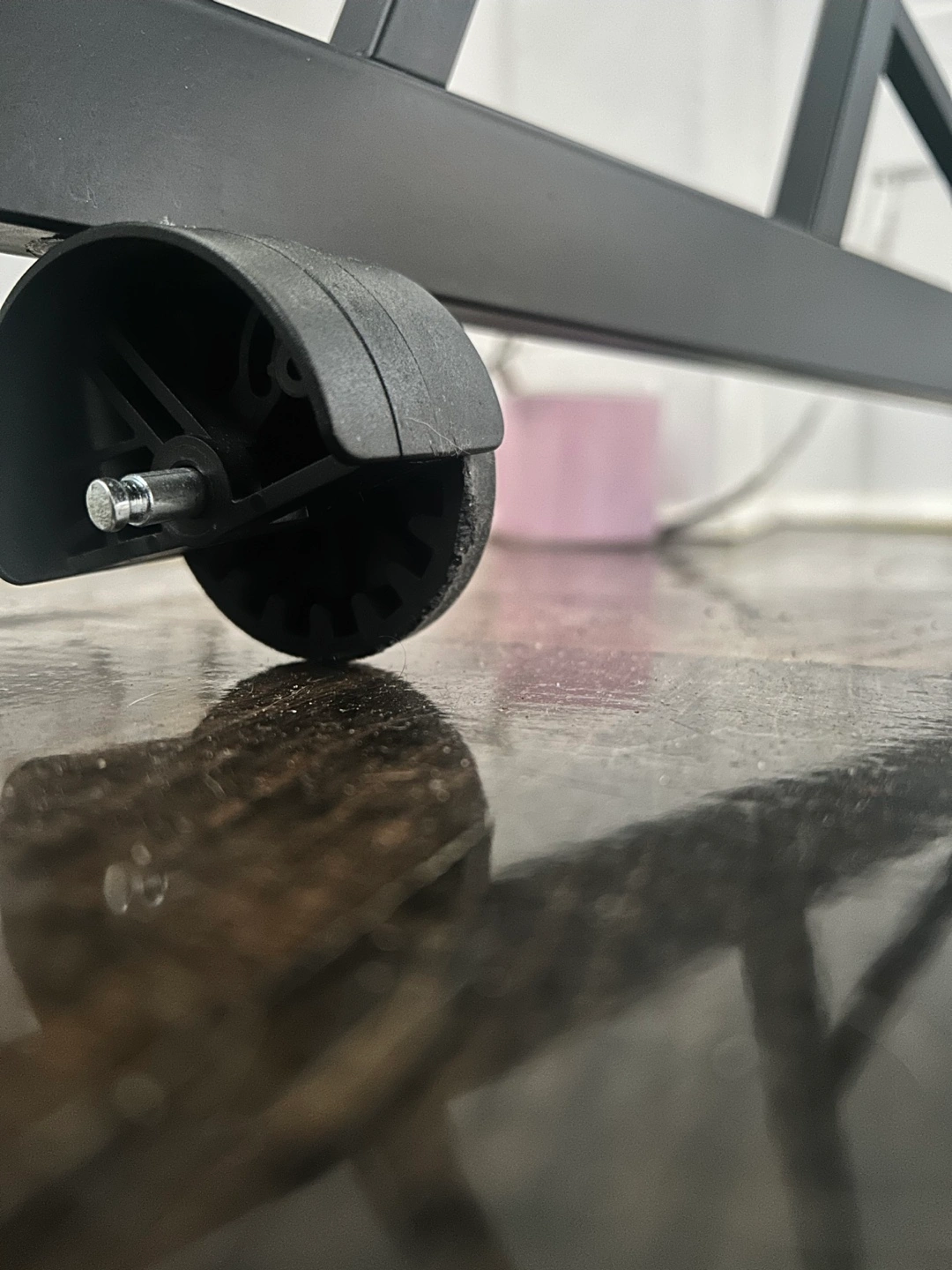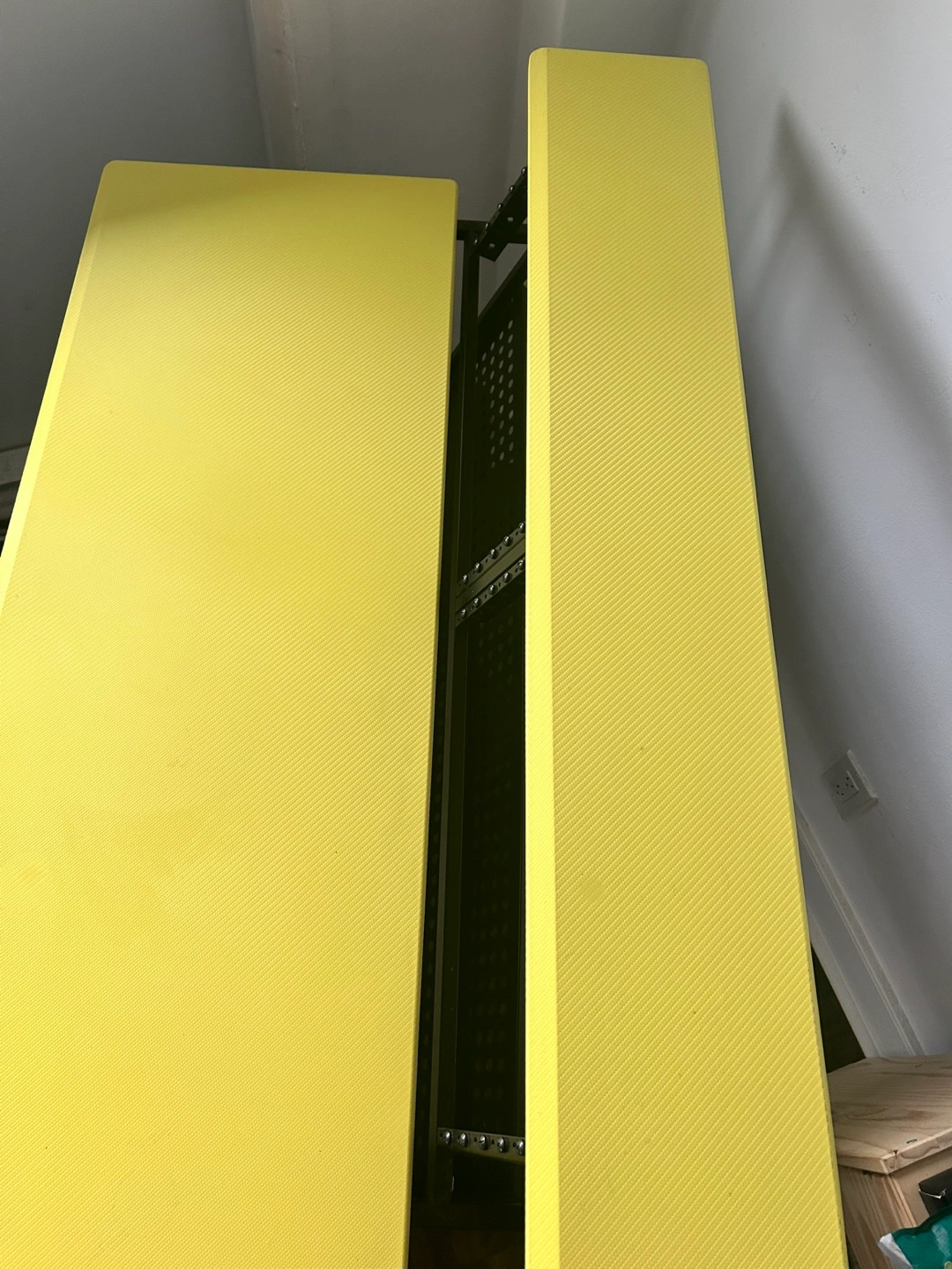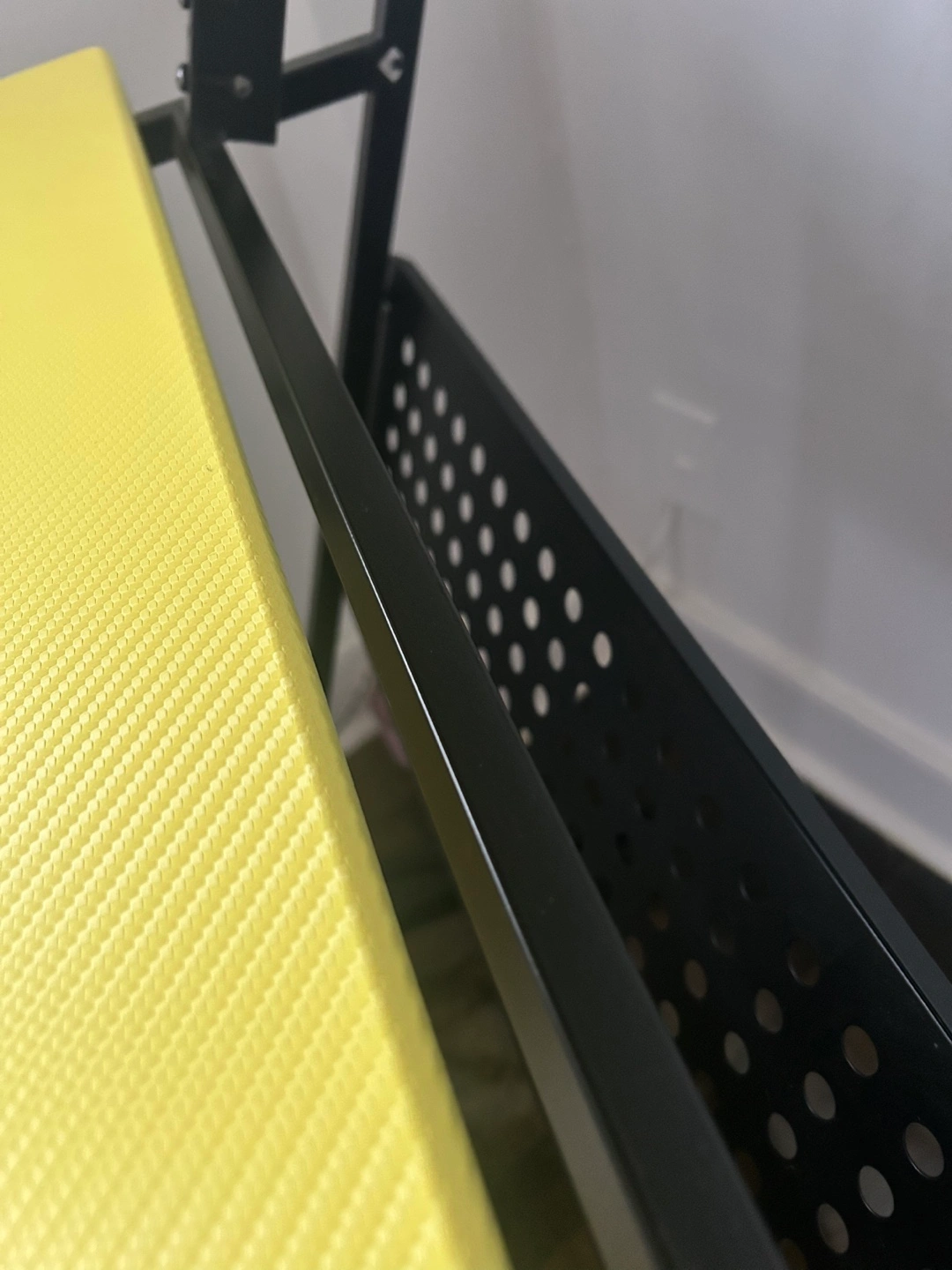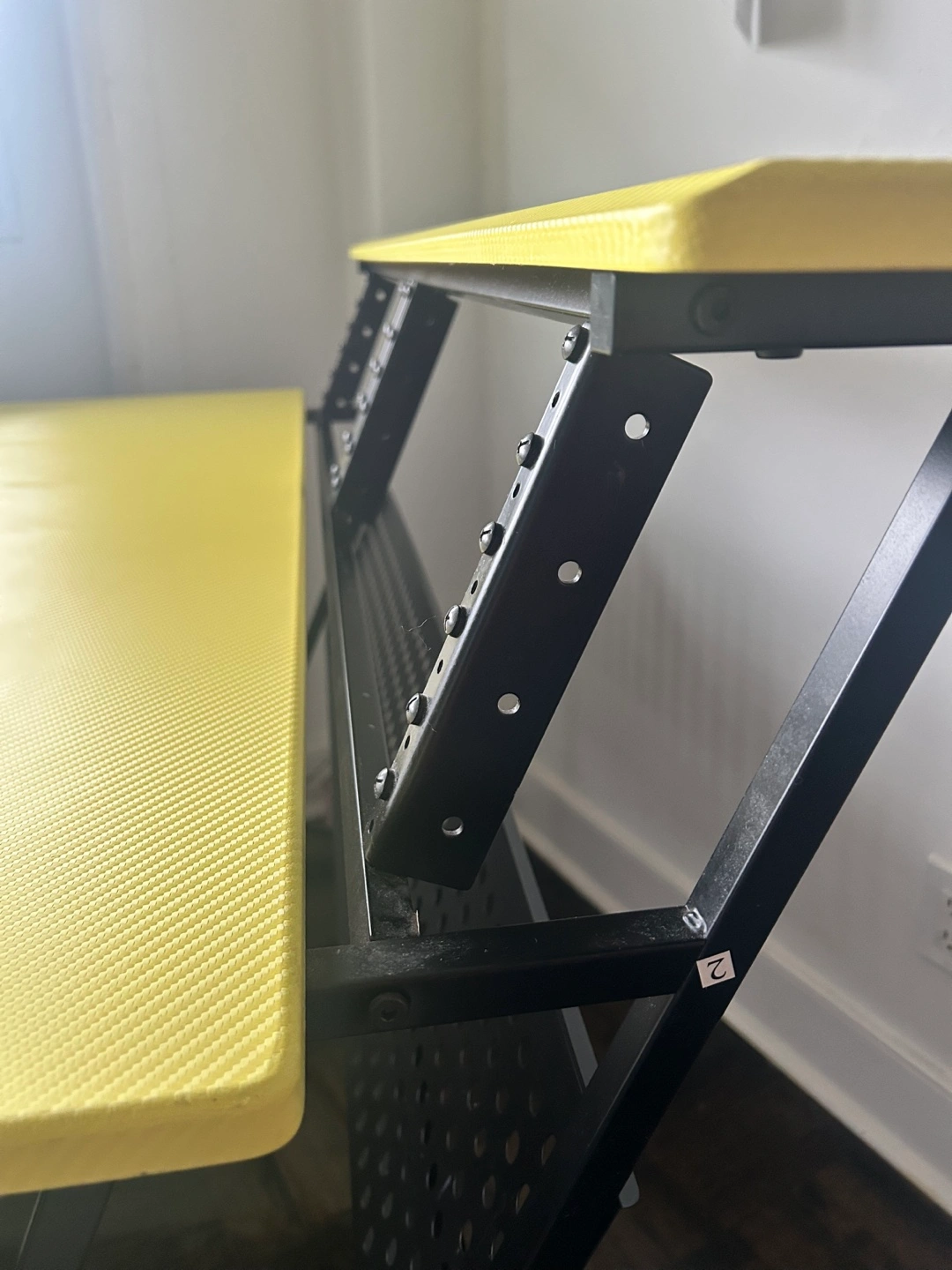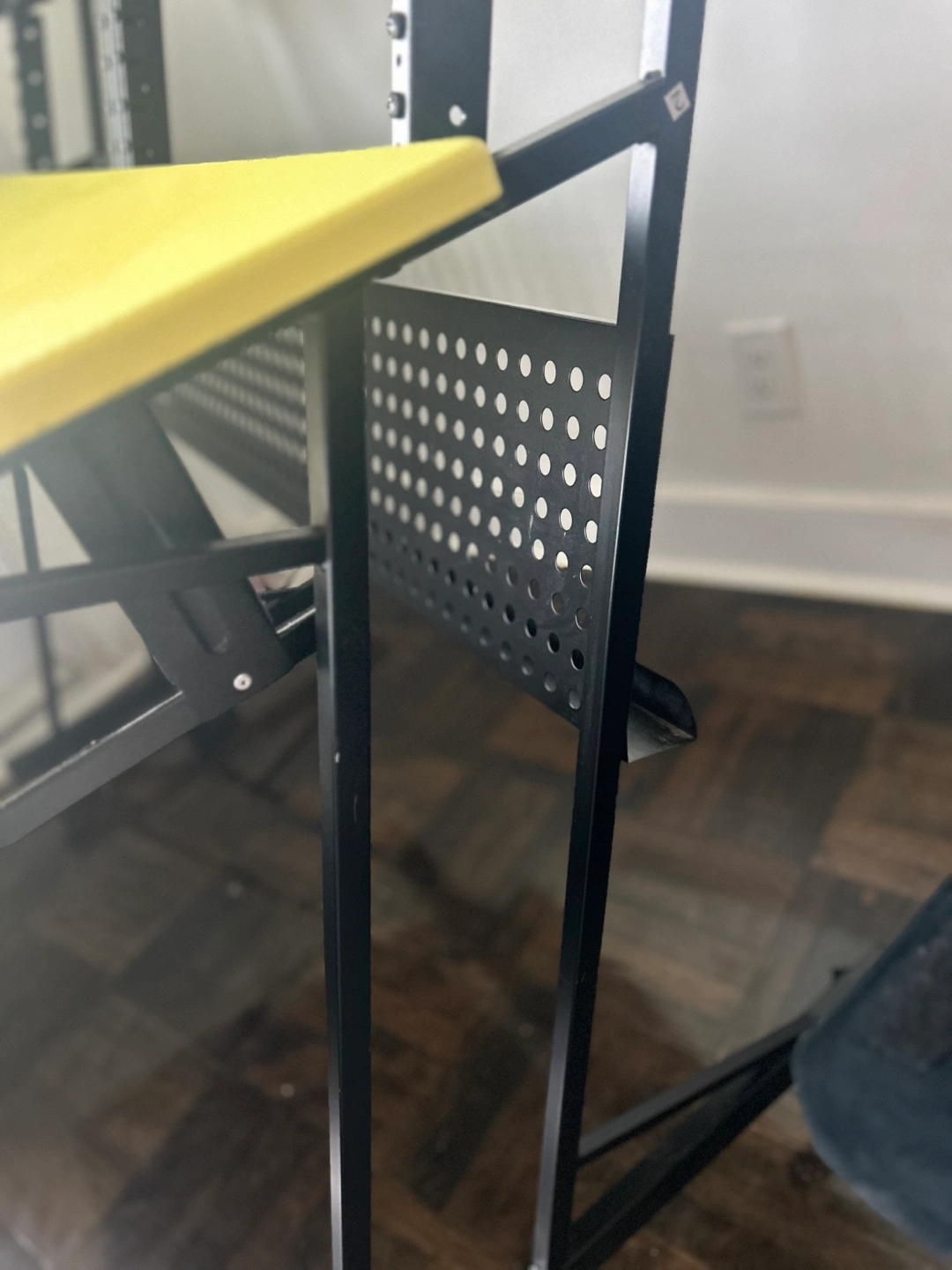 Three-tiered DJ setup. Black metal frame. Yellow textured surface. Adjustable height. Lots of rack space. Great for home studios or mobile DJs.