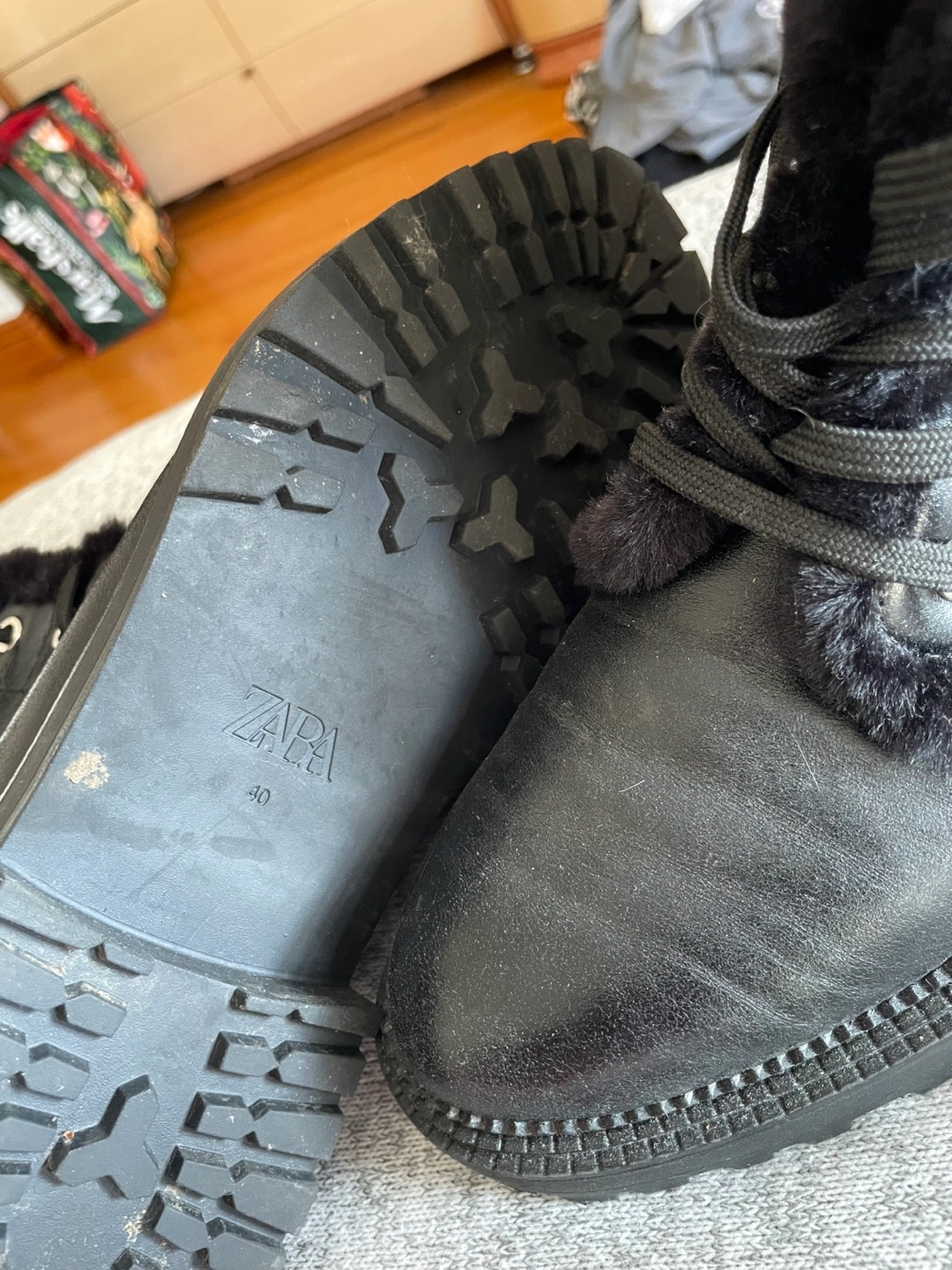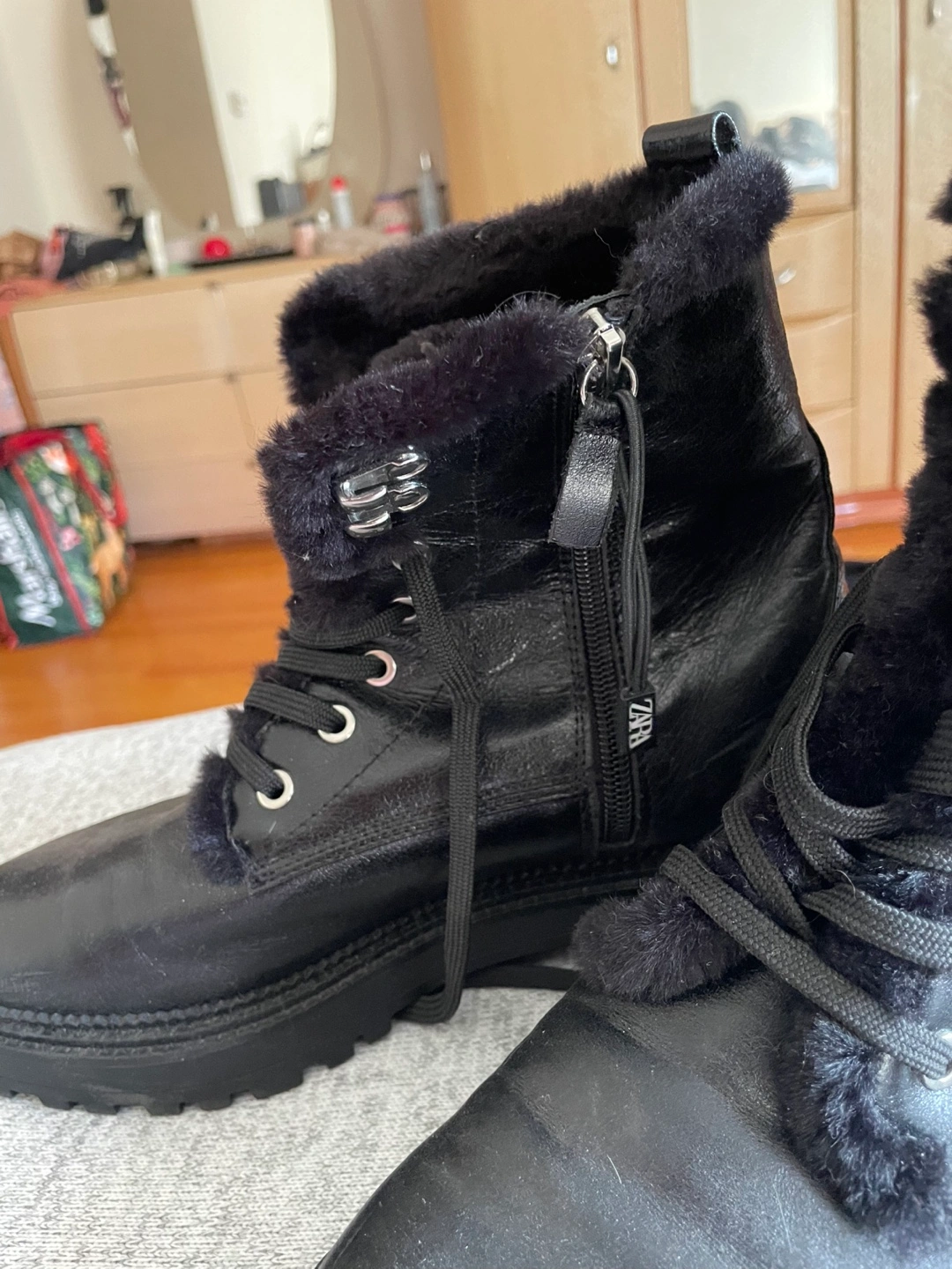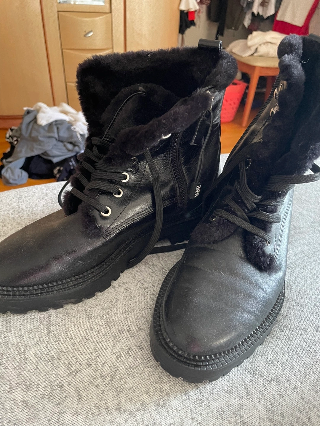 Women's black leather boots. Lace-up closure. Fur trim around the top. Side zipper. Chunky sole. Size 40.