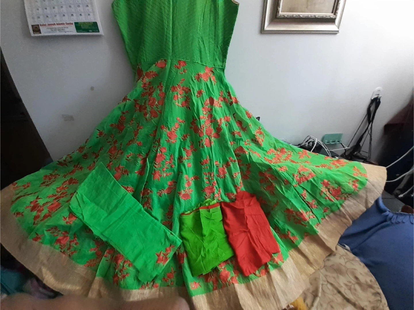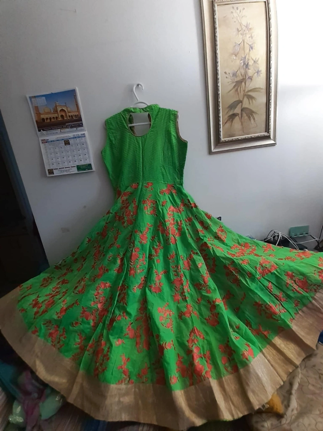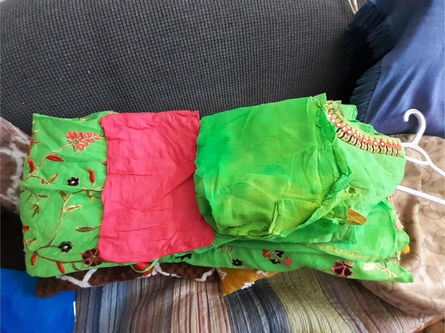 Beautiful lime green Anarkali suit. Features long sleeves, embroidered detailing, and a matching dupatta. Includes a red inner lining. Elegant and stylish.each $65 pick it up Markham and Lawrence