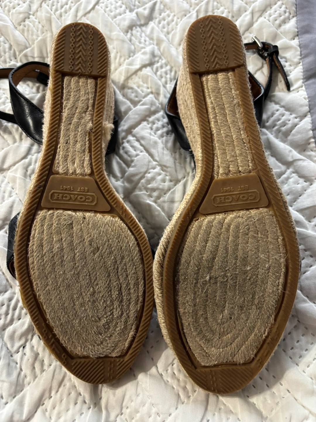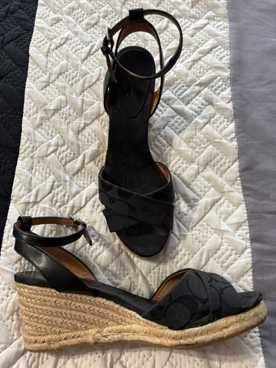 Women's black wedge sandals. Ankle strap closure. Floral pattern fabric upper. Espadrille wedge.