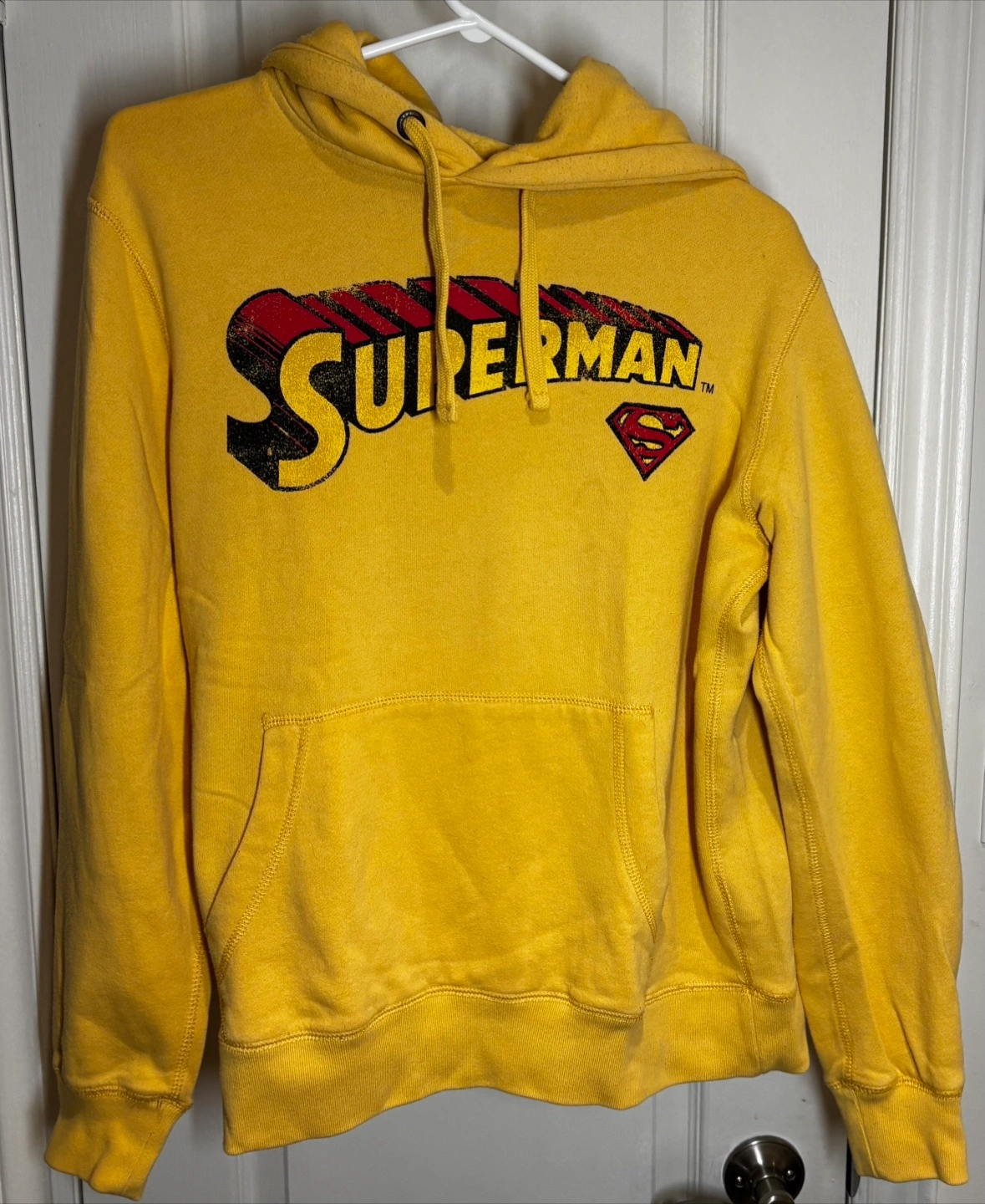 Men's medium mustard yellow Superman hoodie. Features a vintage-style Superman logo on the front. Long sleeves, kangaroo pocket, drawstring hood.