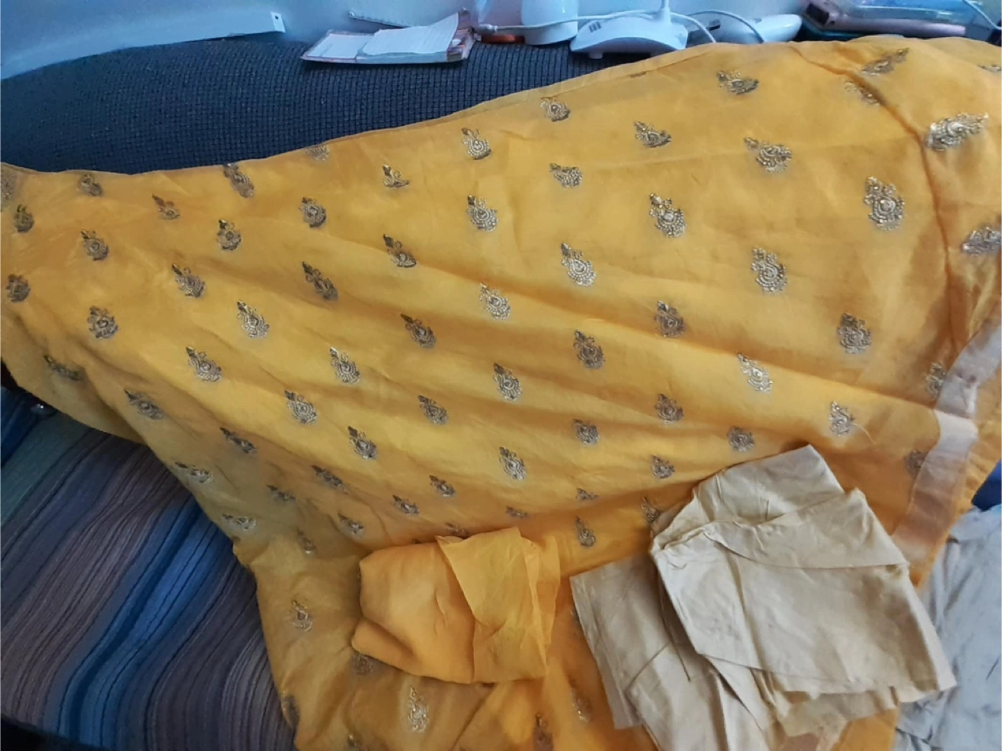 Beautiful mustard yellow Anarkali suit. Features gold embroidery. Includes a matching dupatta and churidar. Elegant and festive wear free size $70 pick up Markham and Lawrence.