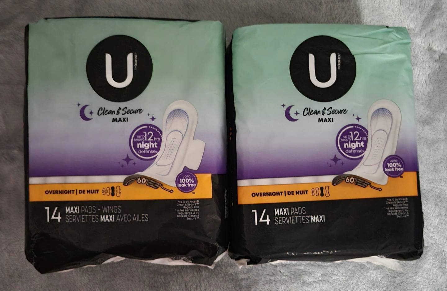 Two unopened packs of U by Kotex Clean & Secure Maxi Overnight Pads. 14 pads per pack, with wings. 12-hour overnight protection. 100% leak-free.