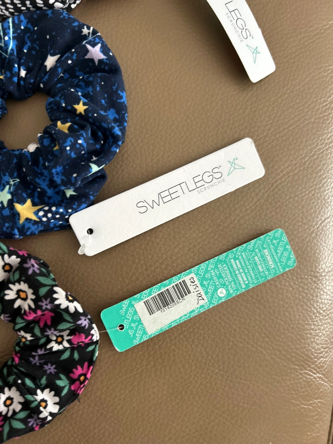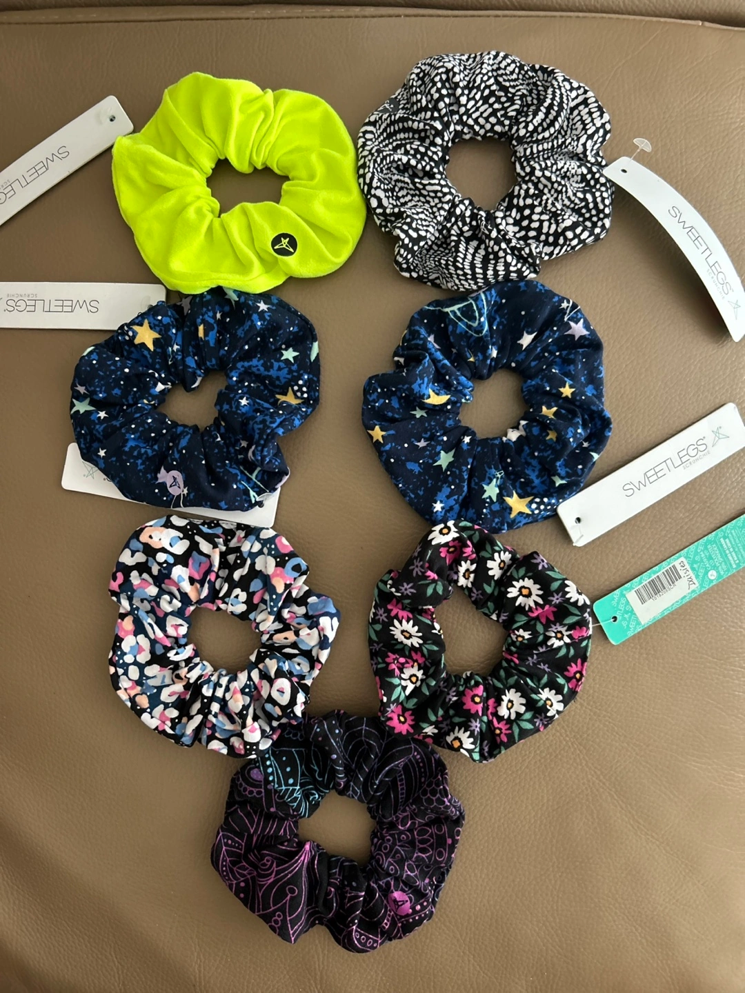 Sweetlegs scrunchies. Various colours and patterns. Soft and stretchy fabric with elastic. Great for hair or bracelets