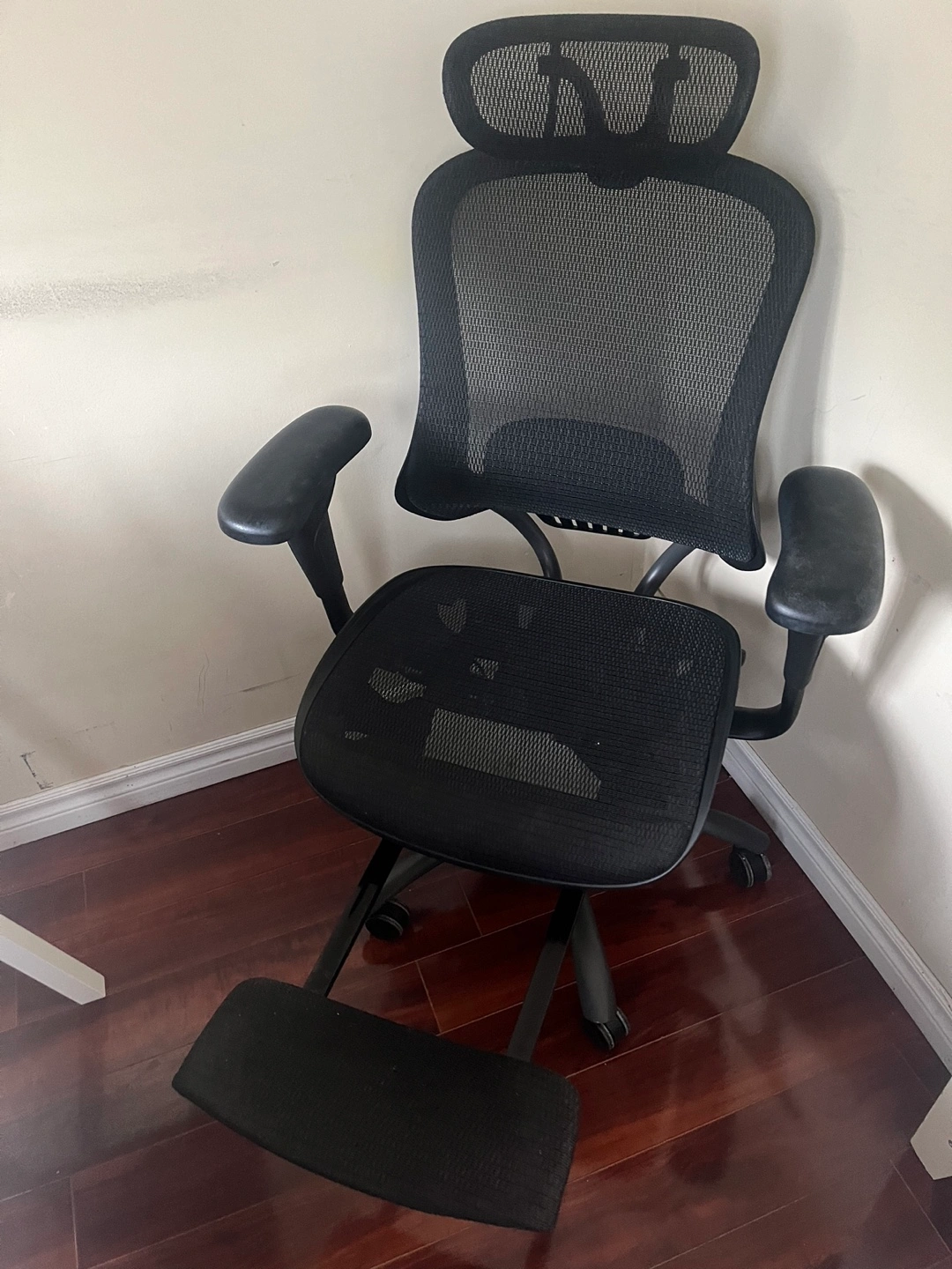 Black mesh ergonomic office chair. Features adjustable headrest and footrest. Good for home or office use.