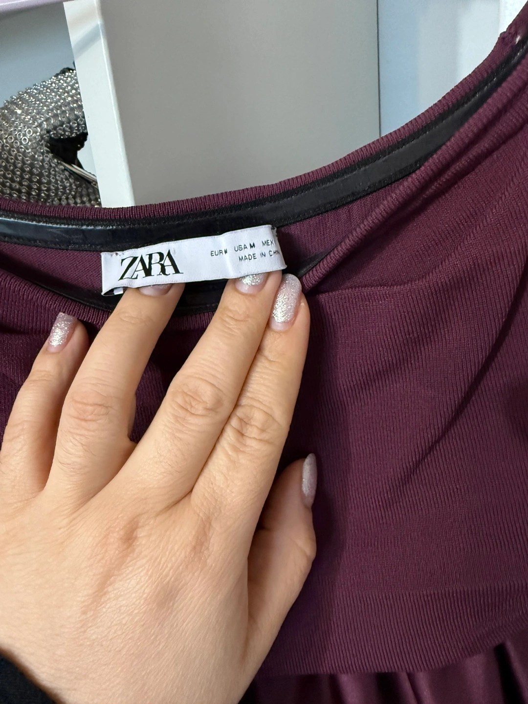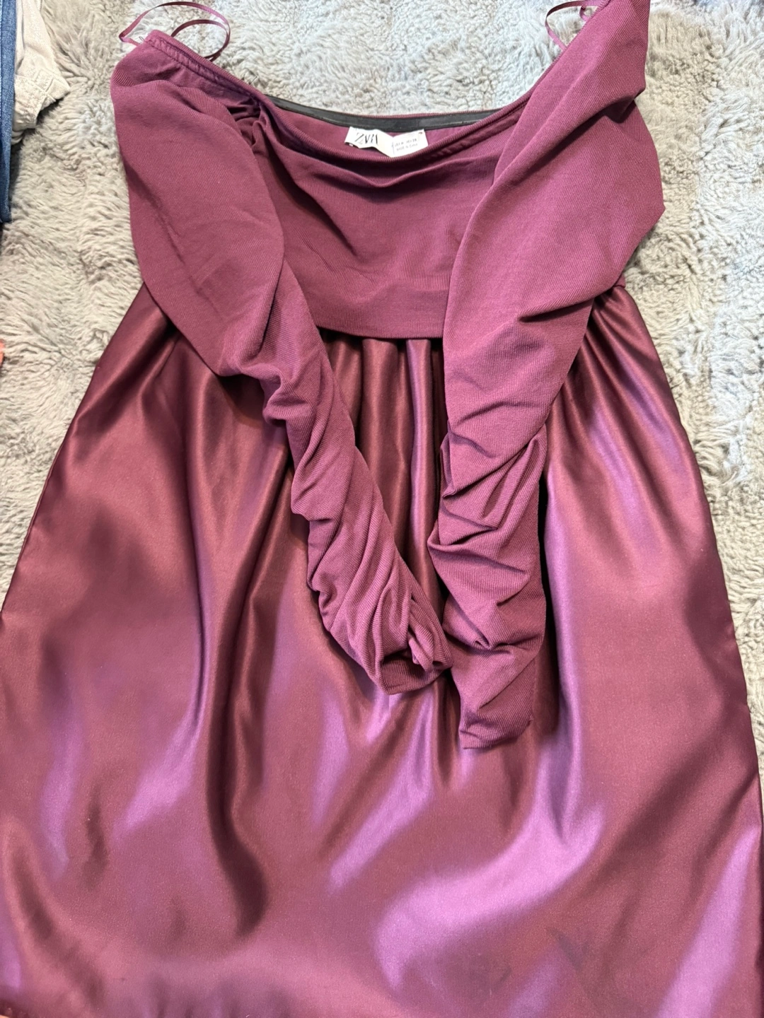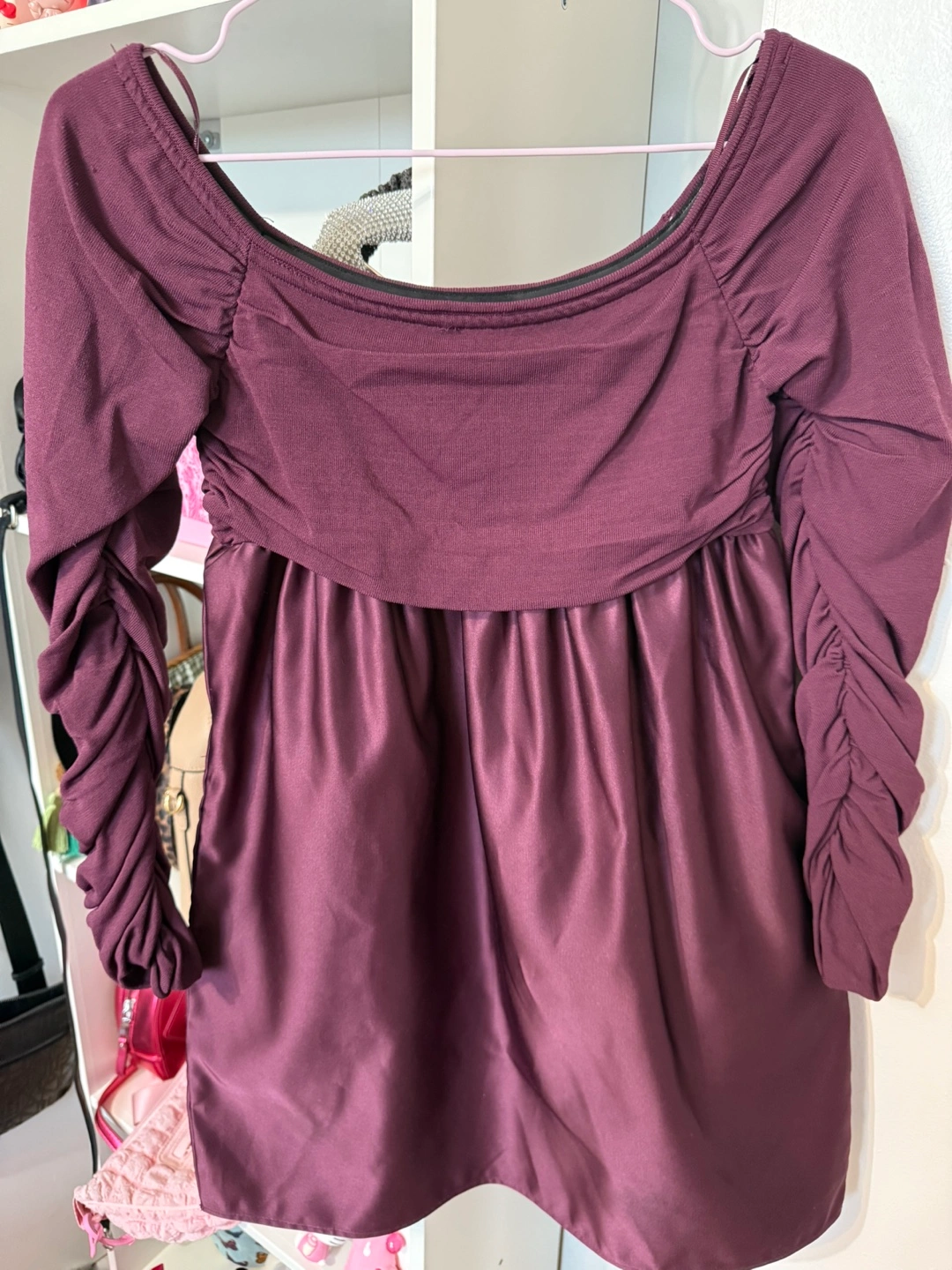 Gorgeous burgundy mini dress. Features long sleeves, off-the-shoulder neckline, and a satin-like skirt. Size medium.